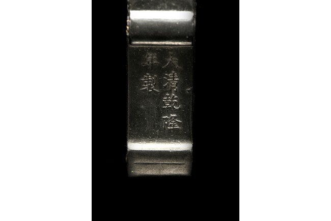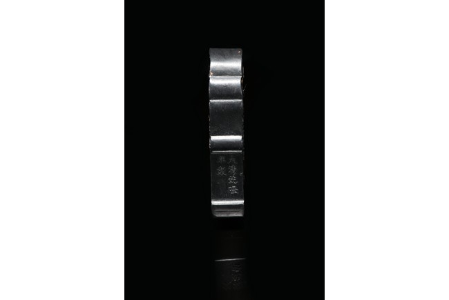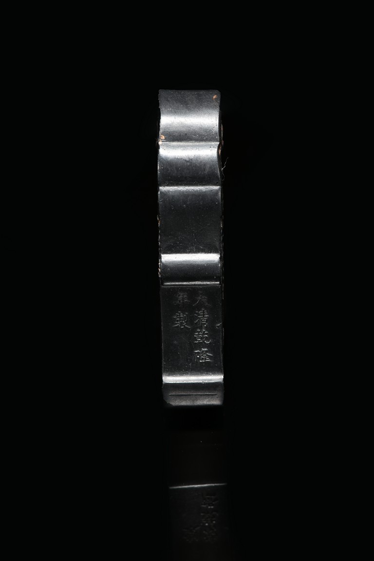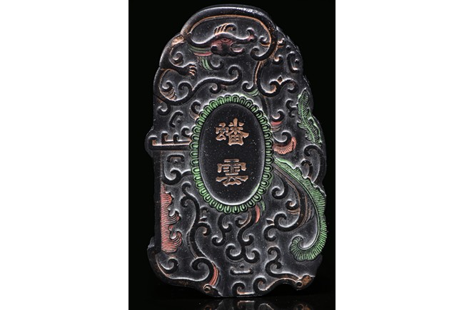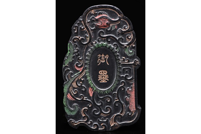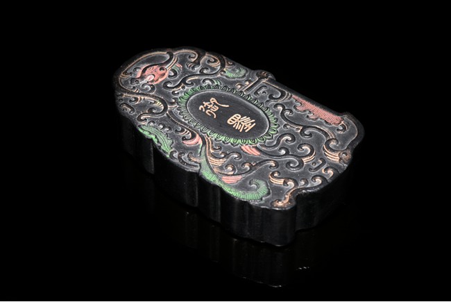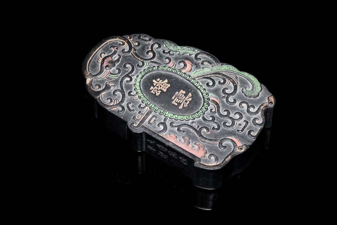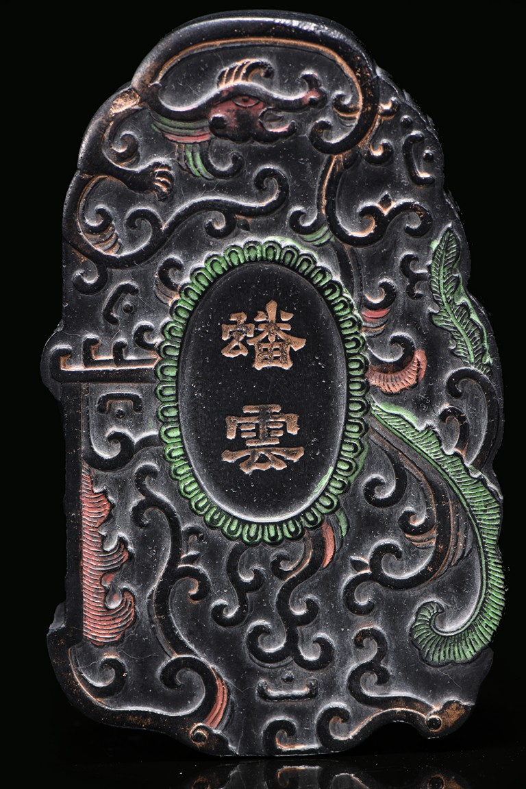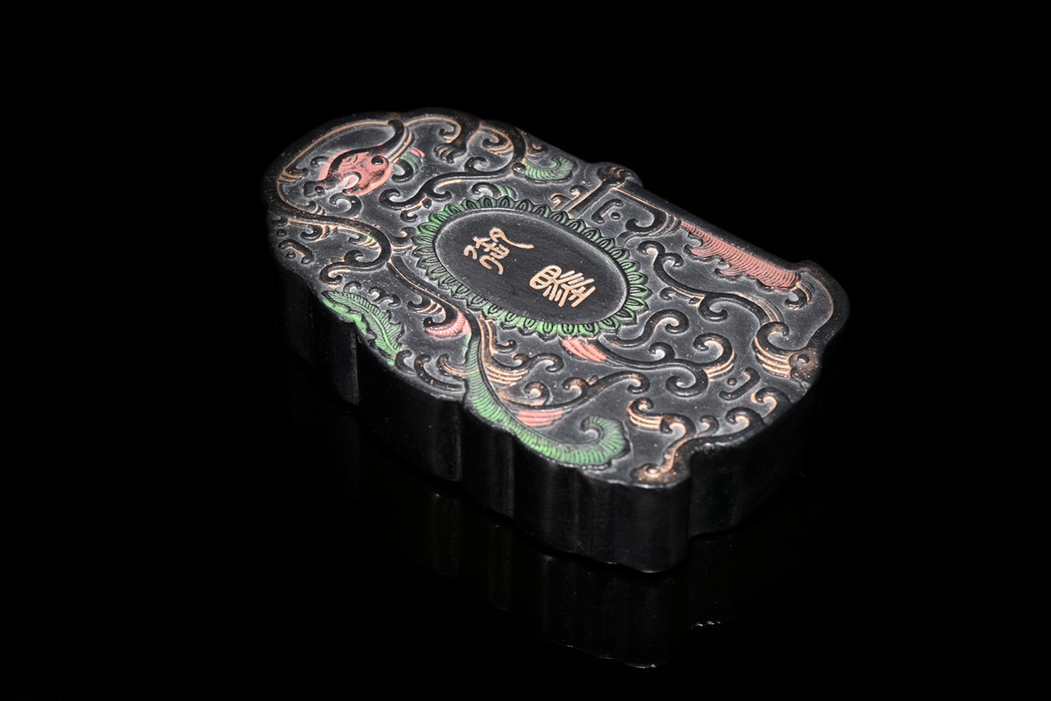 Parcel gilt and with red and green pigments, the black ink of shaped irregular form, finely moulded in shallow relief to front and reverse side with scrolled chilong surrounding an ovoid panel to the center with two character 'YU MO', the reverse with two character 'Pan Yun'. Qing Dynasty period.