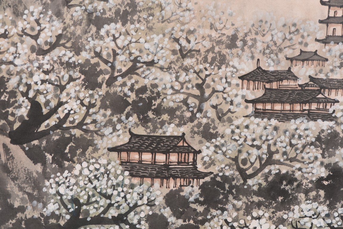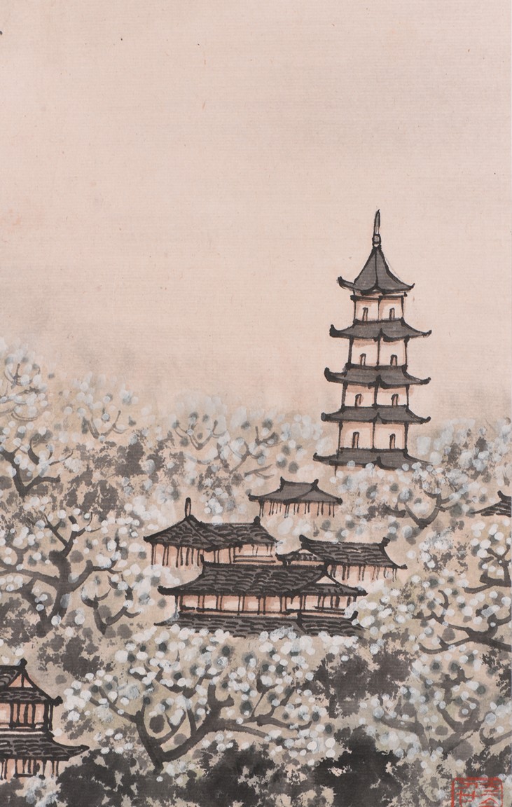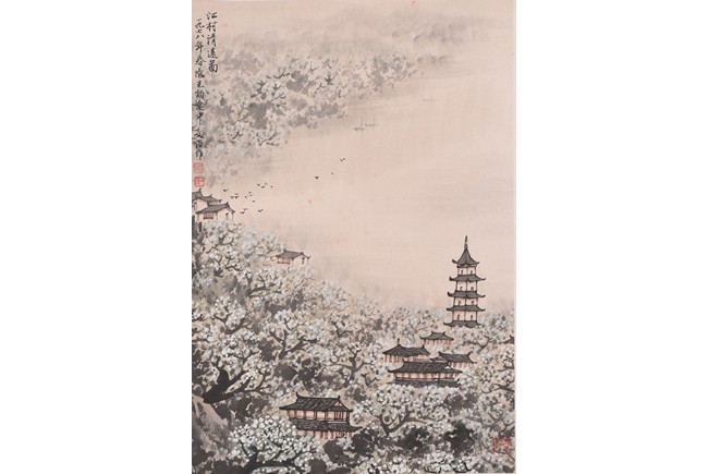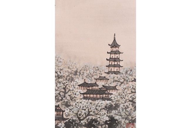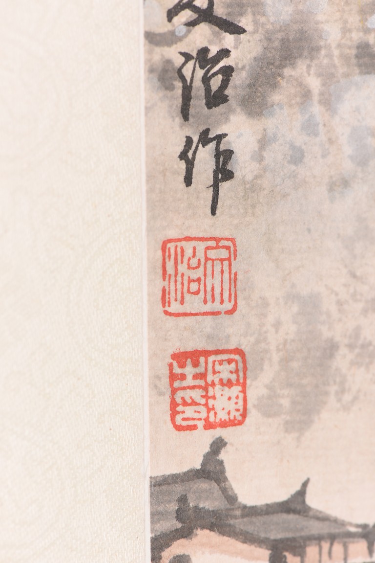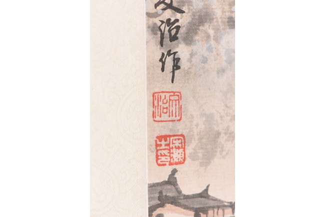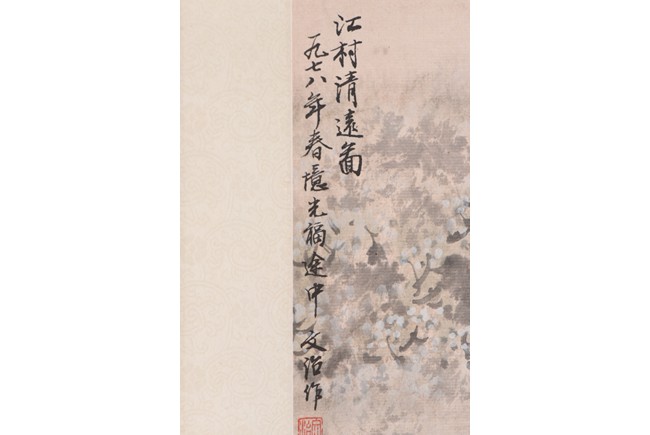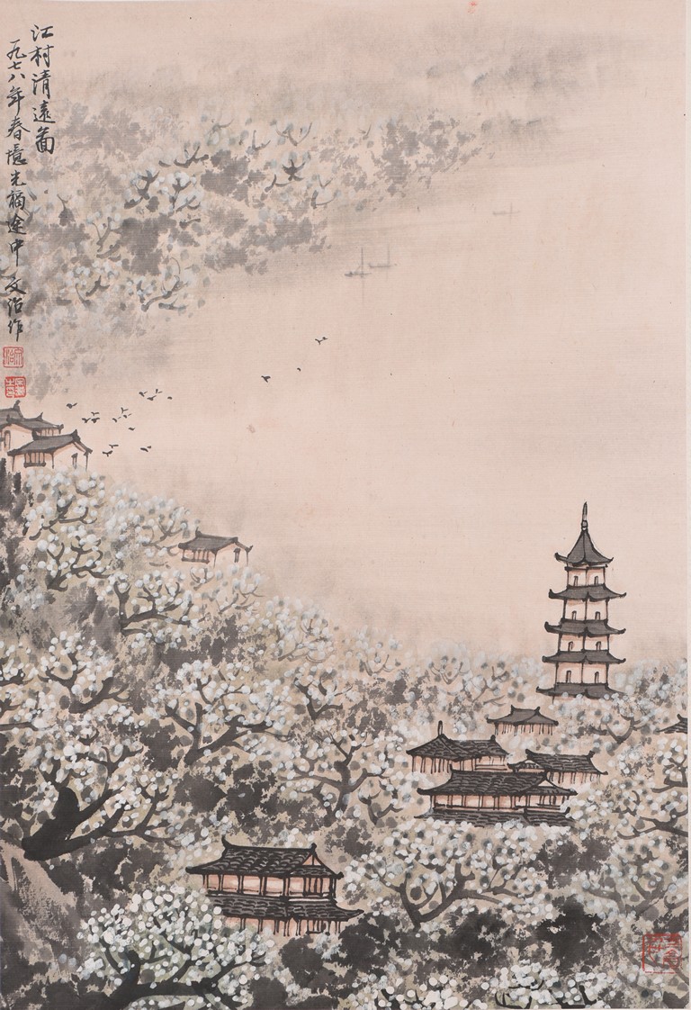 Ink and color on paper. Lakeside Village. Hanging scroll. Inscribed, and signed Wenzhi, dated to Spring of the year of 1978, with three seals of the artist.