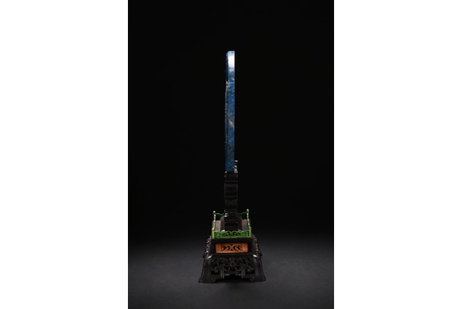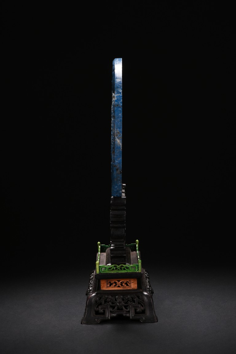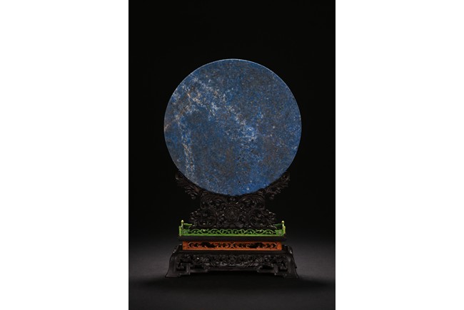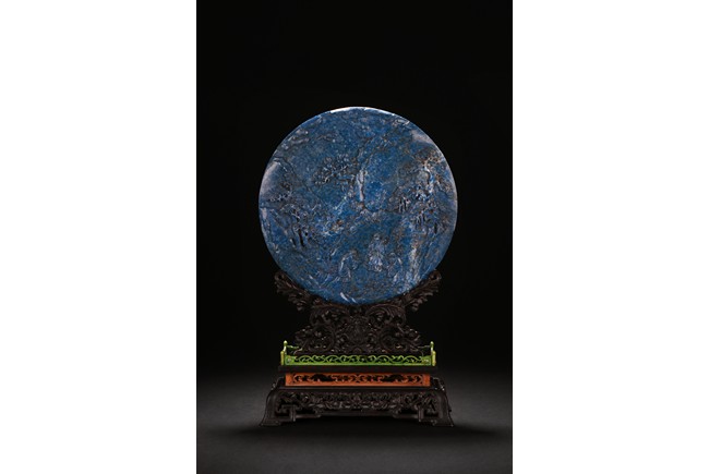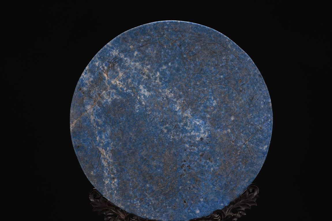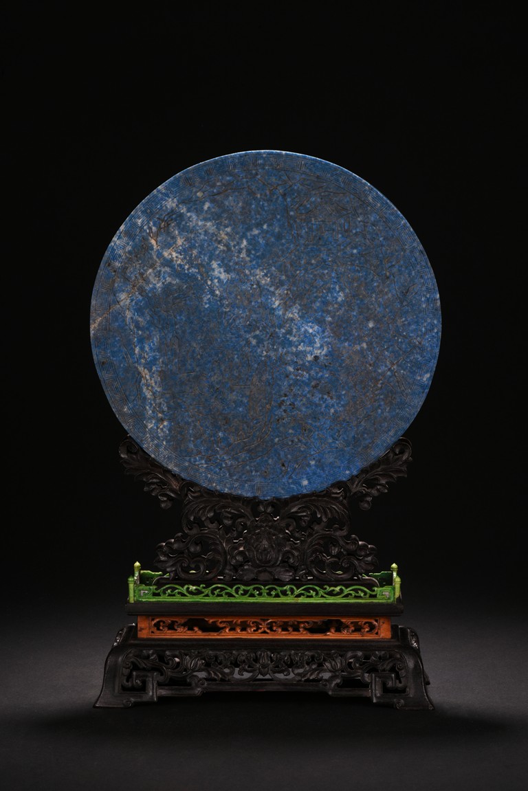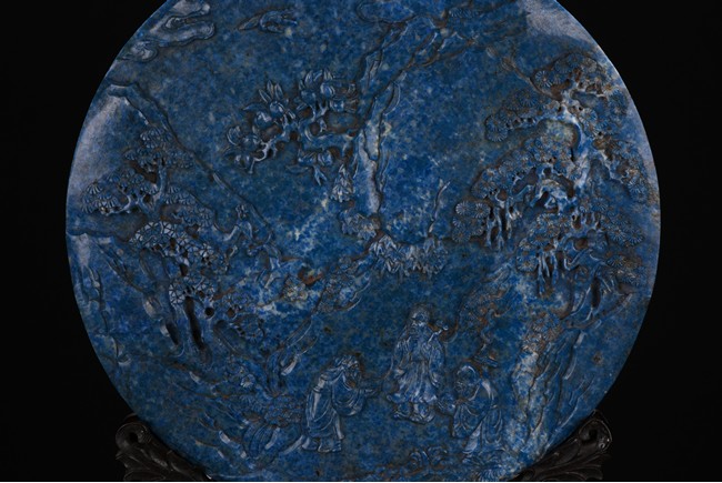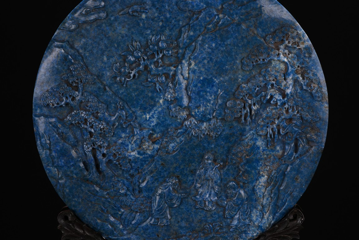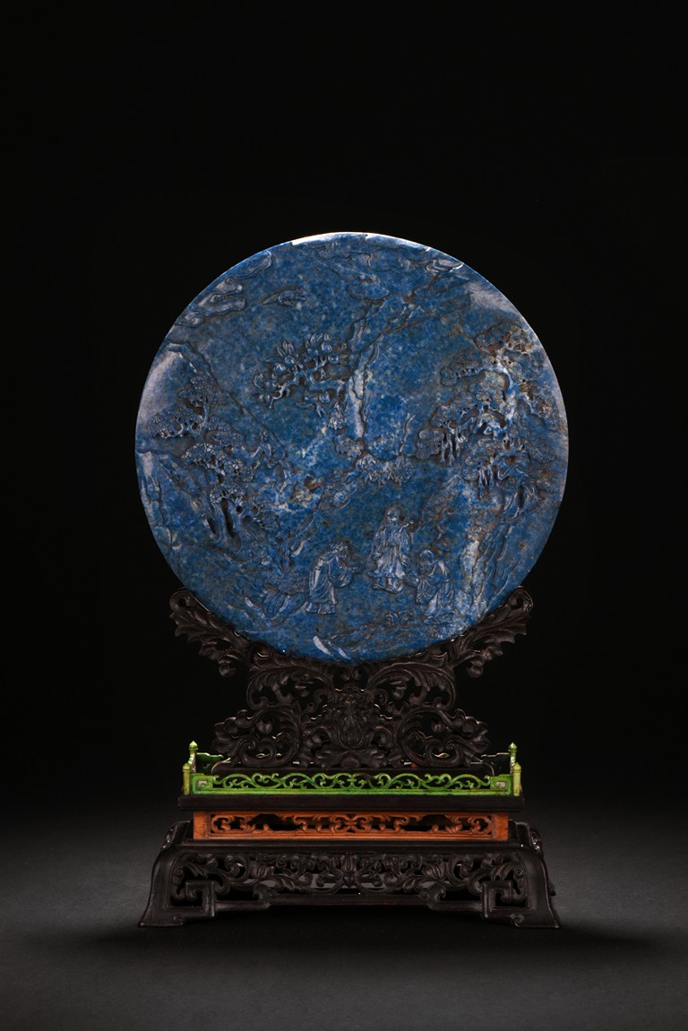 The circular desk of lapis lazuli, carved on one side in high relief with a scene of three elder scholars conversing amongst pine and other trees in a mountainous setting in relief, the reverse with an elder standing far away from a pavilion in a rocky garden setting below pine trees within a circular key-fret band border, with a delicately carved wood stand. Qing Dynasty period.