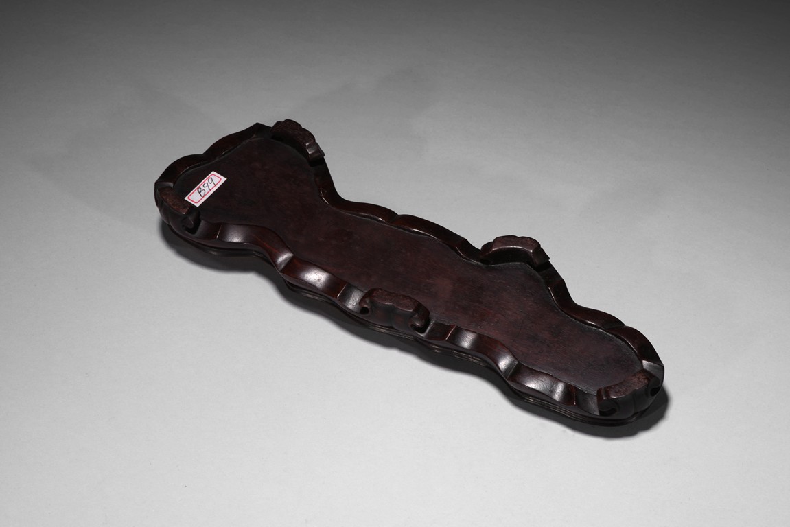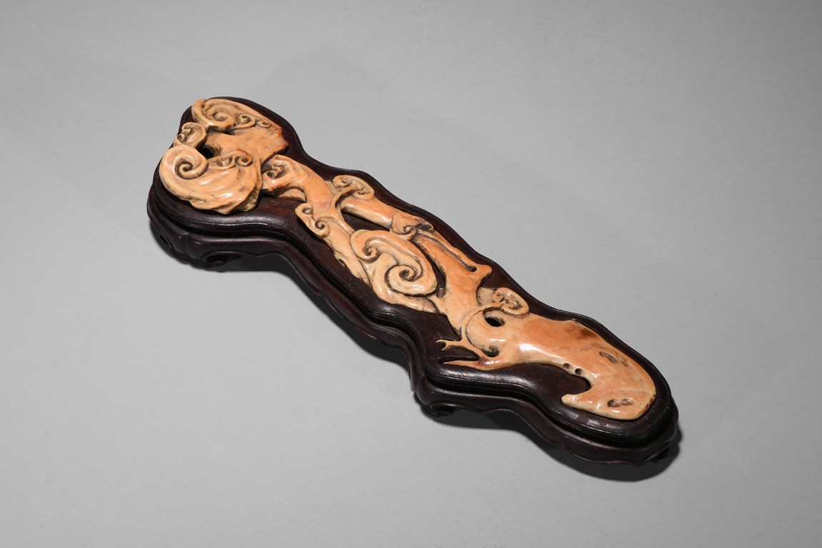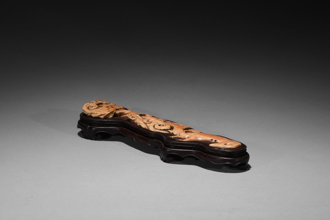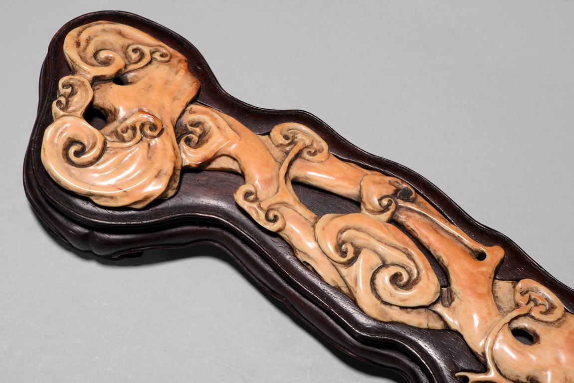 Intricately carved into a naturalistic shape of a lingzhi branch, grown with many lingzhi on the side, tip, and the top, showing age related deepening yellow, cracks, and patina, mounted into a later fitted wooden stand. 19th century