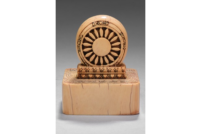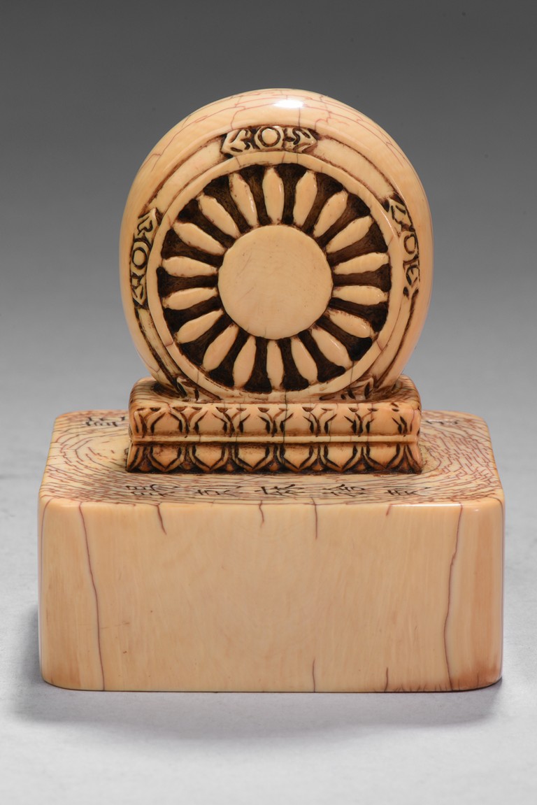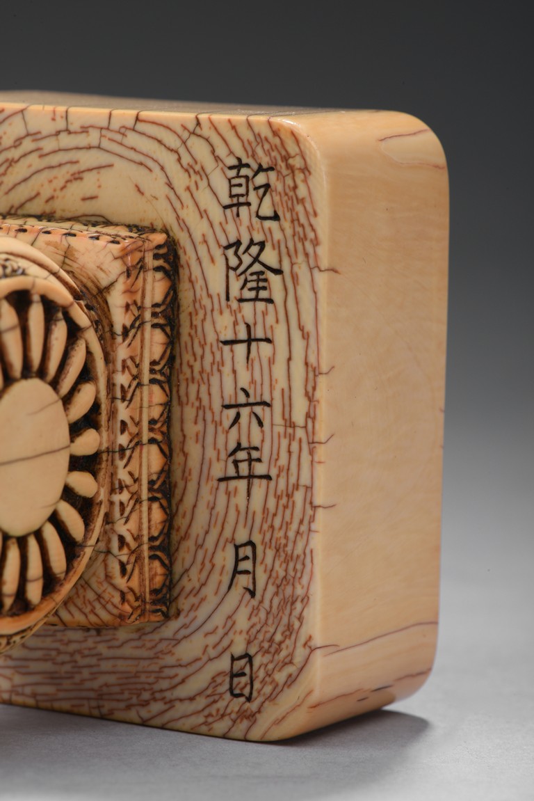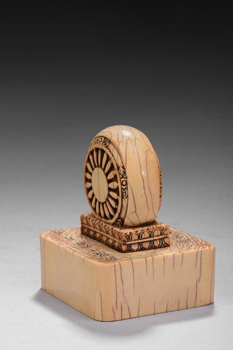 Of square section, the seal surmounted with a Dharmacakra or wheel of law upon a double-staged lotus pedestal, the base inscribed on the upper edge dated to 1751. The cream colored bone patinated to dark-brown tones along the edges. Qing Dynasty Qianlong period. 18th century.