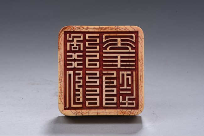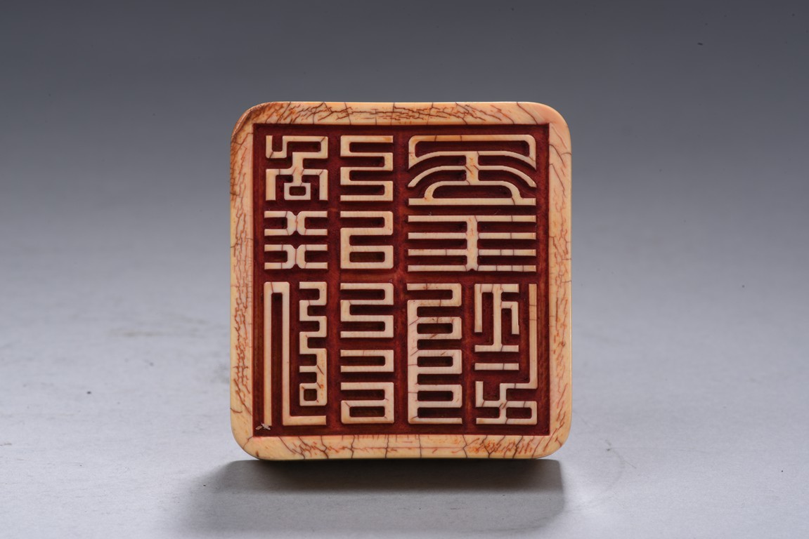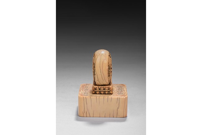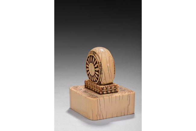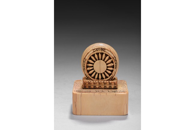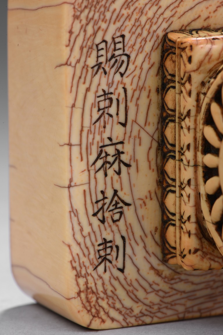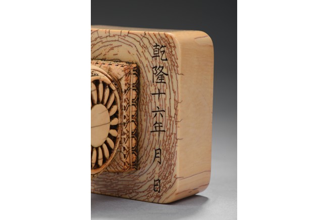 Of square section, the seal surmounted with a Dharmacakra or wheel of law upon a double-staged lotus pedestal, the base inscribed on the upper edge dated to 1751. The cream colored bone patinated to dark-brown tones along the edges. Qing Dynasty Qianlong period. 18th century.