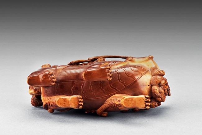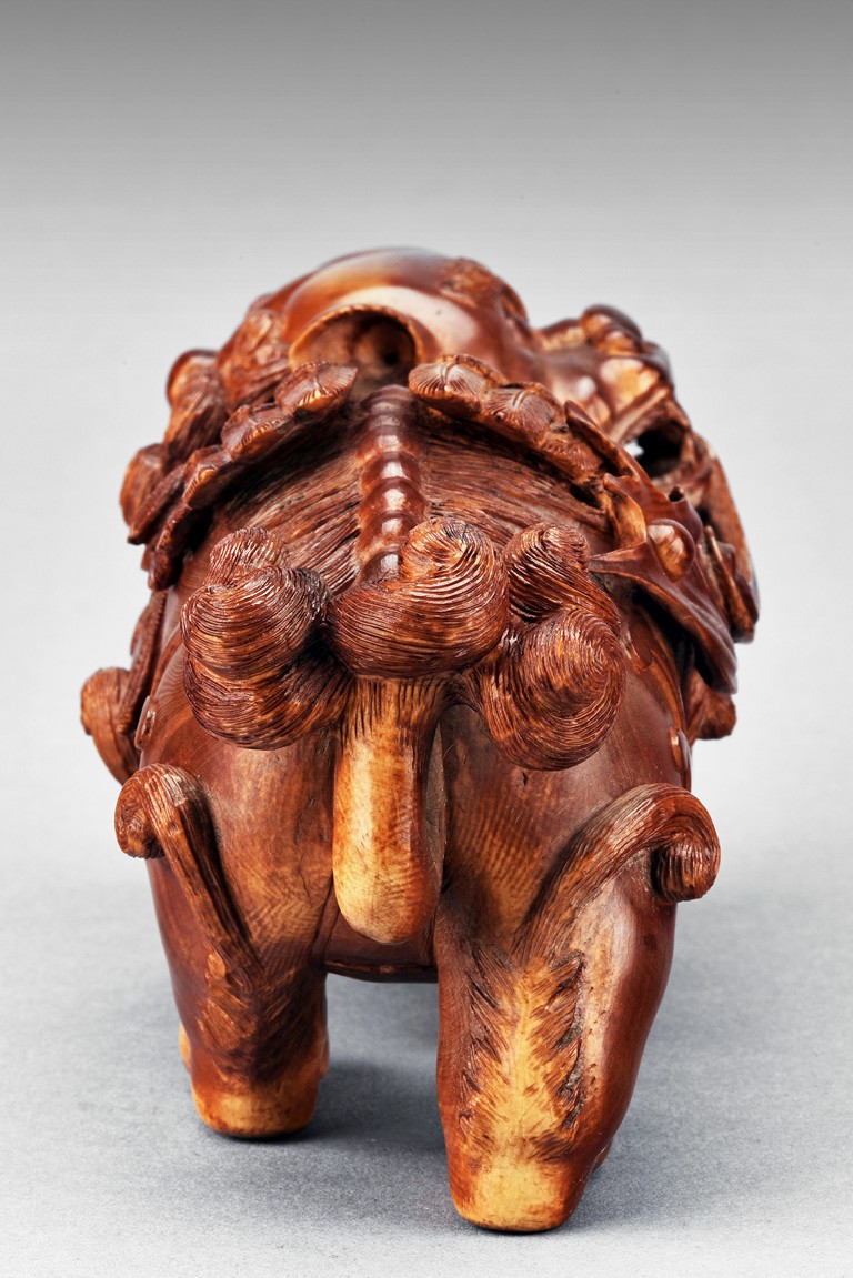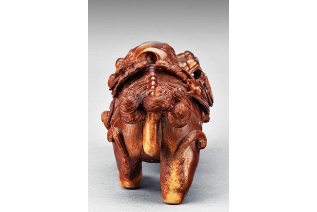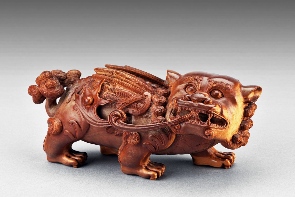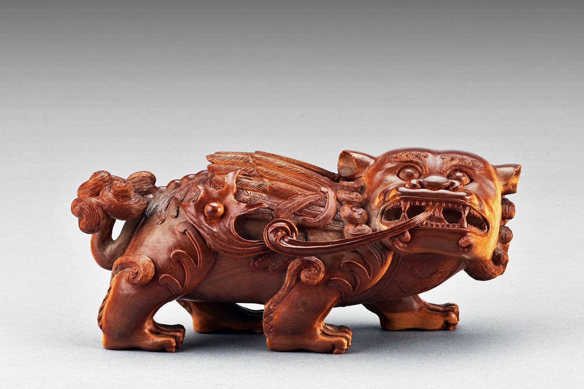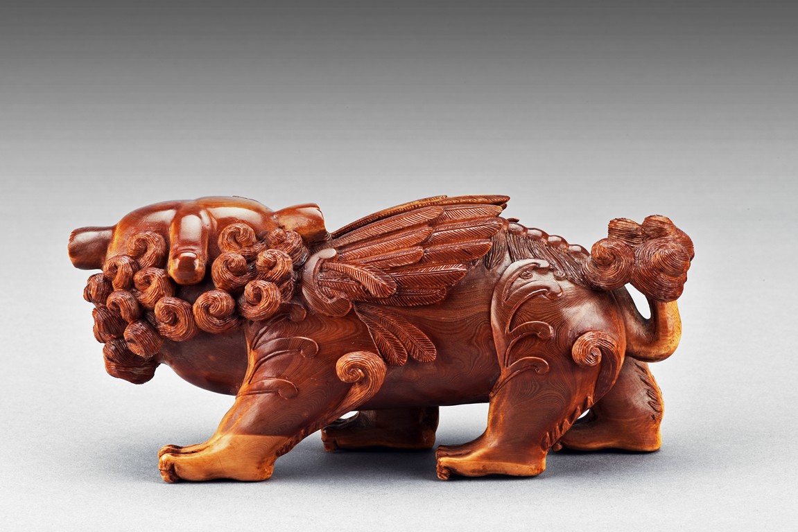 The lion is shown standing foursquare, the head tilted to one side, mouth grasping a ribbon attached to body, revealing menacing teeth, with two rounded protruding eyes above ruyi-shaped nose, the hair and mane finely detailed with incised lines. 19th century.