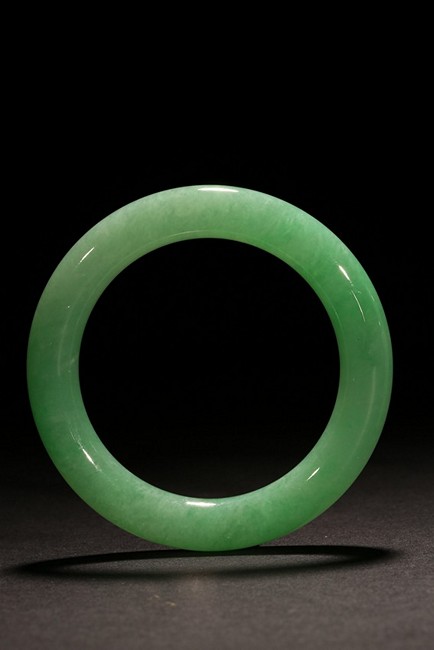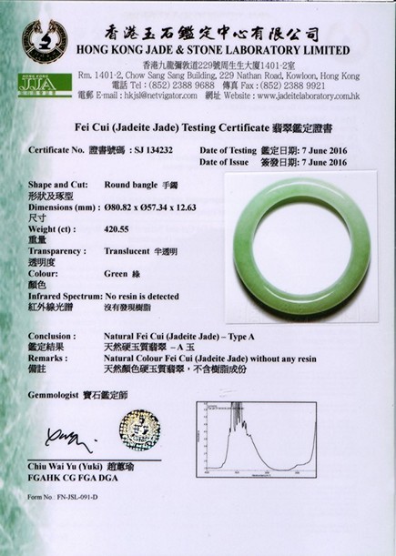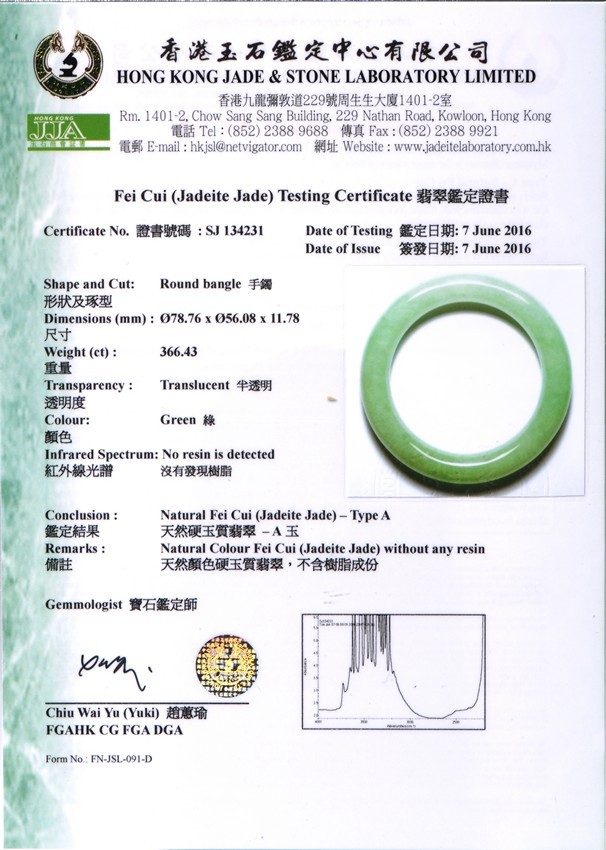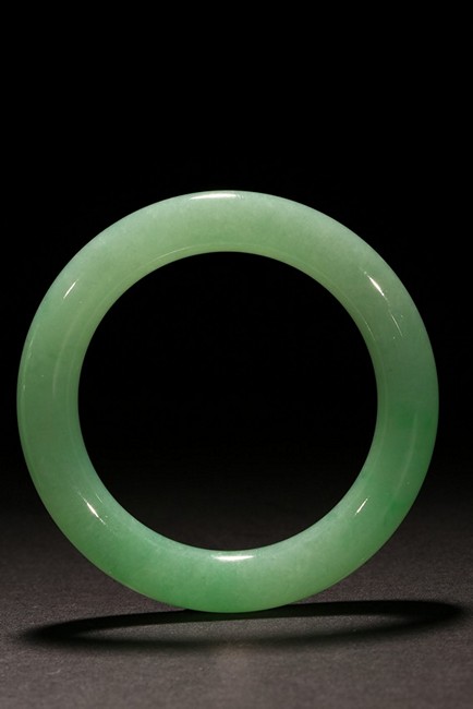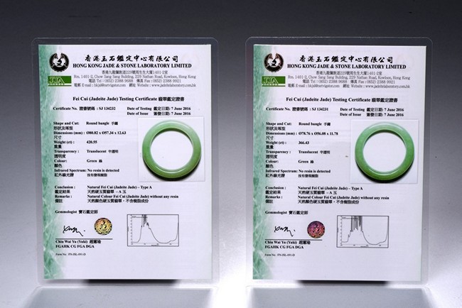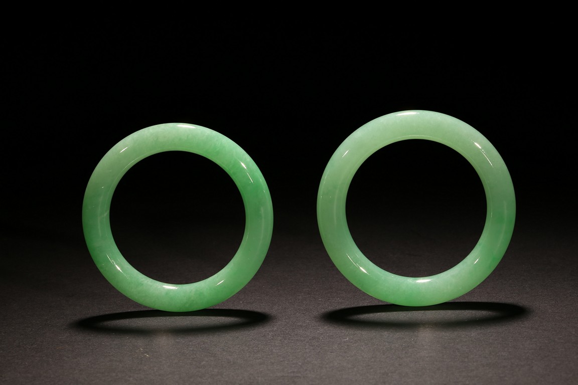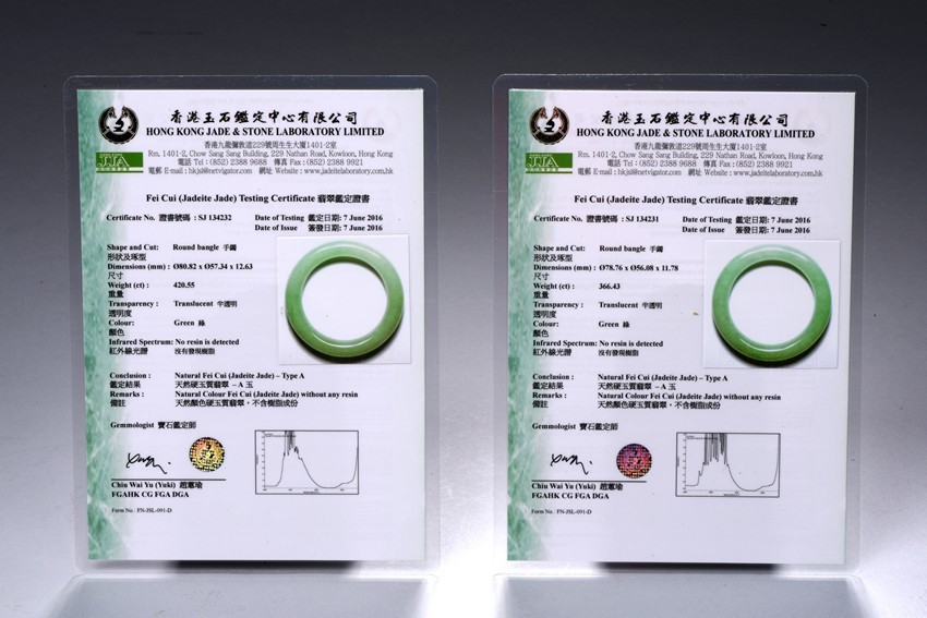 Of matching color and texture, this pair of beautiful natural jadeite jade bangles each has a even color and translucent texture throughout the whole bangle, measured at 78.76 x 56.08 x 11.78mm at 366.43ct and, 80.82 x 57.34 x 12.63mm at 420.55ct respectively. An impressive large size in traditional timeless round bangle. Accompanied by a testing certificate from Hong Kong Jade &; Stone Lab indicating natural type A jadeite without any resin.