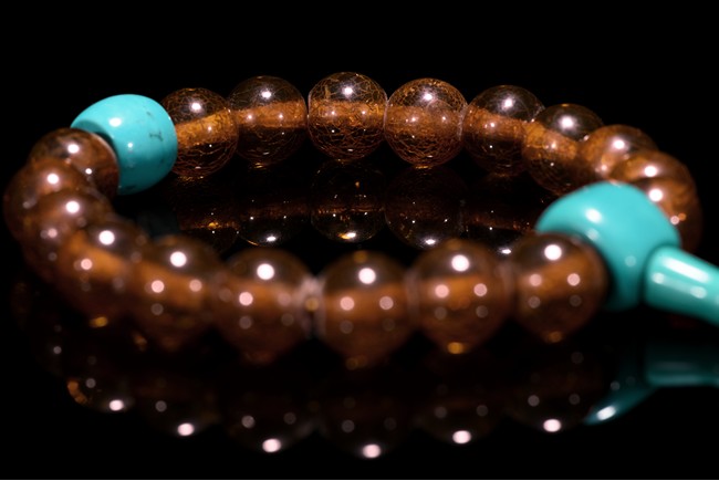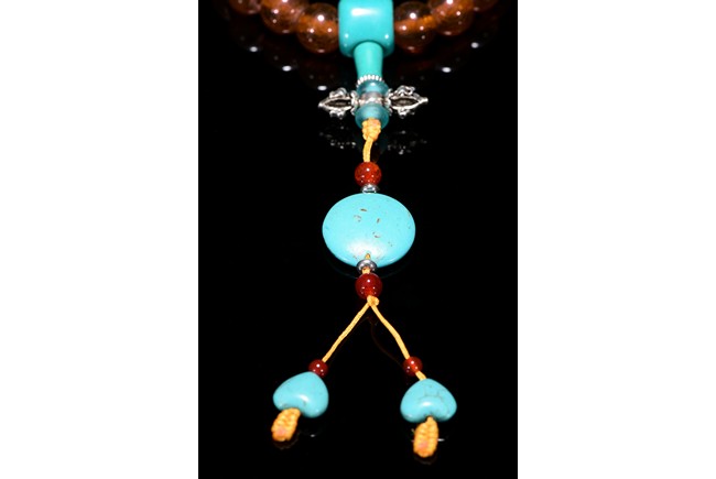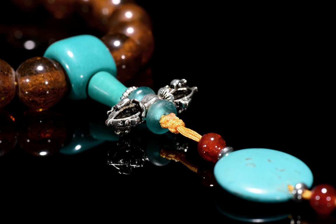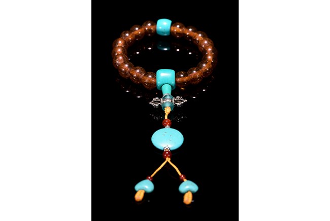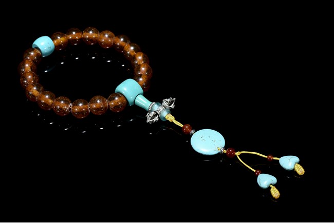 Comprising of an amber bracelet with rounded beads, in the middle confronted spaced by two cylindrical turquoise beads, one of them joined by a decorated strand composed of a small rounded turquoise panel, tiny red gems and two smaller heart-shape turquoise beads. Qing Dynasty period.
