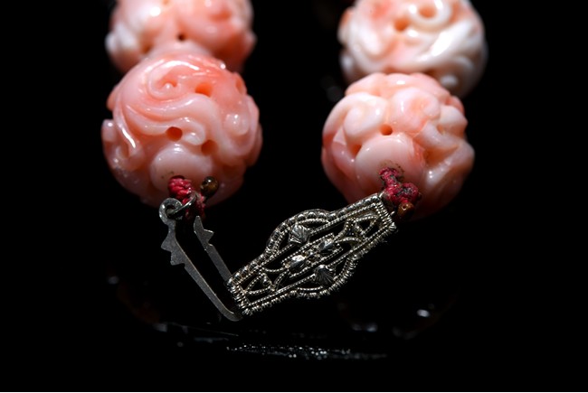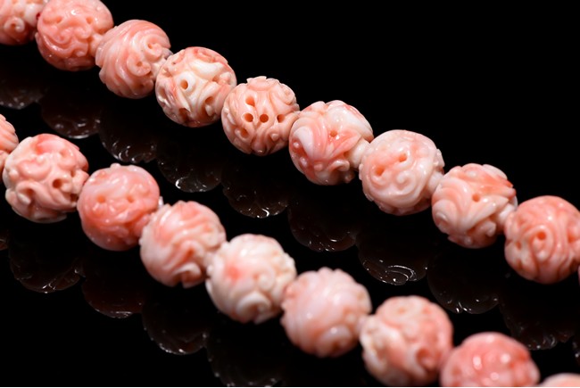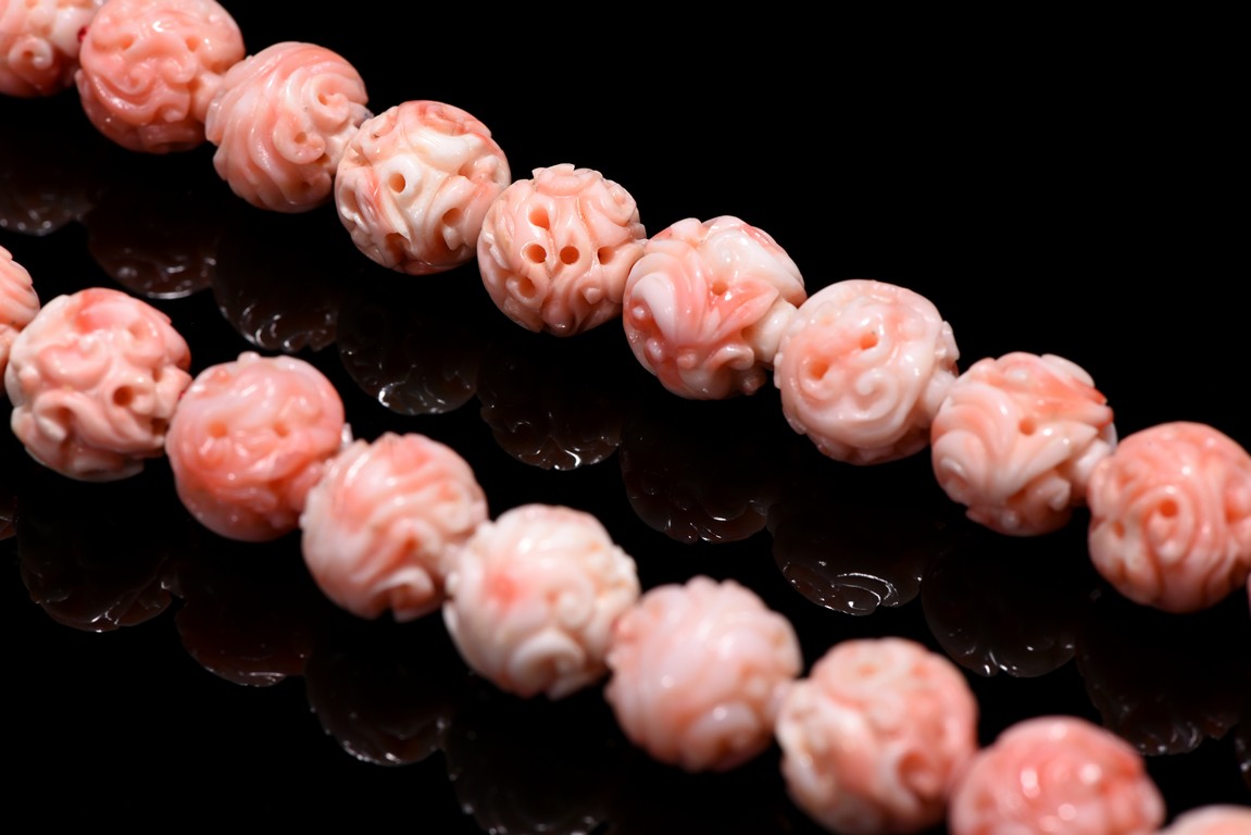 Comprising of carved coral beads of compressed globular form, each pierced with holes and finely carved with stylized scrolled pattern.