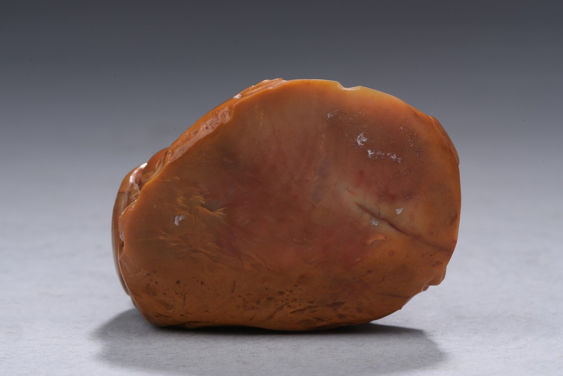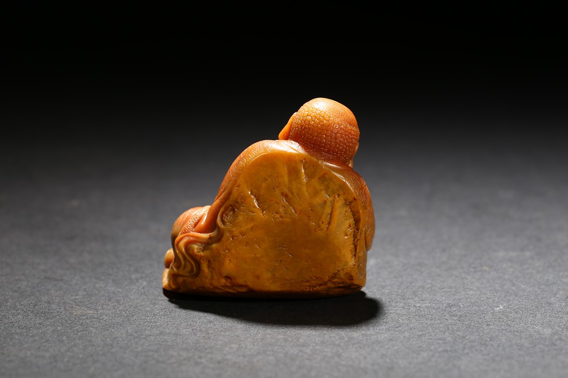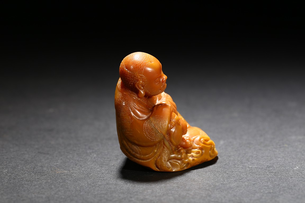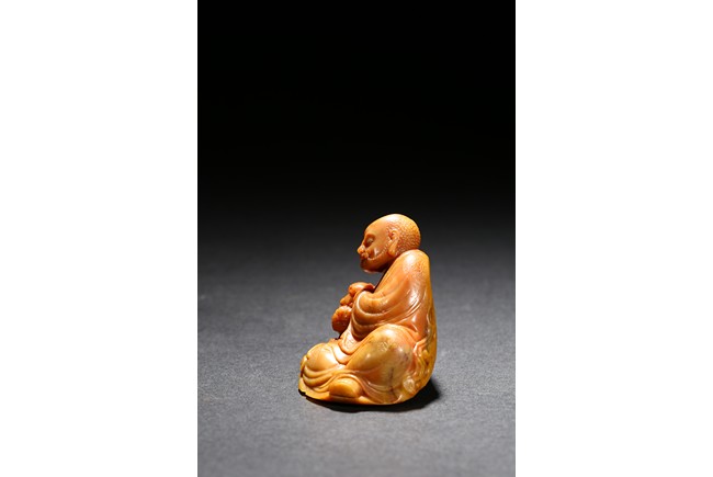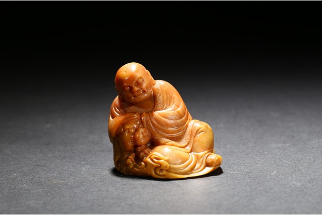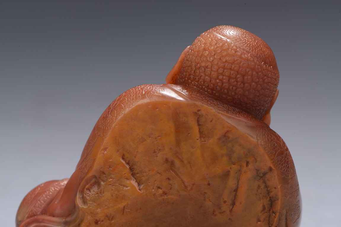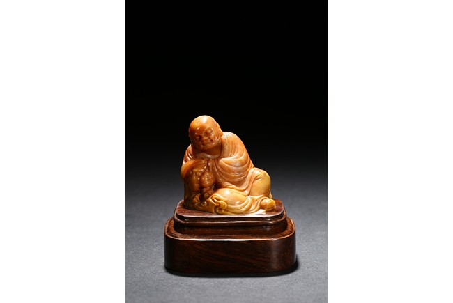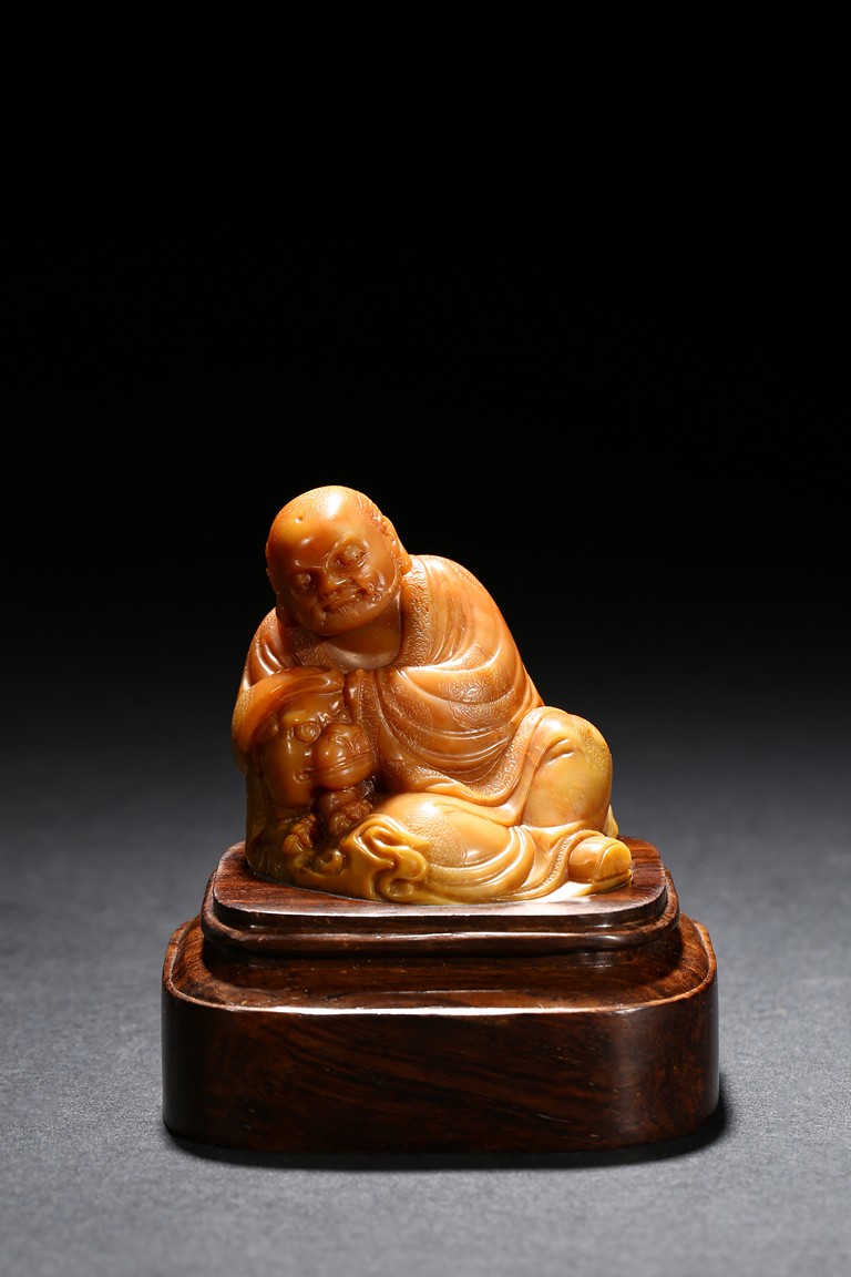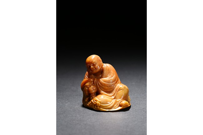 Carved in the form of a Luohan with outward-gazing eyes, tightly coiled hair and beard, garbed in a cloak incised with a decorative pattern, seated with left knee raised, left arm resting on a recumbent tiger's head, the tiger with powerful eyes and nose in wrathful expression, its two front paws resting on the Luohan's right thigh, his back incised with two character 'YUAN SHUI'. Late Qing Dynasty period.