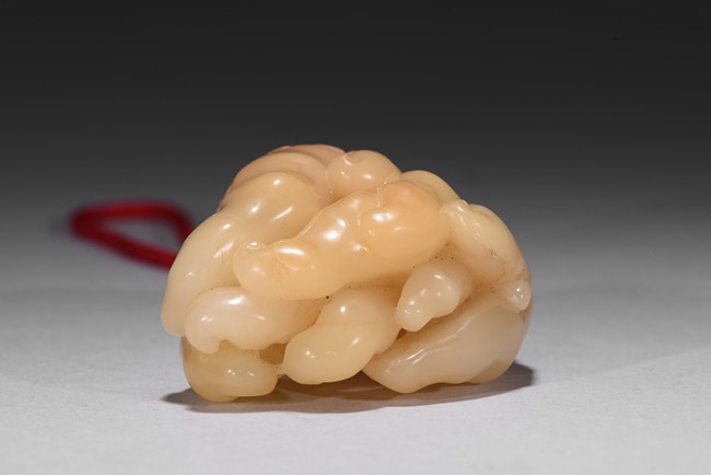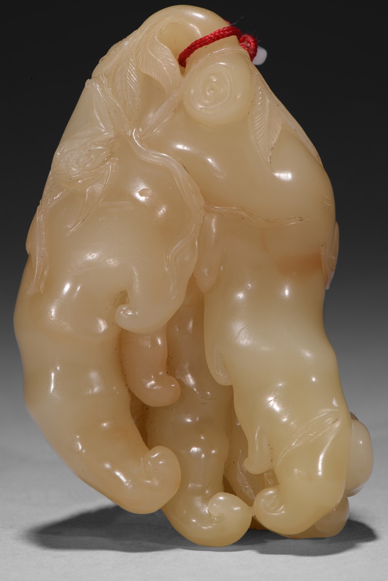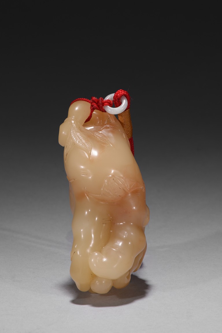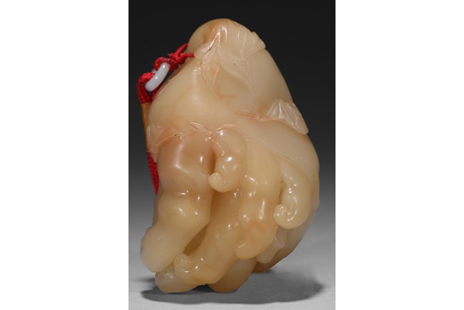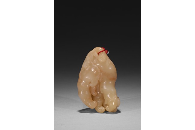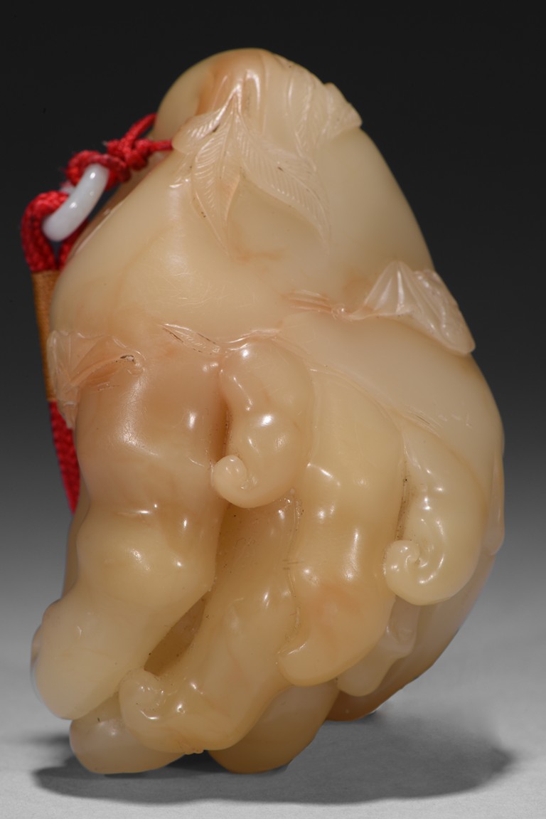 Naturalistically carved from a gnarled leafy branch, the body formed of curling 'fingers' evoking Buddha's hand, with a small bat with stretched wings on one side, the stone of smoothly polished yellowish-white tone with brownish-orange inclusion. Qing Dynasty period.
