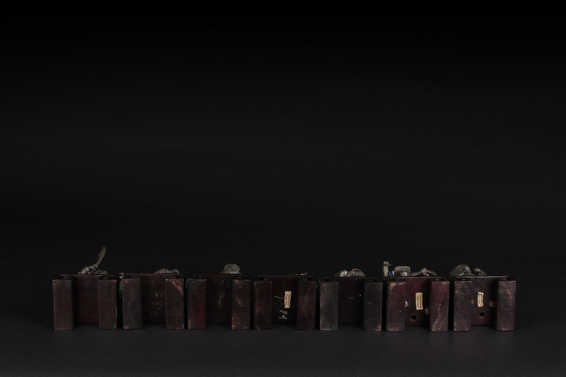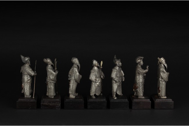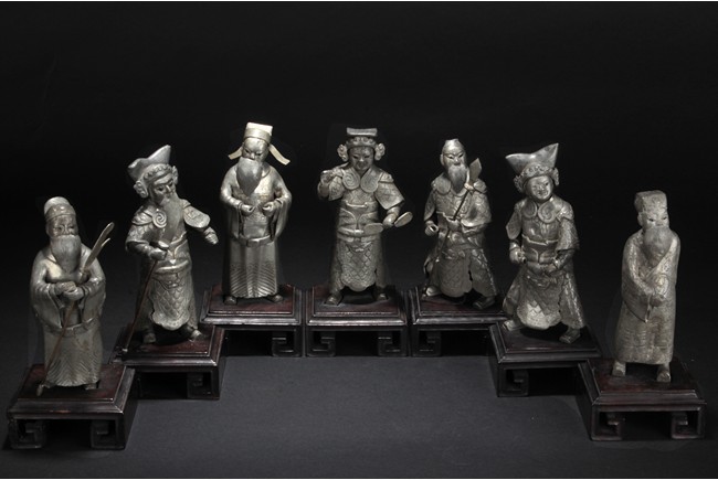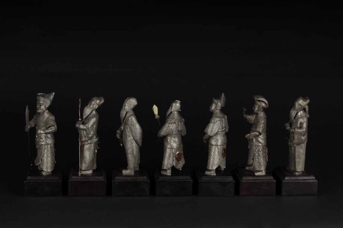Comprising of seven pewter figures, including four military figures fully armored, each holding a long spear, and three elderly civil officials with long beard, each wearing voluminous robe and hat, all supported on square sectioned hardwood stands with scrolled feet. Qing Dynasty period.