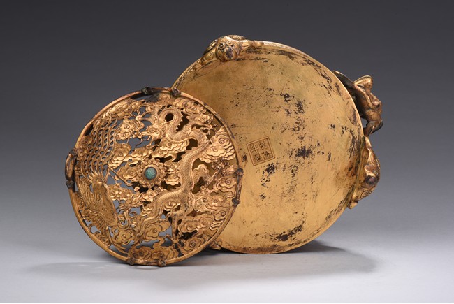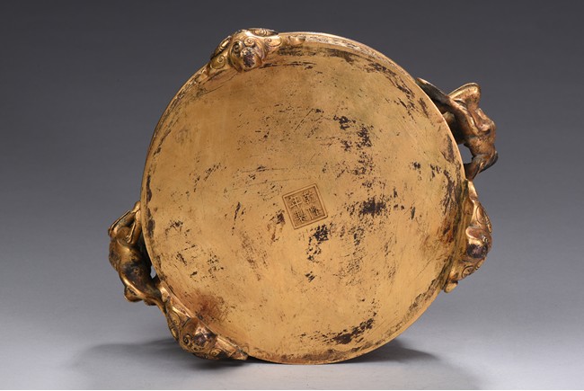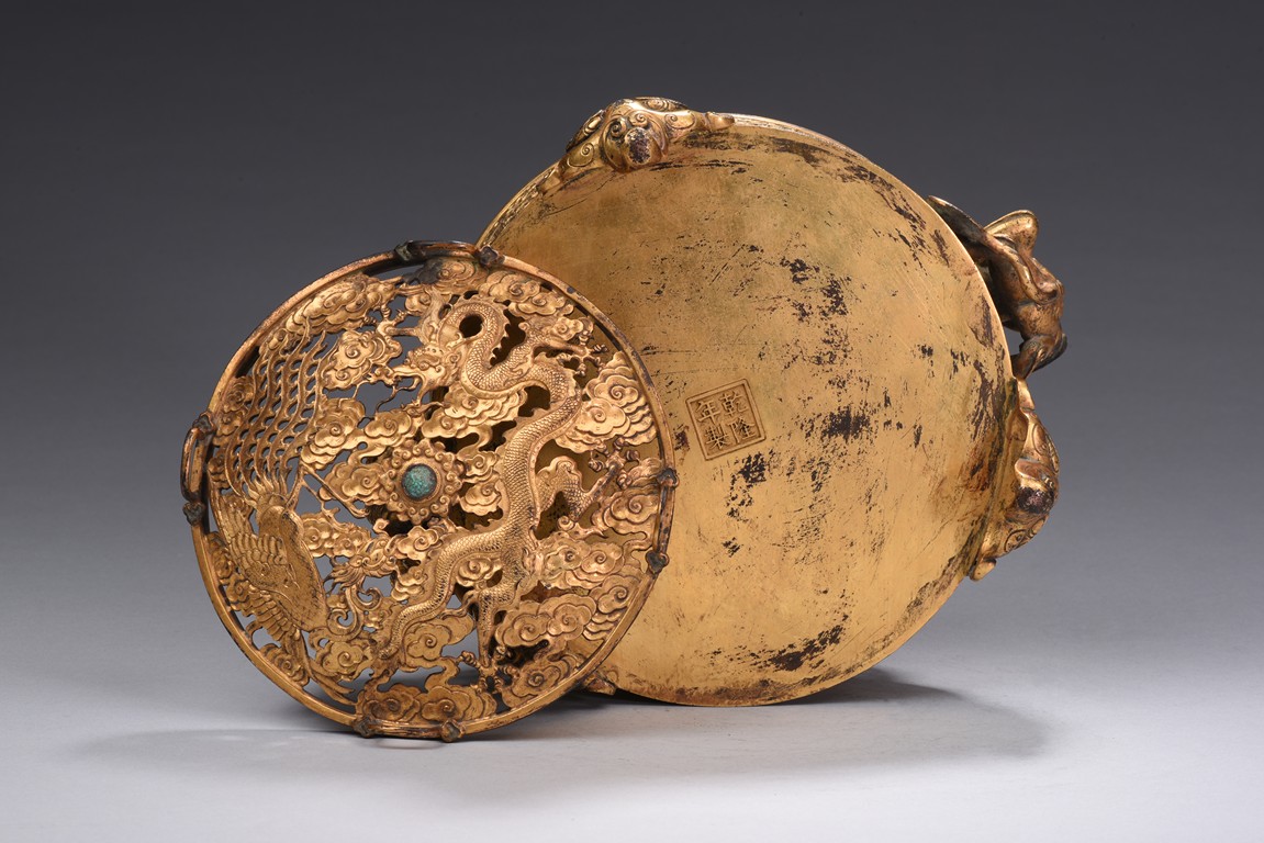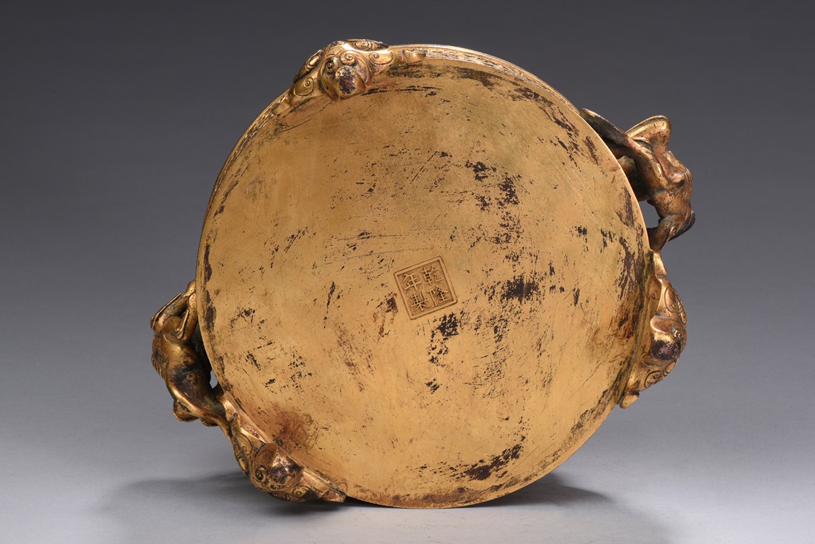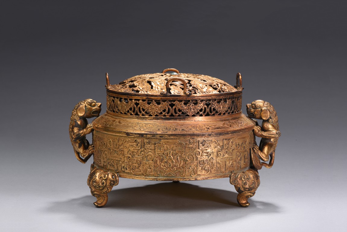 Of circular form supported on three short beast head feet, cast and gilt around the body with scrolling lotus and foliage pattern, all below raised borders of scrolled clouds and auspicious bats encircling the short straight neck, flanked by two climbing lions form handles, the cover reticulated with winding dragon and phoenix amidst scrolling clouds and set with a small rounded turquoise finial in the center, around the cover rim flanked by four small arc-shaped handles. The base with a four character 'QIANLONG' mark. Qing Dynasty period.