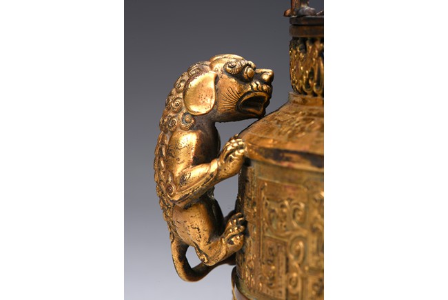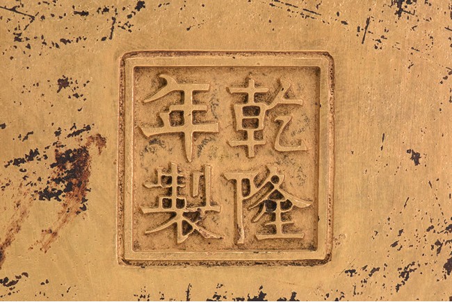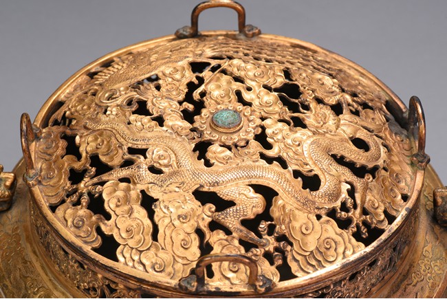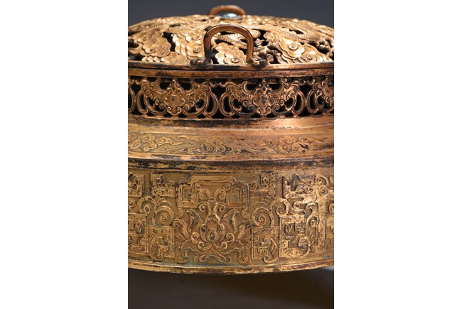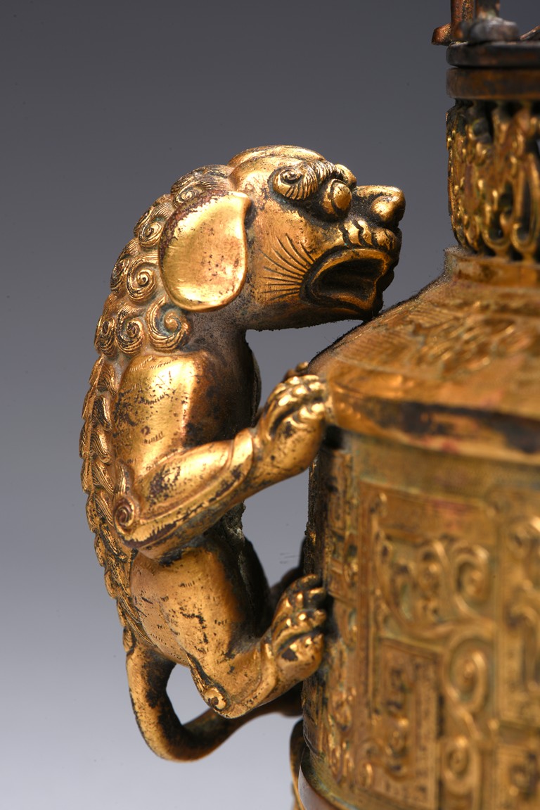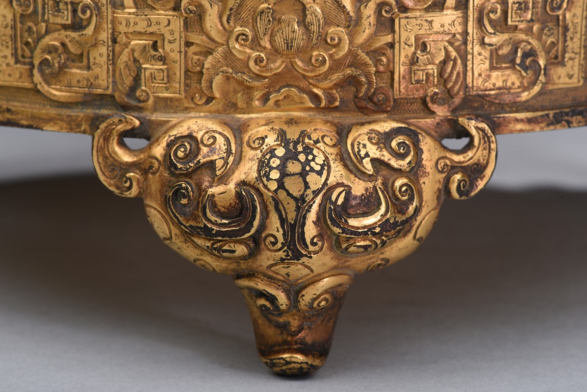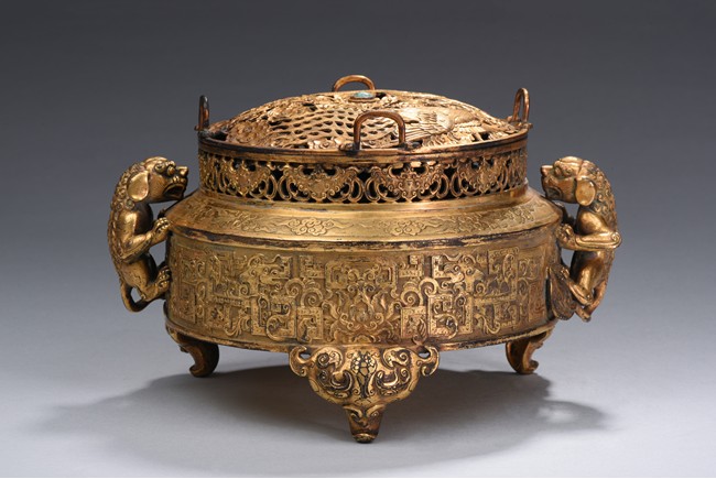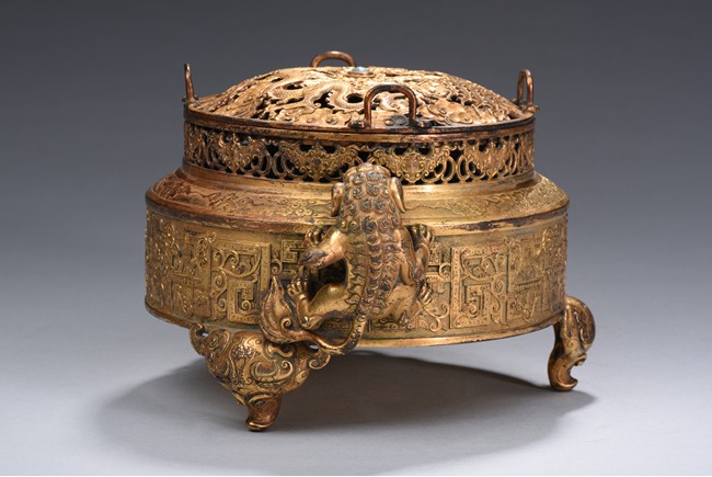 Of circular form supported on three short beast head feet, cast and gilt around the body with scrolling lotus and foliage pattern, all below raised borders of scrolled clouds and auspicious bats encircling the short straight neck, flanked by two climbing lions form handles, the cover reticulated with winding dragon and phoenix amidst scrolling clouds and set with a small rounded turquoise finial in the center, around the cover rim flanked by four small arc-shaped handles. The base with a four character 'QIANLONG' mark. Qing Dynasty period.