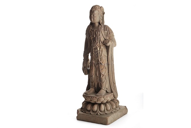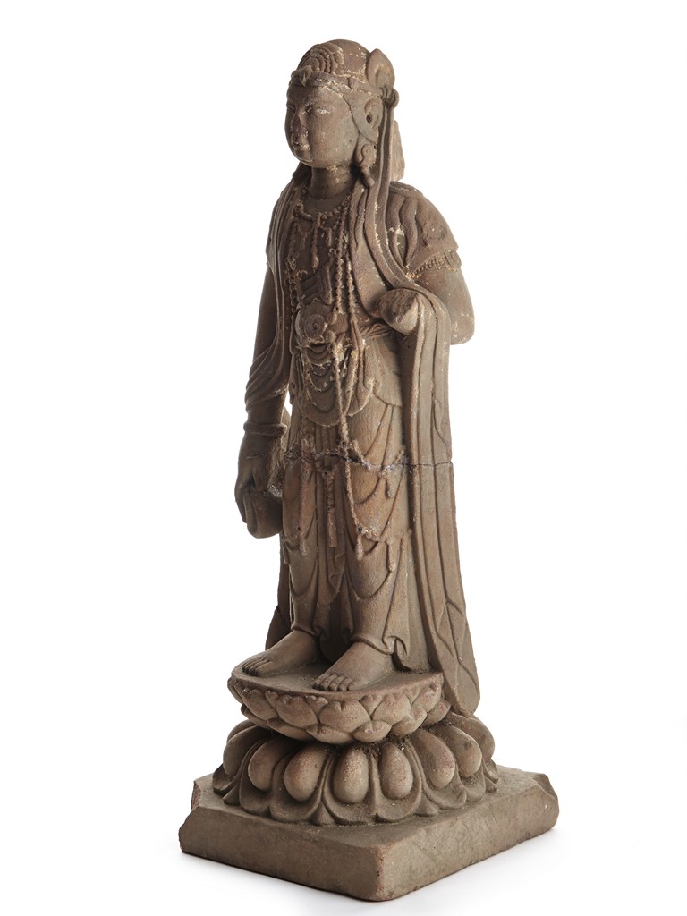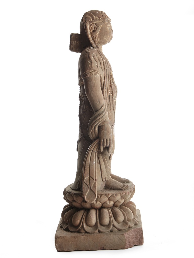 The elegant figure very finely carved from stone, depicting standing on a double lotus throne, dressed in shawl and overskirt pleated in front and falling in graceful folds, adorned with various beaded jewelry, the head slightly tilted.