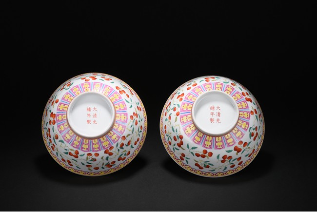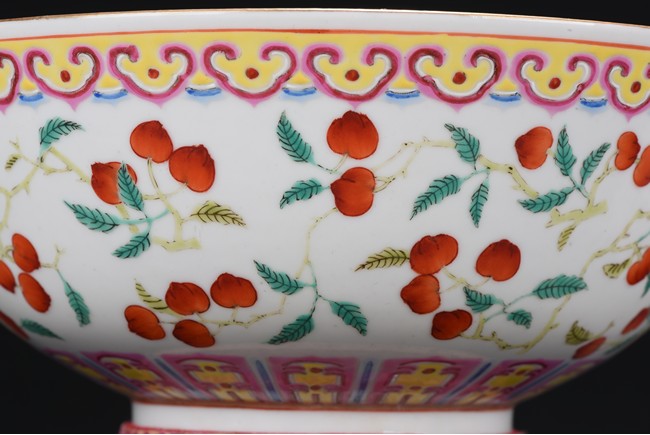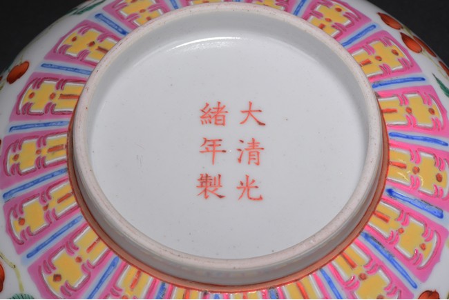 Well potted, the body painted with a continuous scene of leafy peach sprigs, below a ruyi-head lappet bands encircled the mouth rim, the base bears six character 'GUANGXU' mark. Republic period.