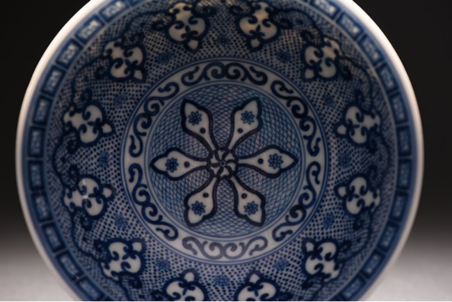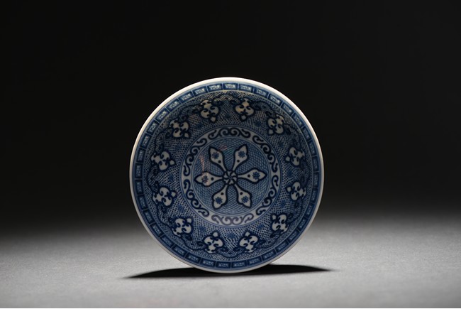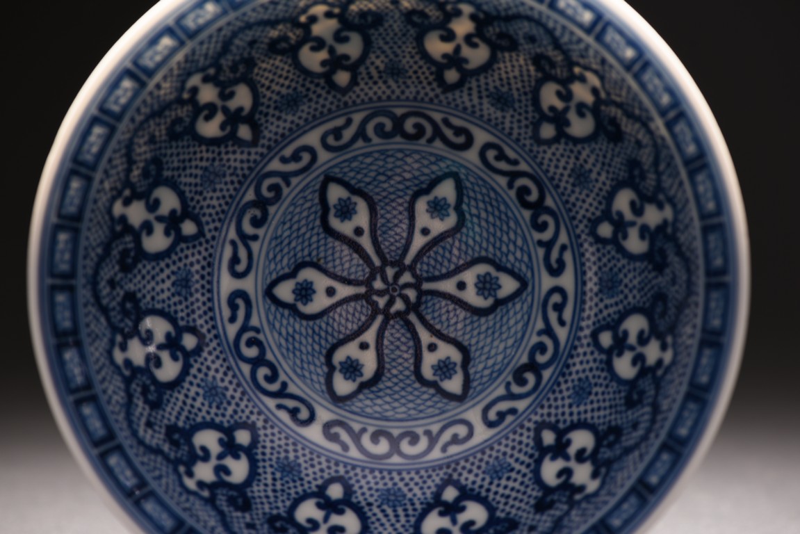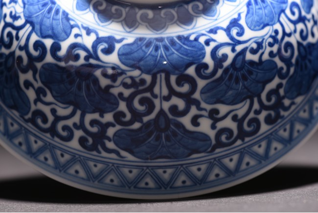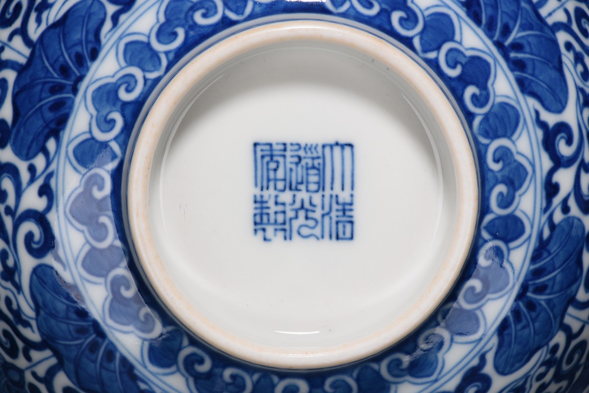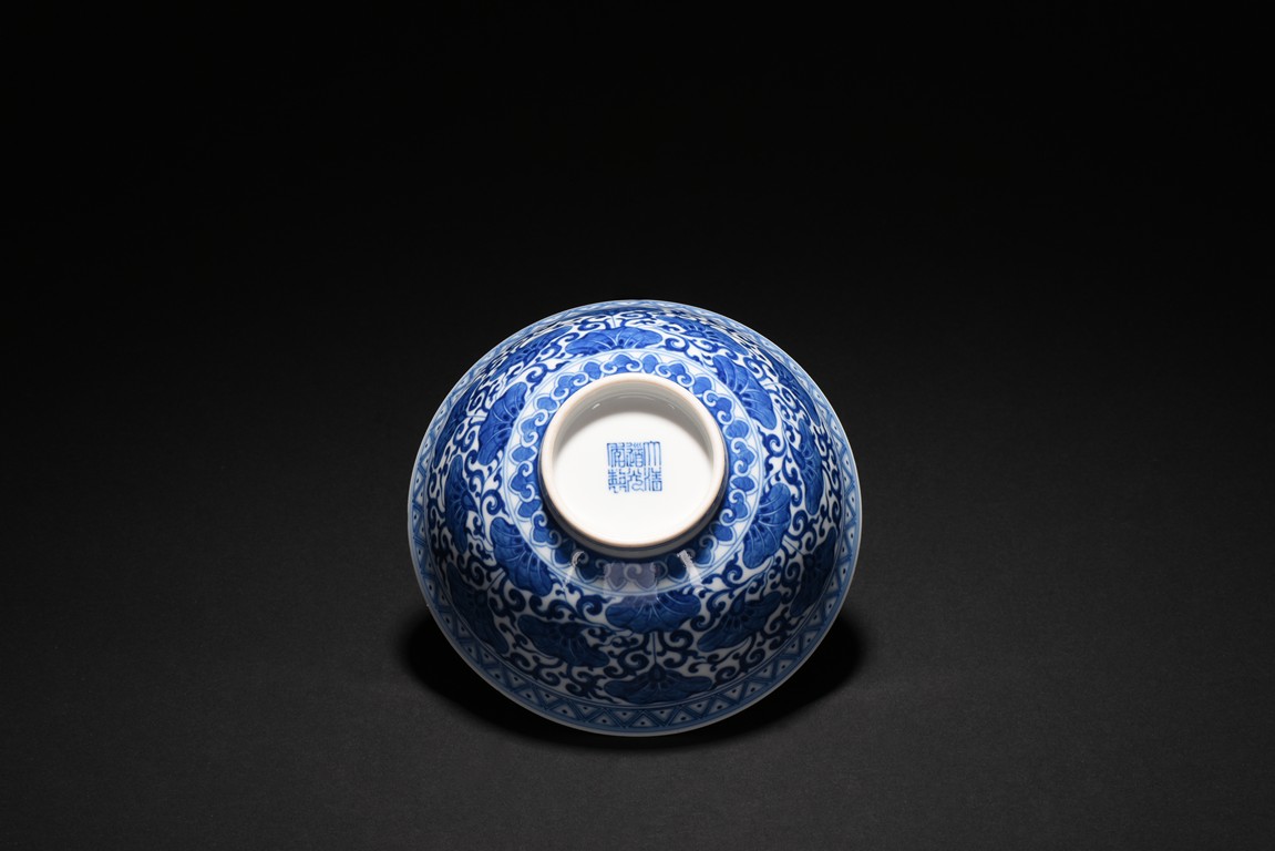 Raised on a short straight foot, the curved sides flaring at the rim, painted in vivid tones of cobalt-blue with 'heaping and piling', the interior decorated with a central medallion of a six-petals lotus flower, within a foliate scroll band at the rim, the exterior painted with large pieces of lotus leaves borne on scrolled foliate above ruyi band and below stylised lappets, the base with a six character seal mark. Qing Dynasty Daoguang period.