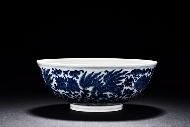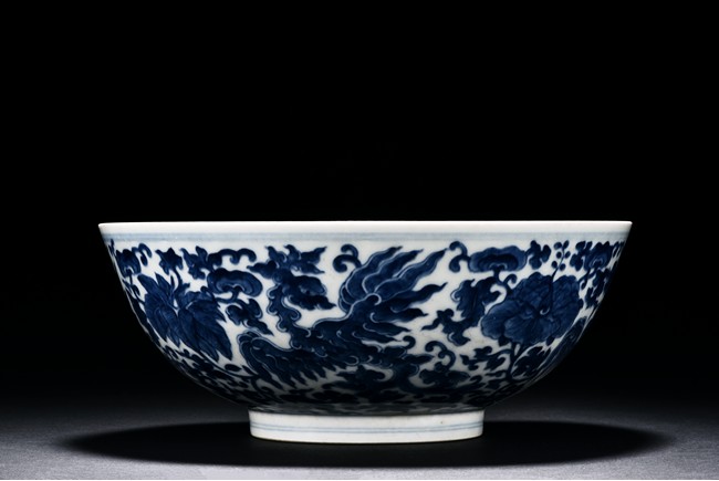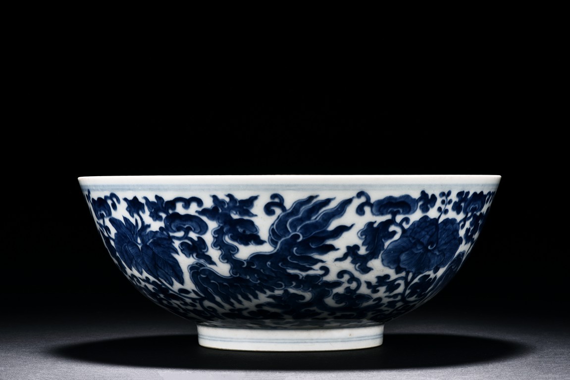 Raised on a circular foot ring, the exterior is finely enameled with a continuous scene of phoenix amongst floral scrolls. The bottom bears six character 'QIANLONG' mark. Qing Dynasty period.