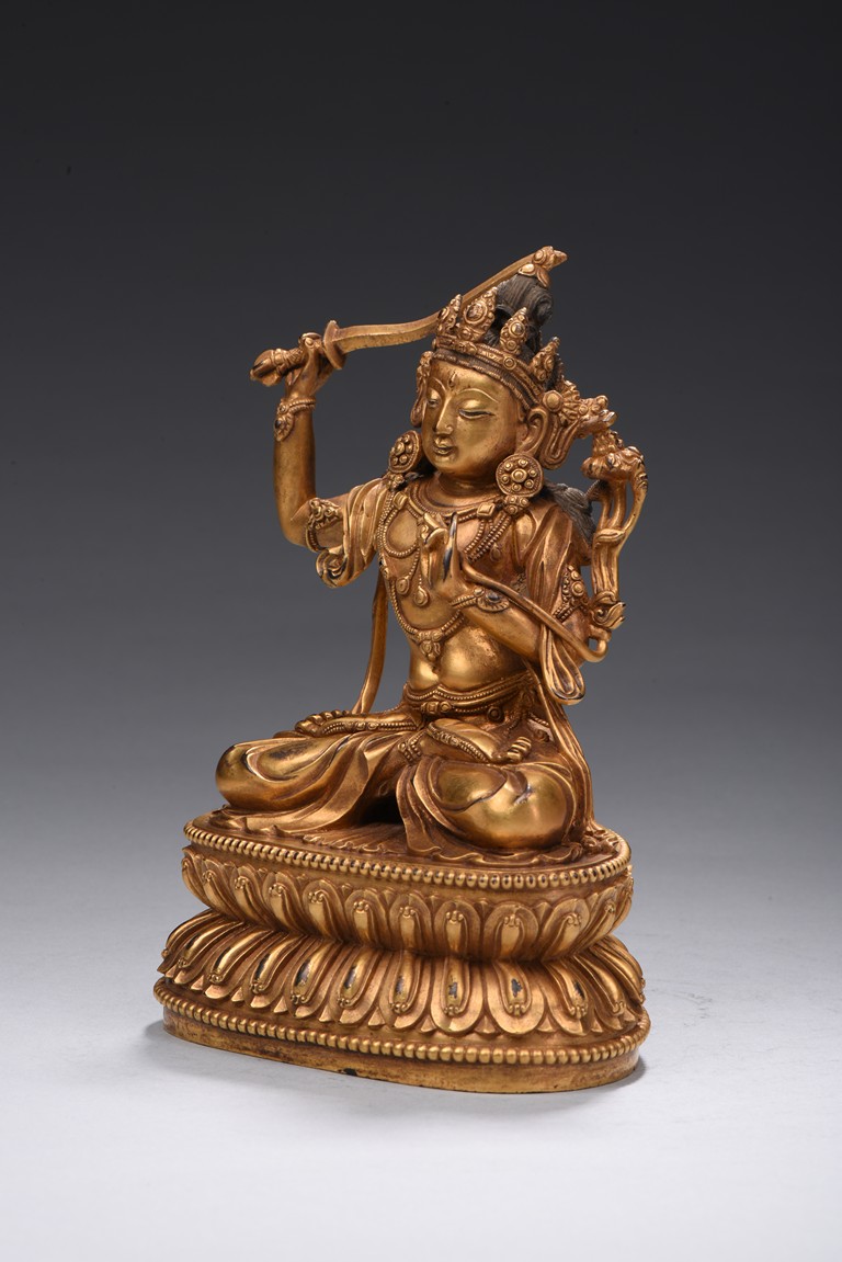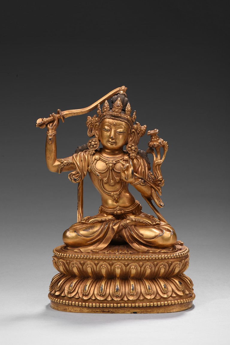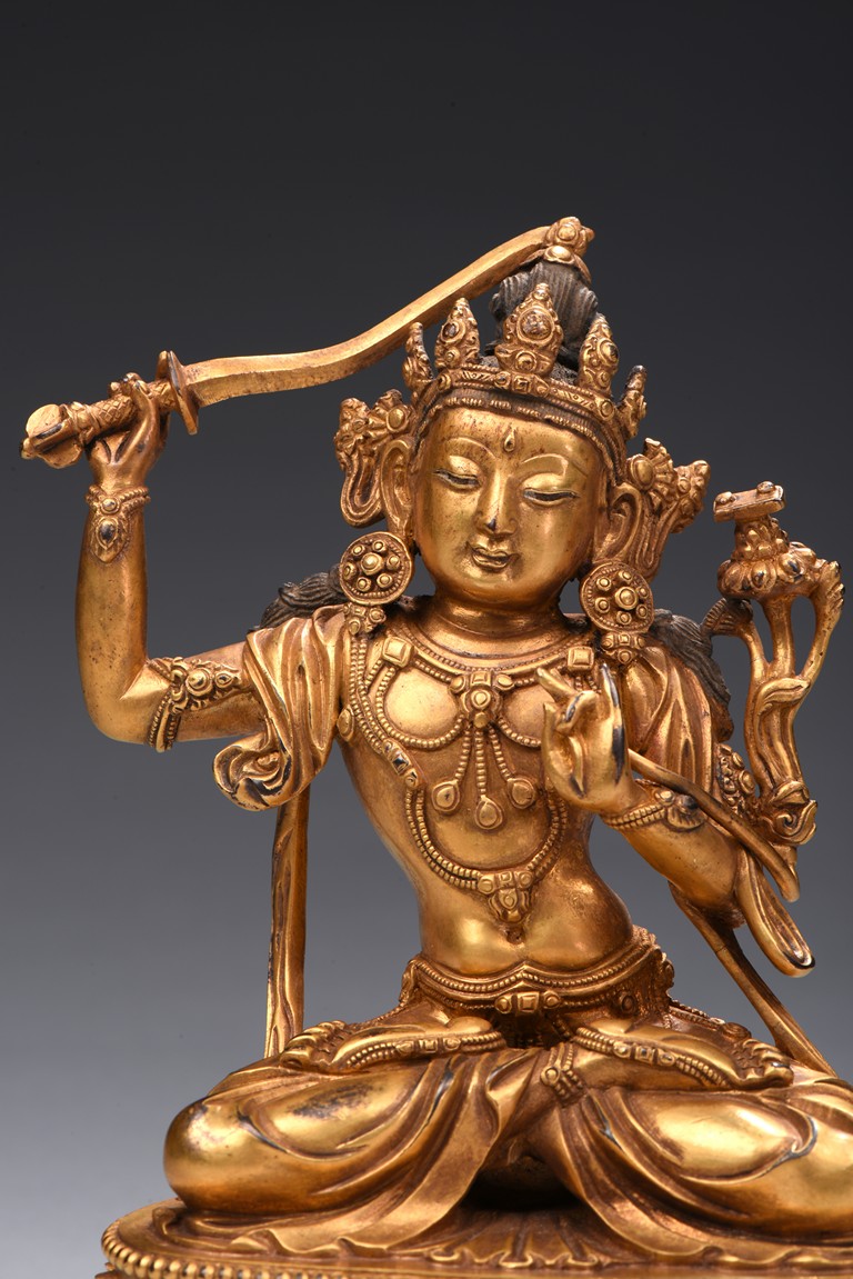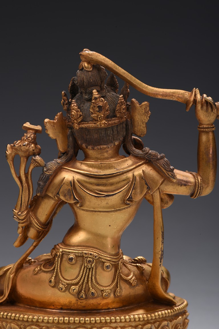 Shown seated in dhyanasana on a double-lotus base with right hand raised brandishing a sword, the left hand holding a sprig, wearing a long flowing dhoti gathered in folds around his feet and an elaborate belt and necklace with beaded festoons, the head slightly tilted in a serene expression and framed by a finely detailed foliate tiara. Qing Dynasty period.