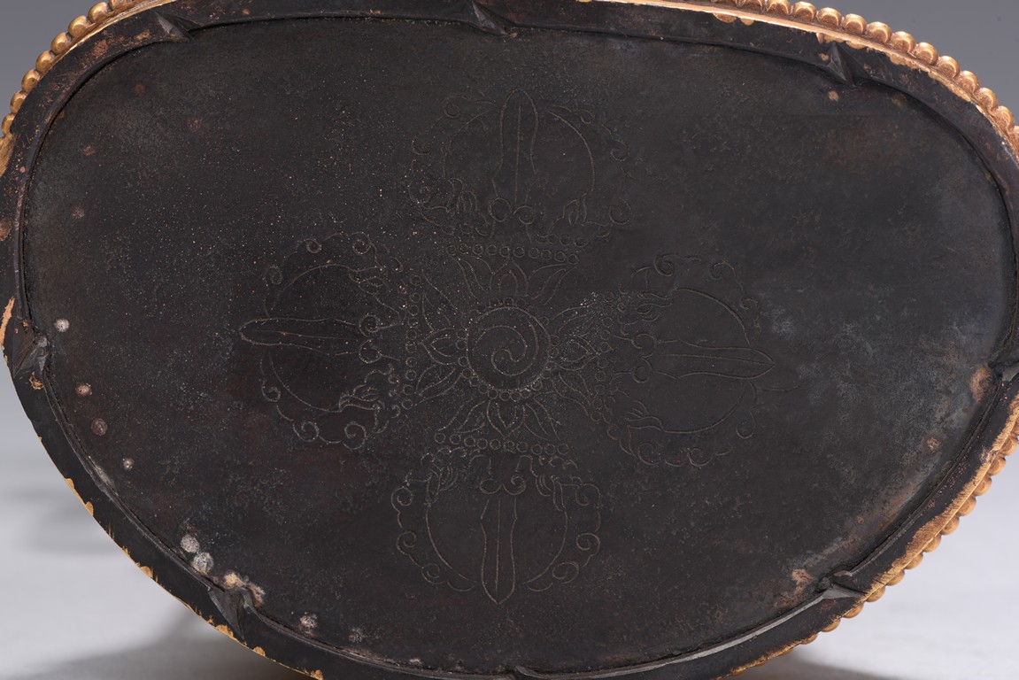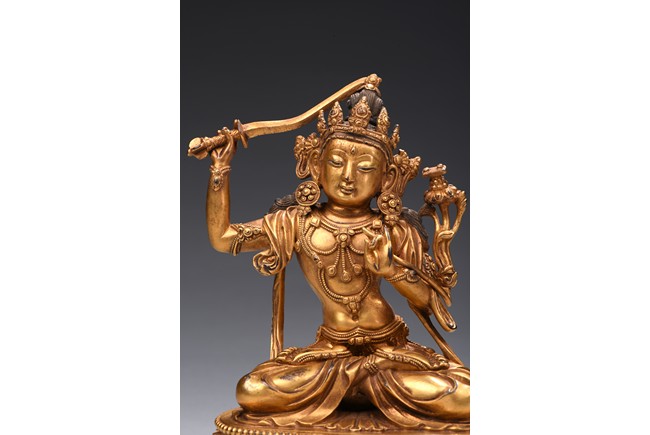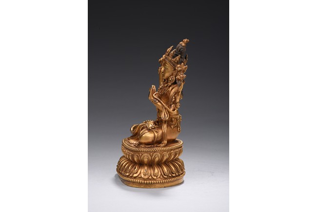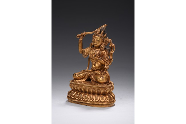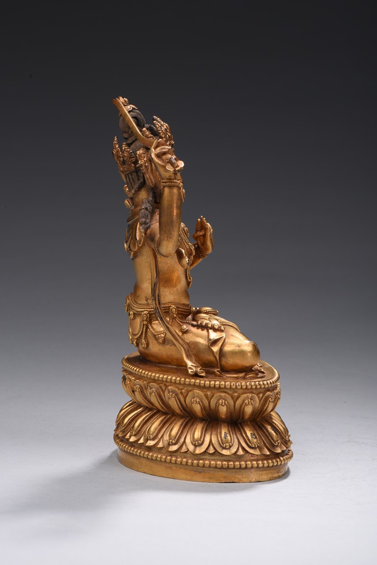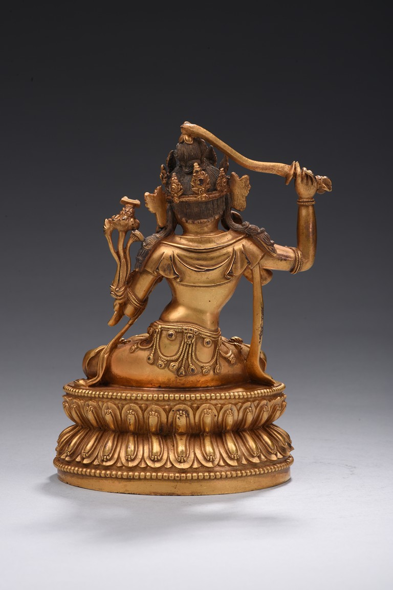 Shown seated in dhyanasana on a double-lotus base with right hand raised brandishing a sword, the left hand holding a sprig, wearing a long flowing dhoti gathered in folds around his feet and an elaborate belt and necklace with beaded festoons, the head slightly tilted in a serene expression and framed by a finely detailed foliate tiara. Qing Dynasty period.