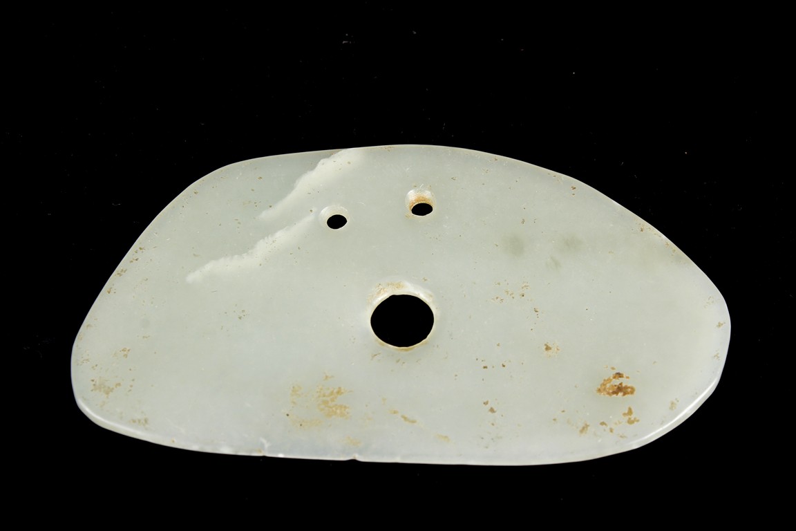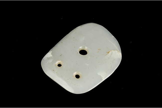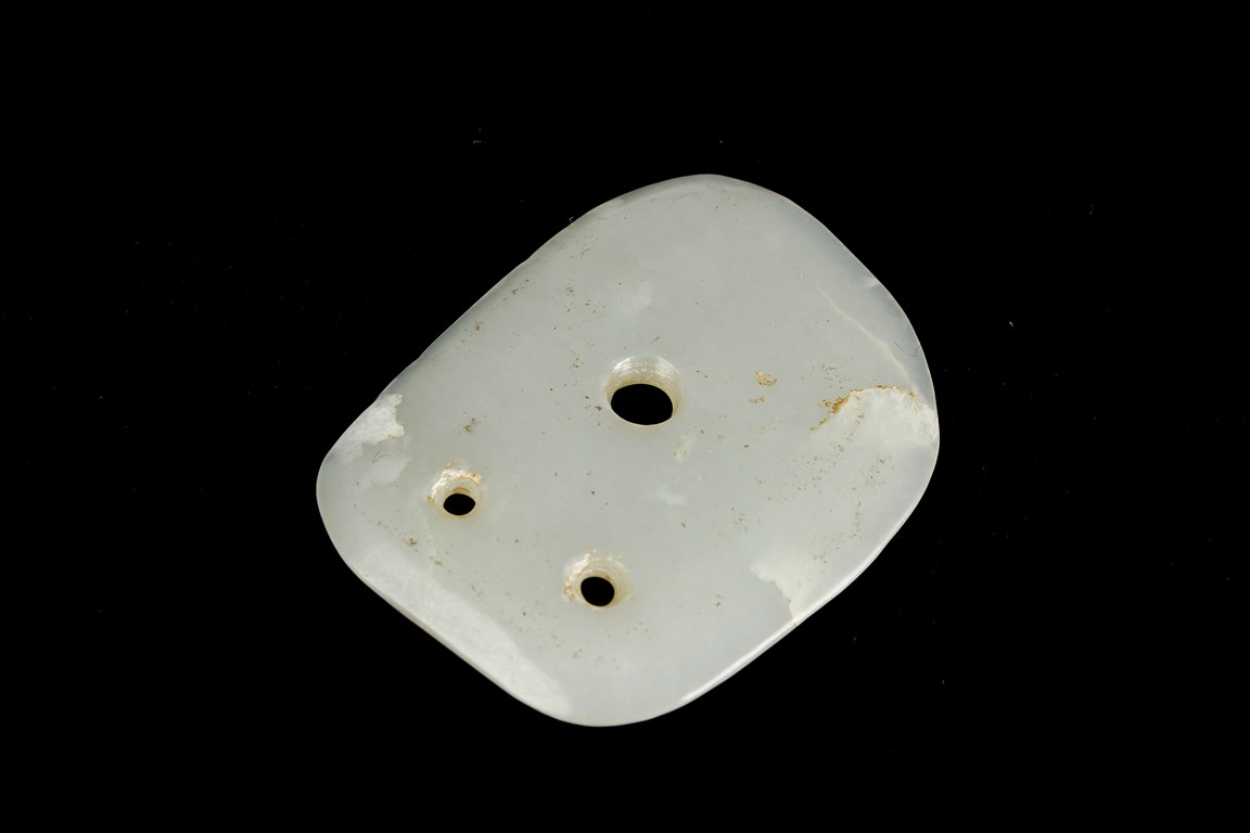 Each white jade shaped irregularly, with two smaller hole and one large hole in the center in triangular shape; the stone of translucent white color, with a little russet. Qing Dynasty period.