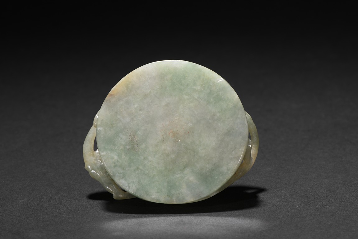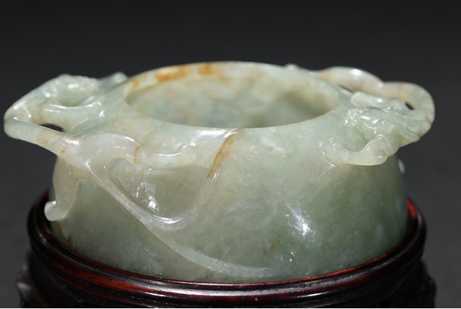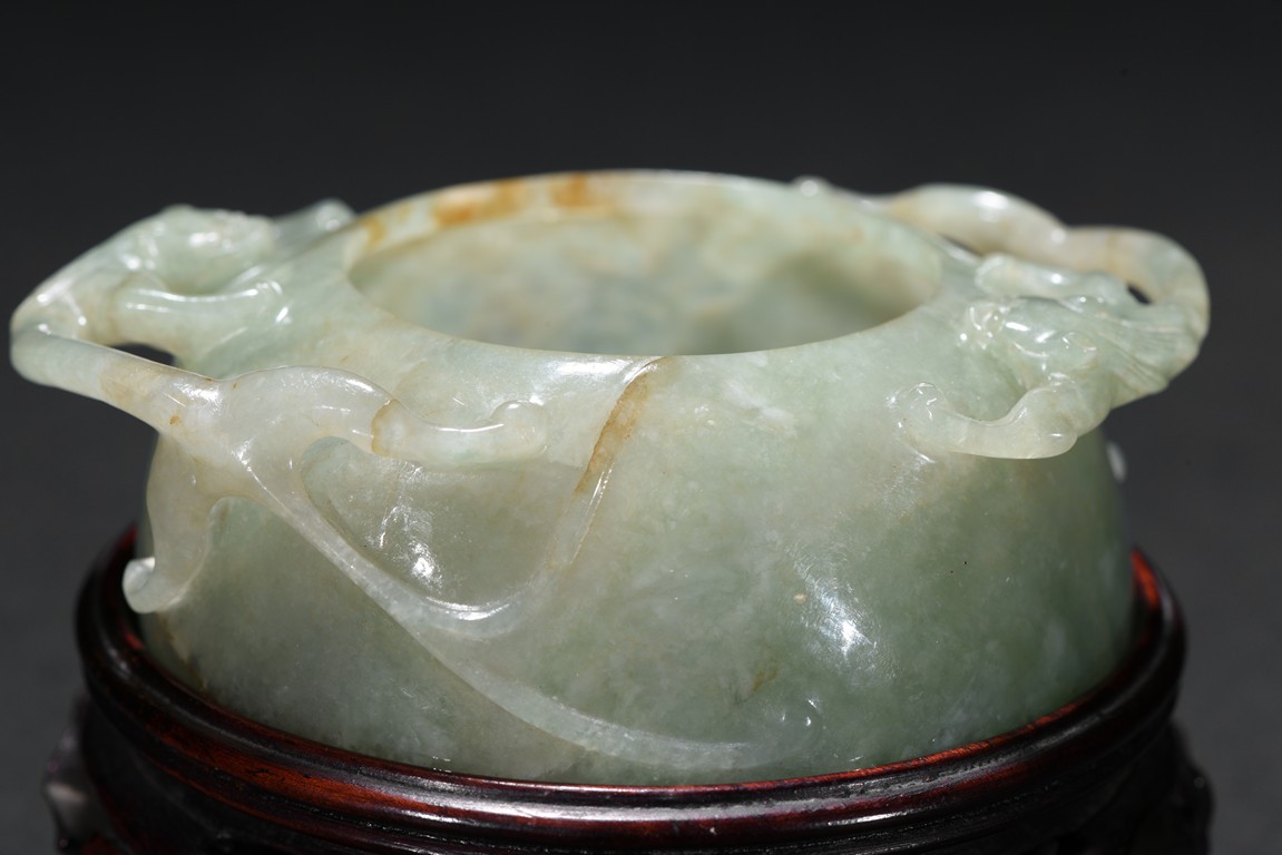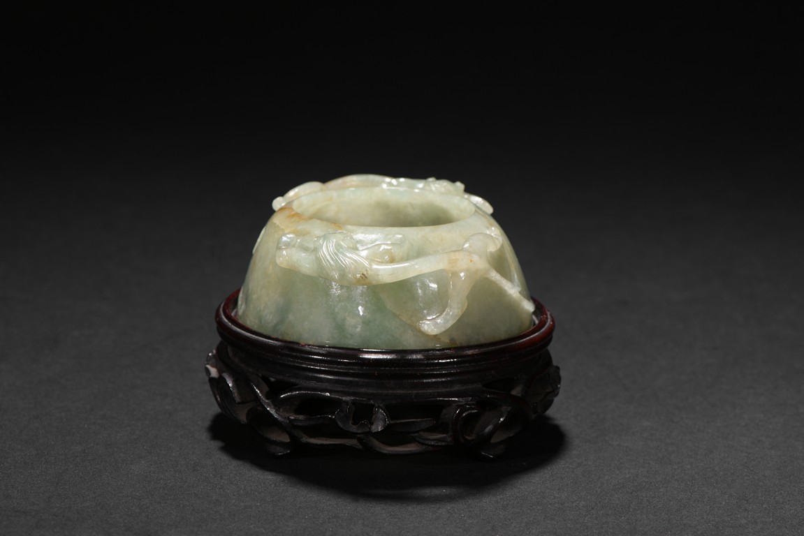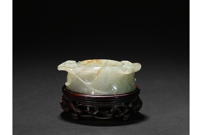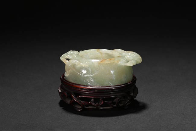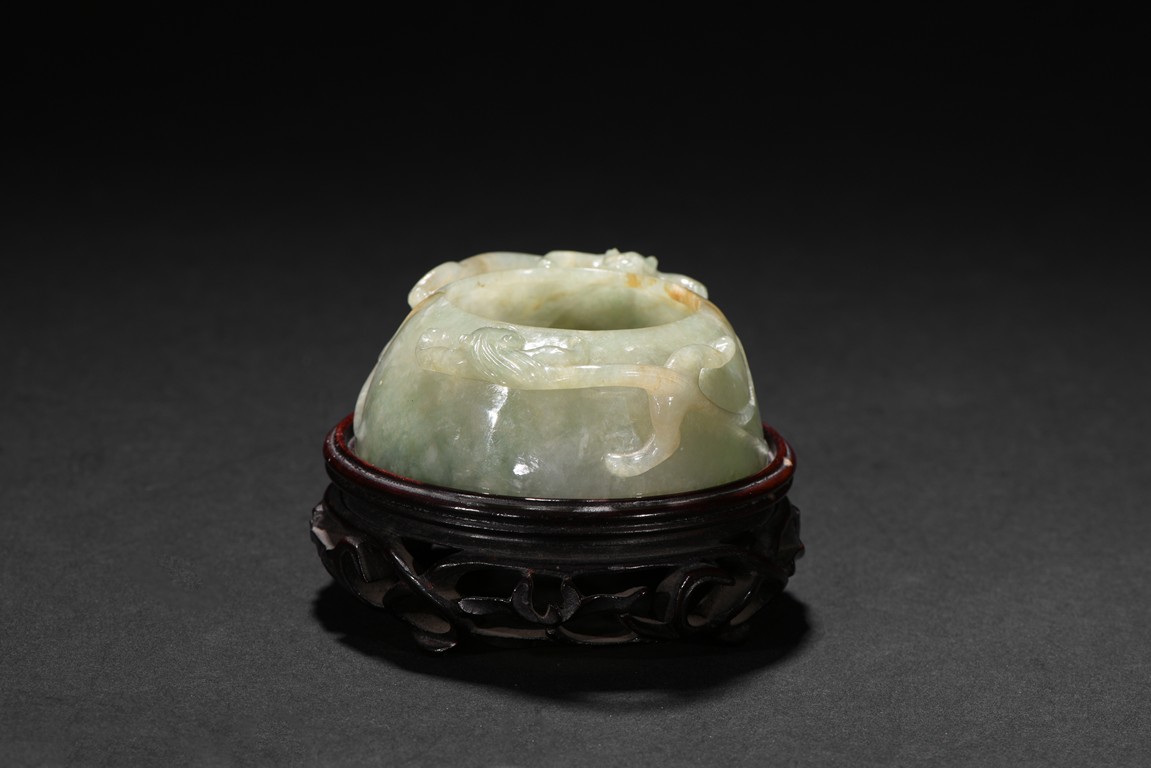 Of compressed globular form, the waterpot is finely carved with two writhing chilong on both sides of the exterior in high relief, the body rising to a circular opening. The stone is of translucent greenish white tone with some russet markings along the rim. Qing Dynasty period.