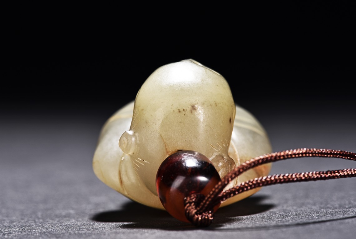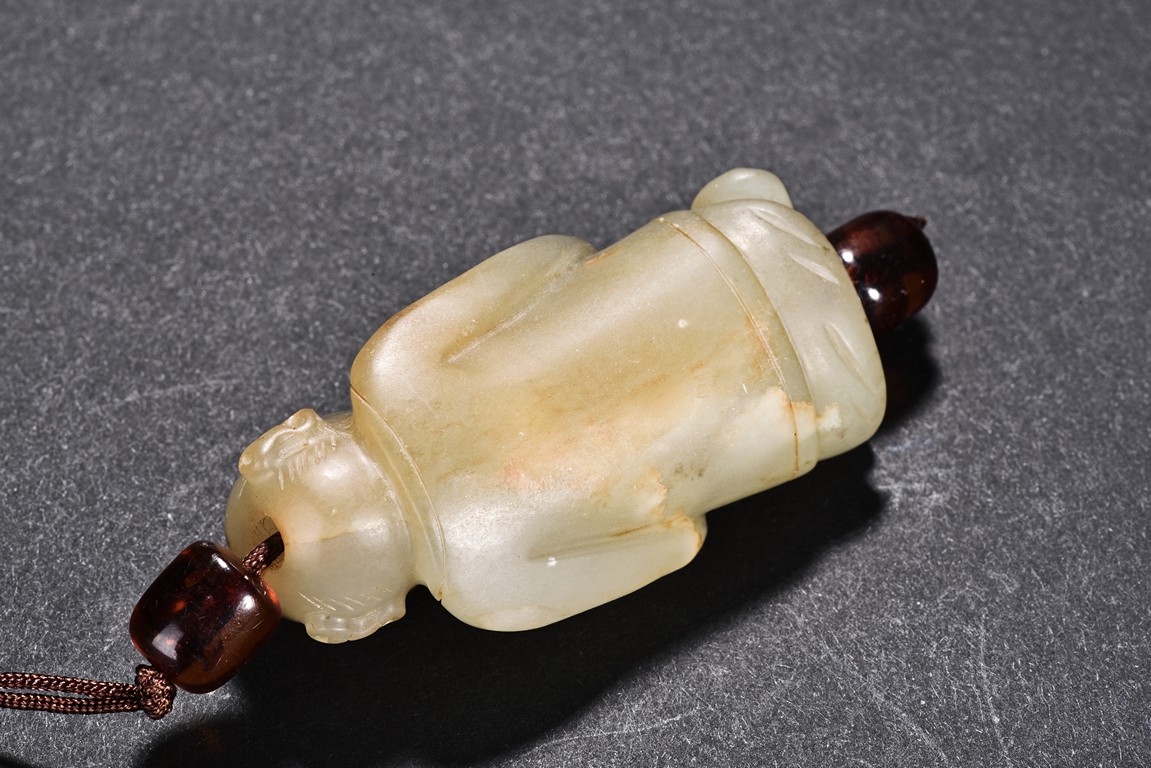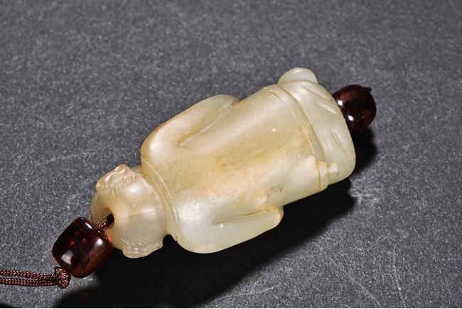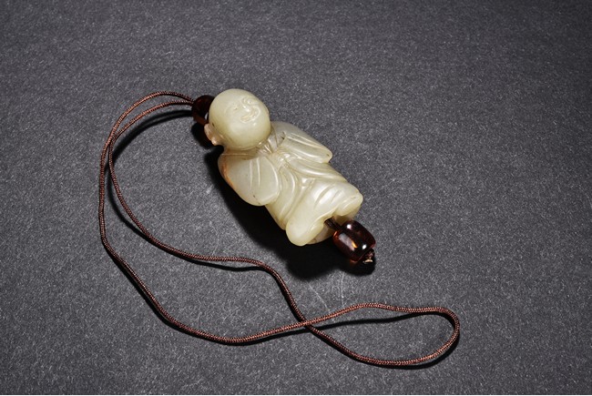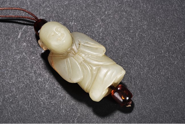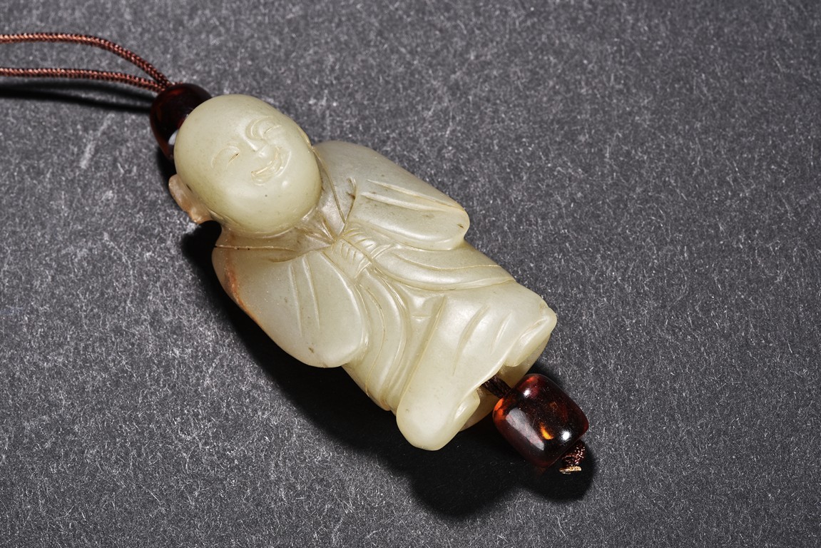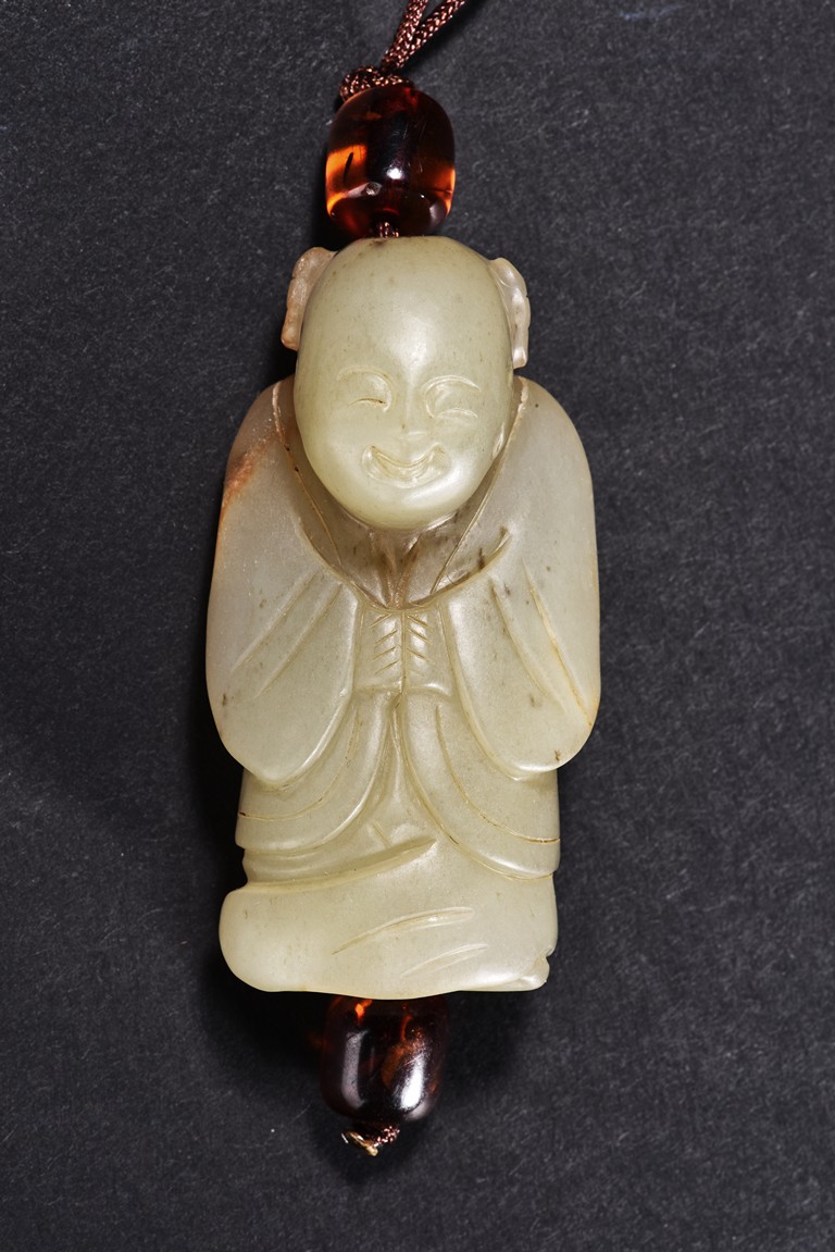 The figure is carved with hands clasped together, wearing a loose robe, the face carved with joyful expression, with amber beads on the string. Ming Dynasty period.