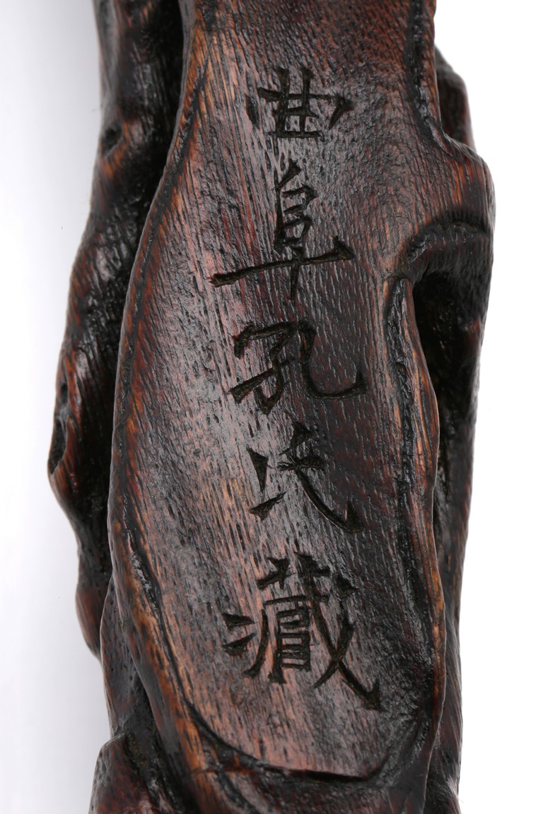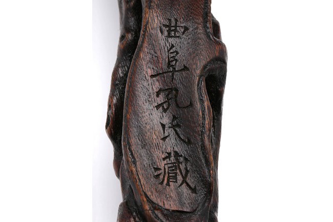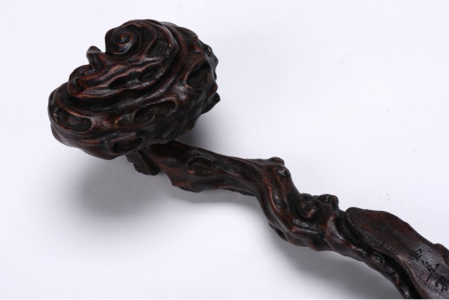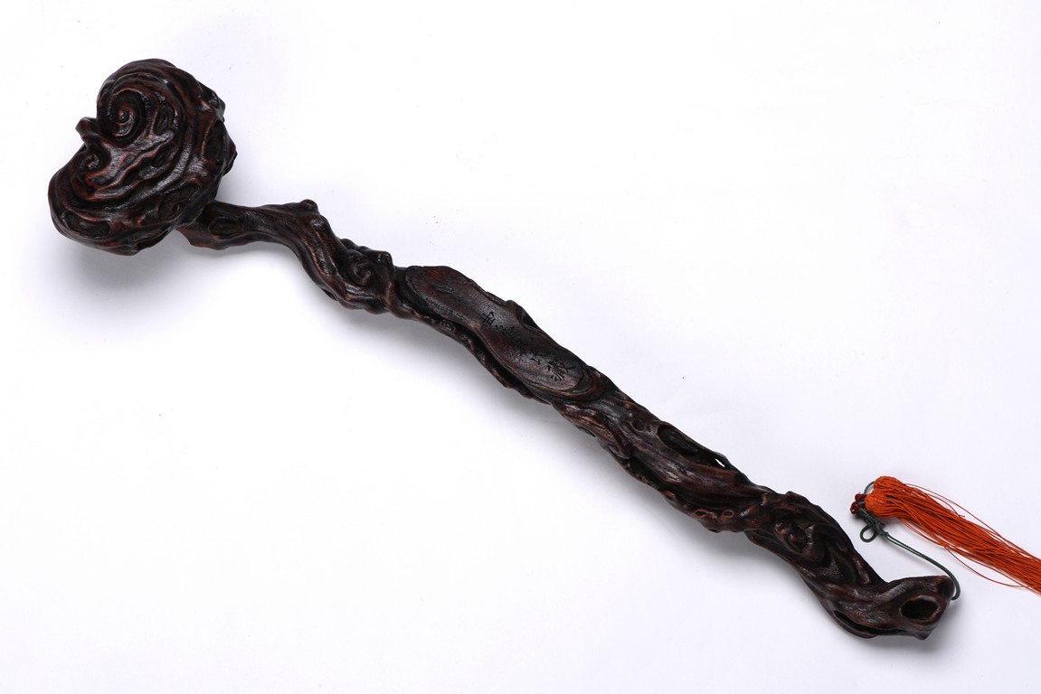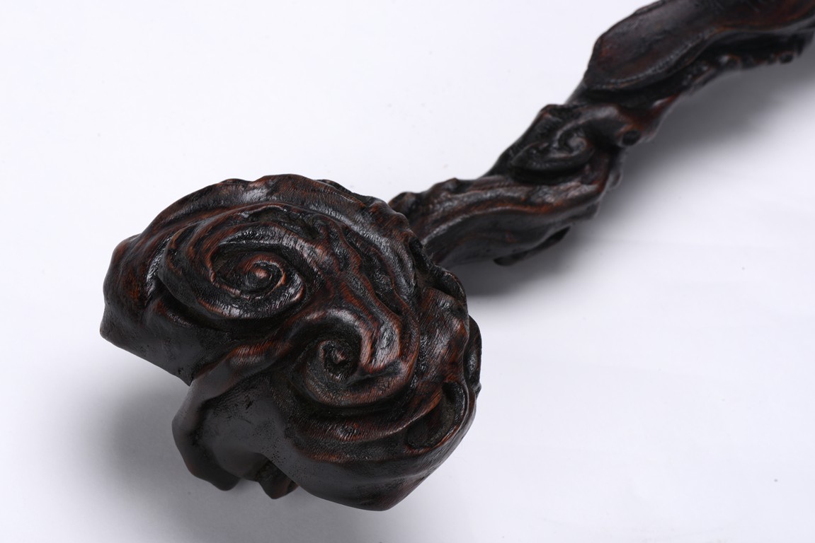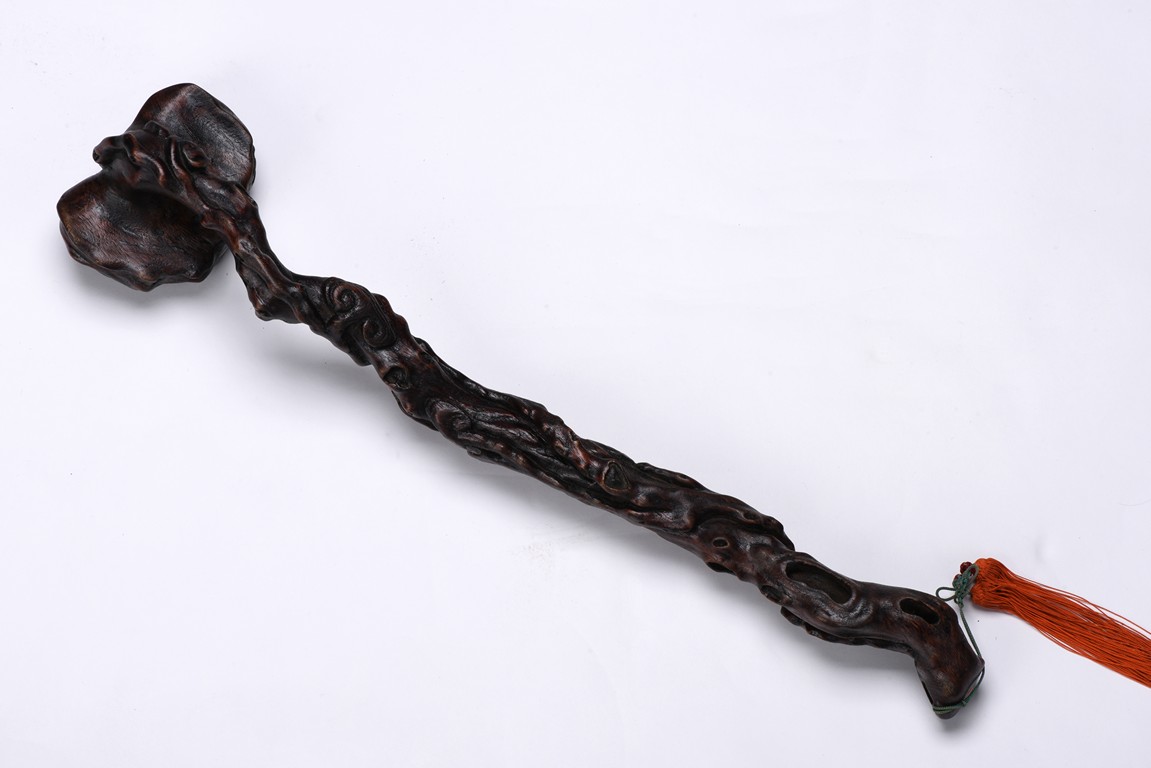 Modelled in the form of gnarled wood branch as handle, the ruyi head carved after the form of lingzhi head. Qing Dynasty period.