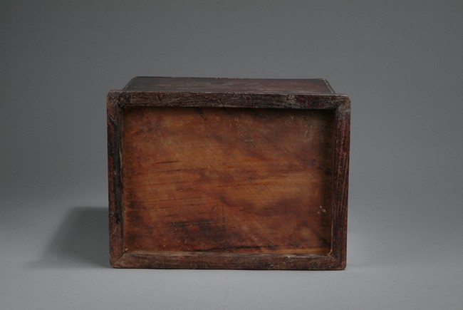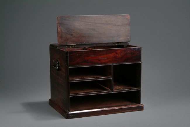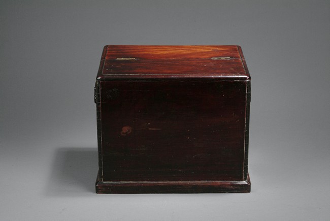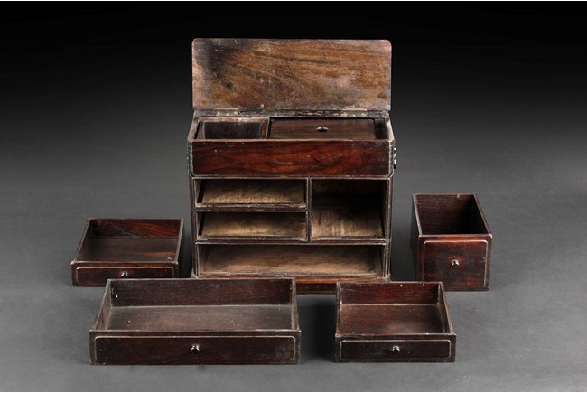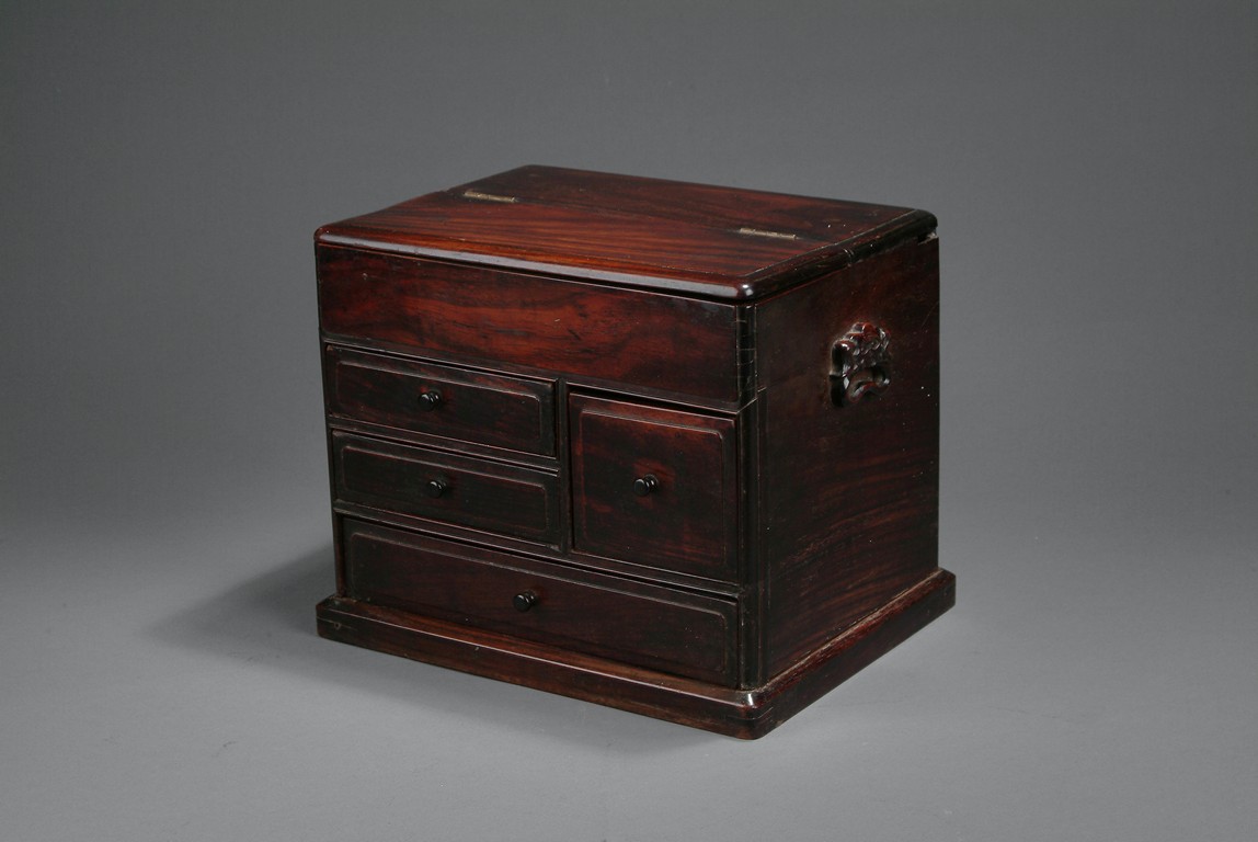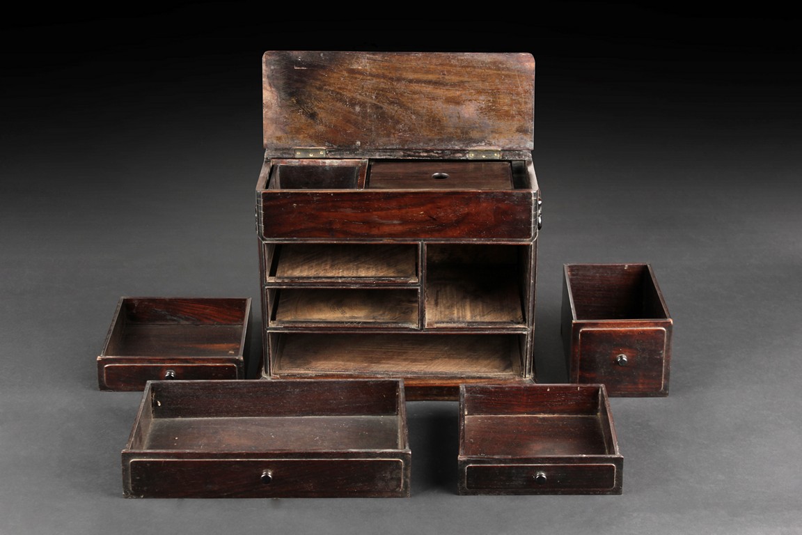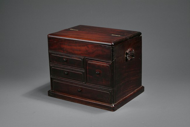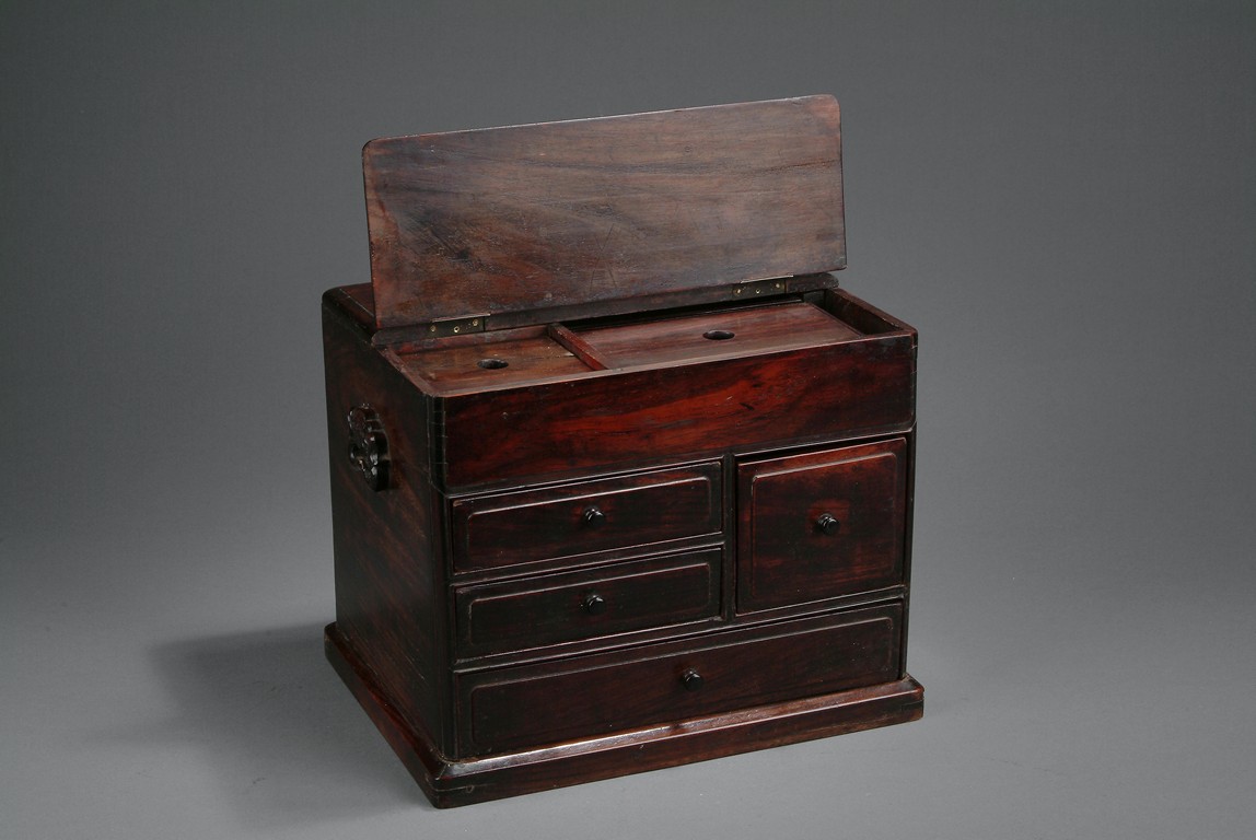 Of rectangular shape, the front of cabinet has four drawers, three rectangular and one square. The top opens to a two-compartment storage, one square and one rectangular. Deep and rich natural color all around, with two handles on the side. Qing Dynasty period.