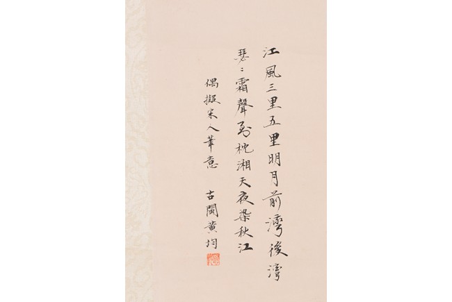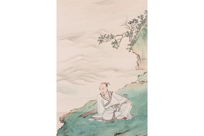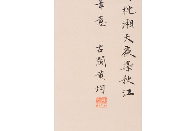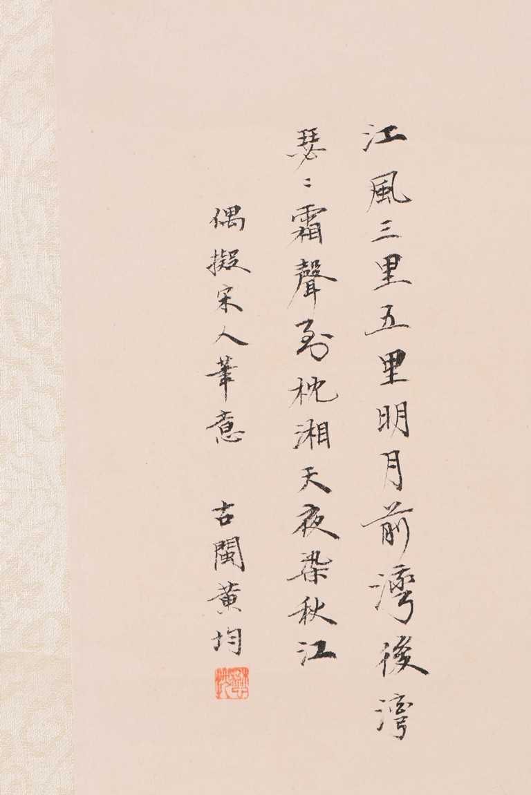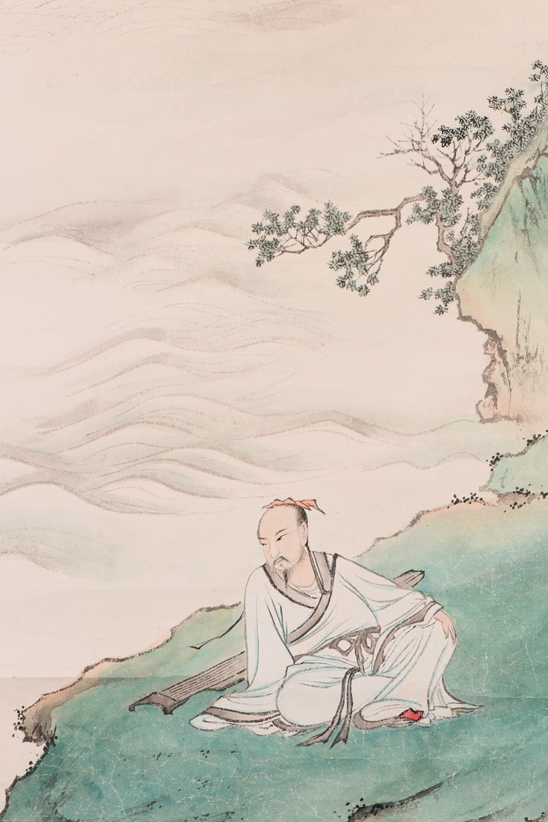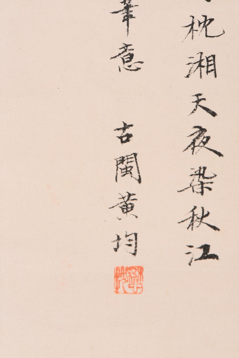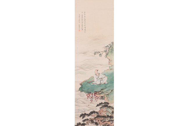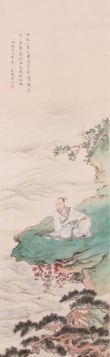 Ink and color on paper. Landscape figures. Hanging scroll. Signed Huangjun and with one seal of the artist.