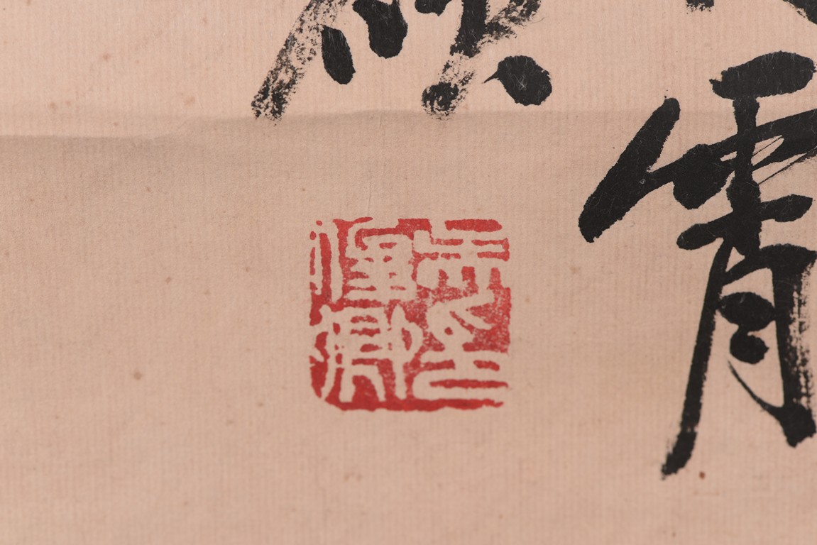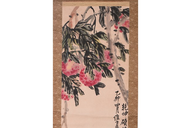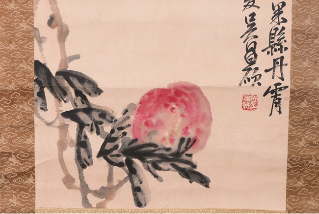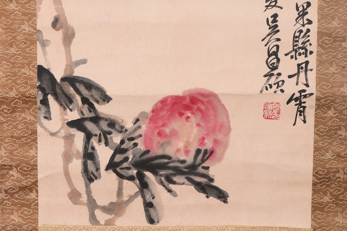 Ink and color on paper. Longevity peach. Hanging scroll. Signed and with one seal of the artist.