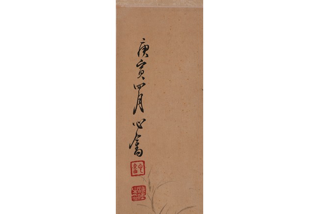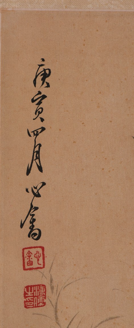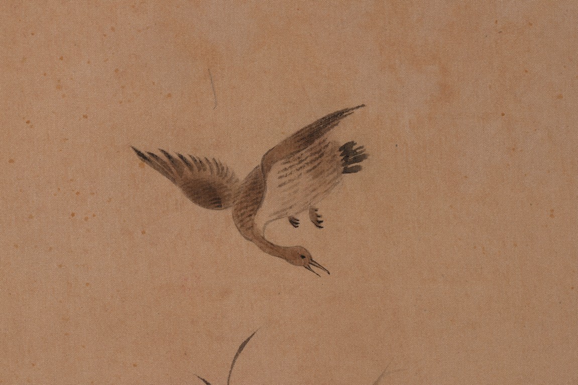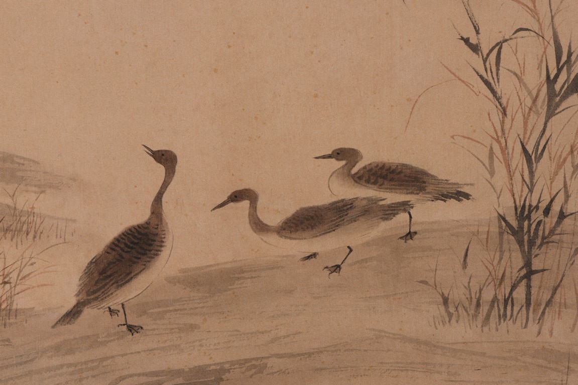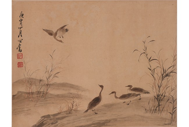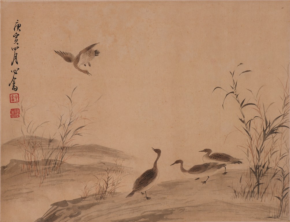 Ink and color on paper. Cranes. Signed Xinyu and with two seals of the artist.