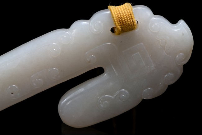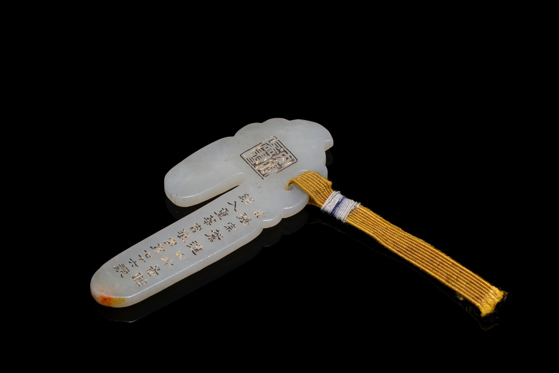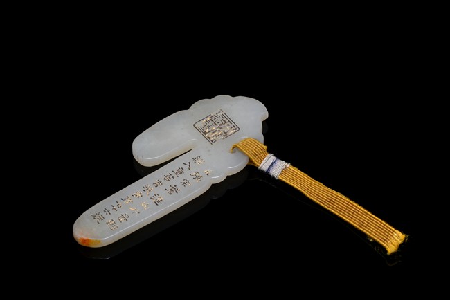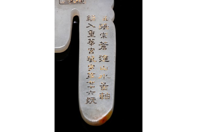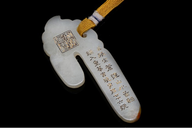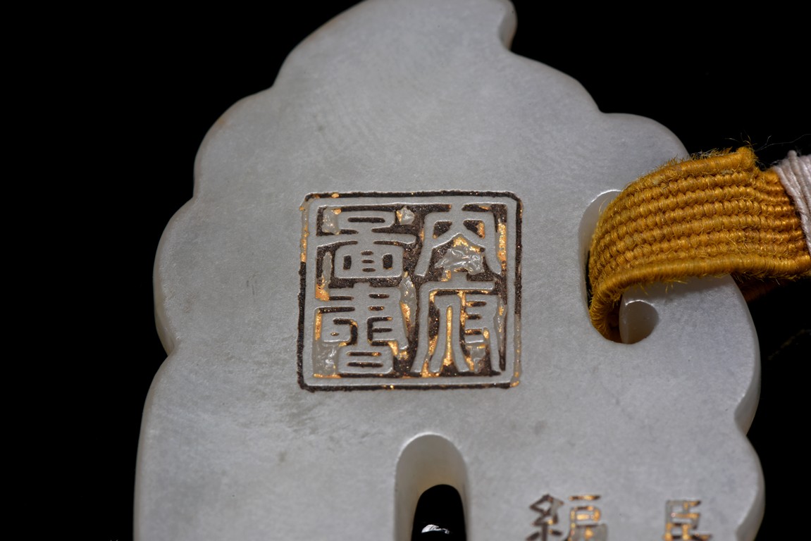 One side carved in low relief with archaistic scroll decorations, the reverse carved with a seal mark above an Imperial clerical-script inscriptions with traces of gilding. Qing Dynasty period.