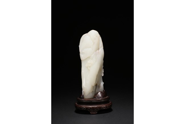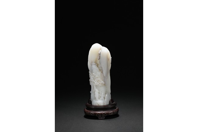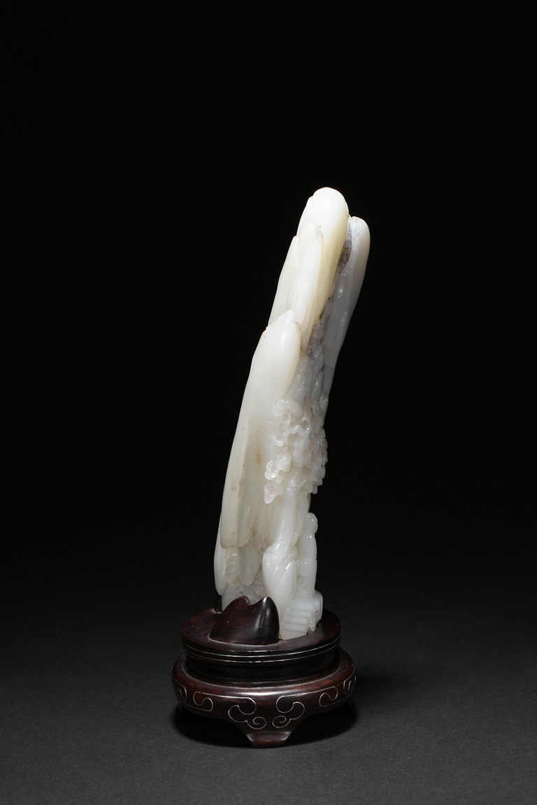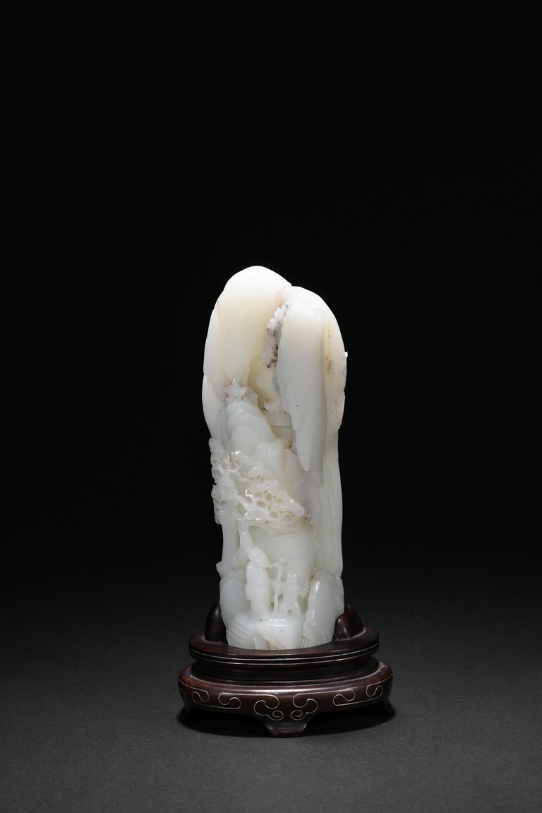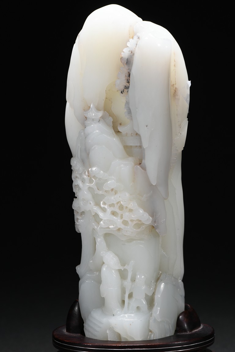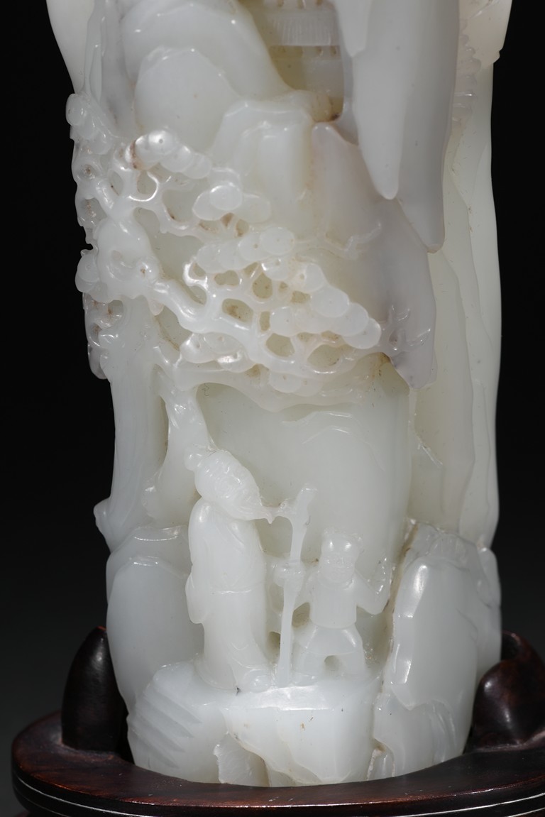 Of irregular boulder form, the pebble deeply carved to the front with a scholar and a young boy standing on jagged rocks at the entrance to the cave, the figures surrounded by overhanging rocks and pine trees and with steps to a pagoda behind them, the reverse similarly carved. Qing Dynasty period.