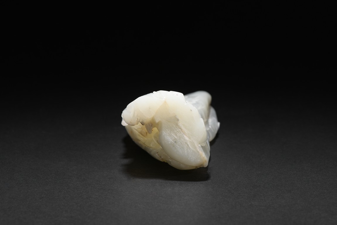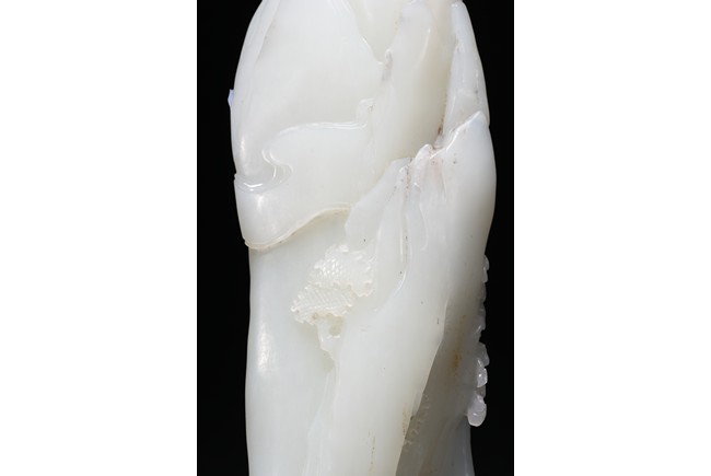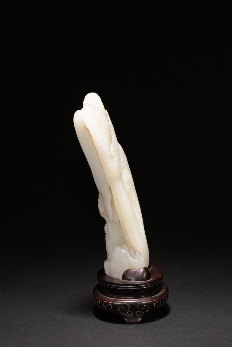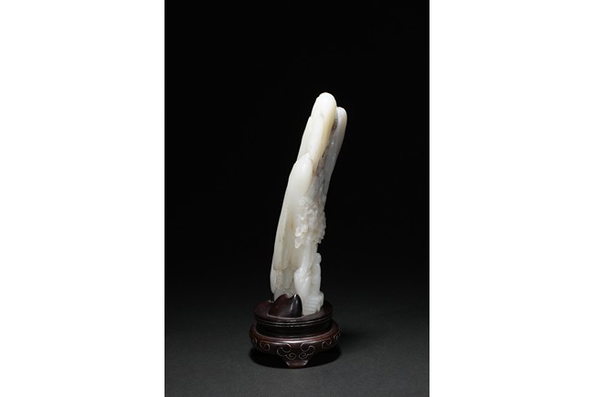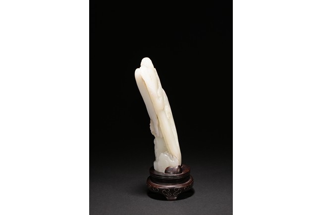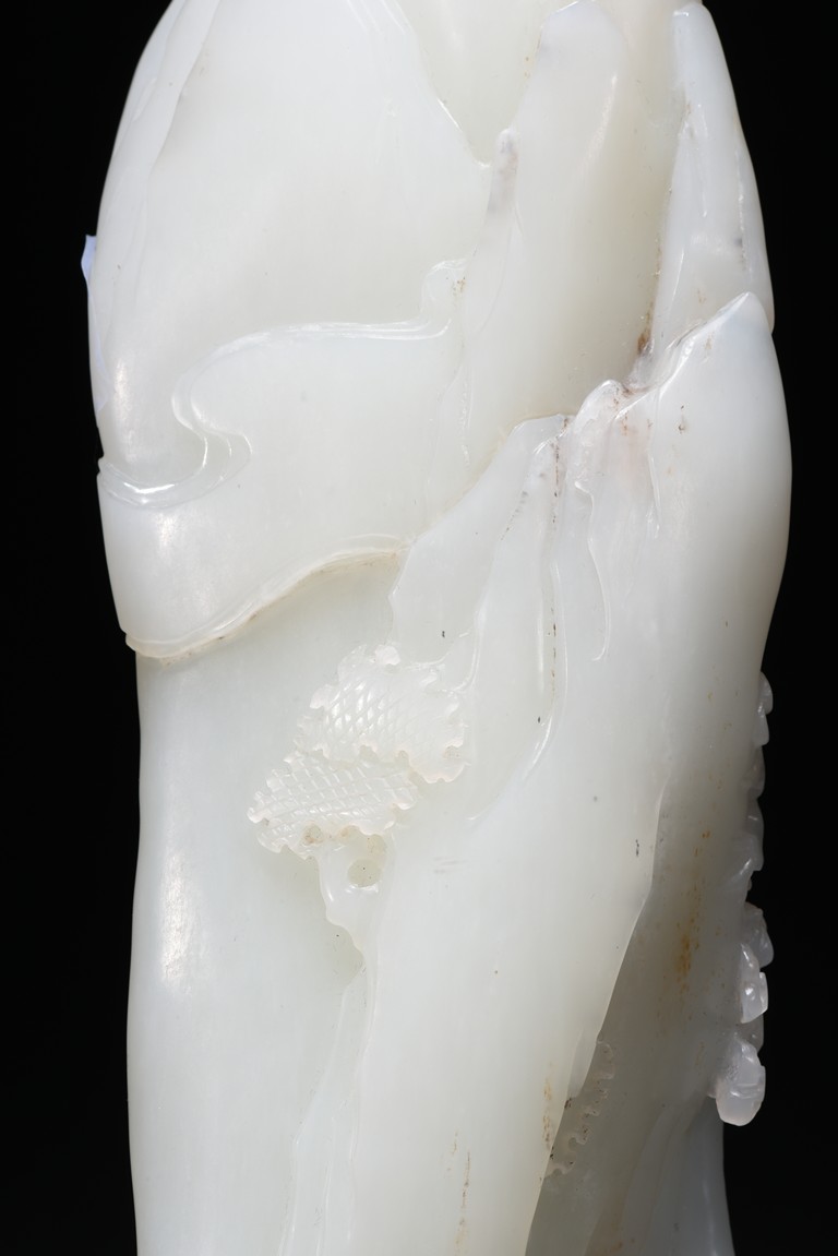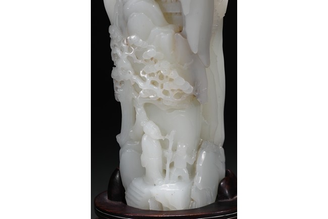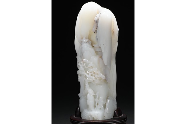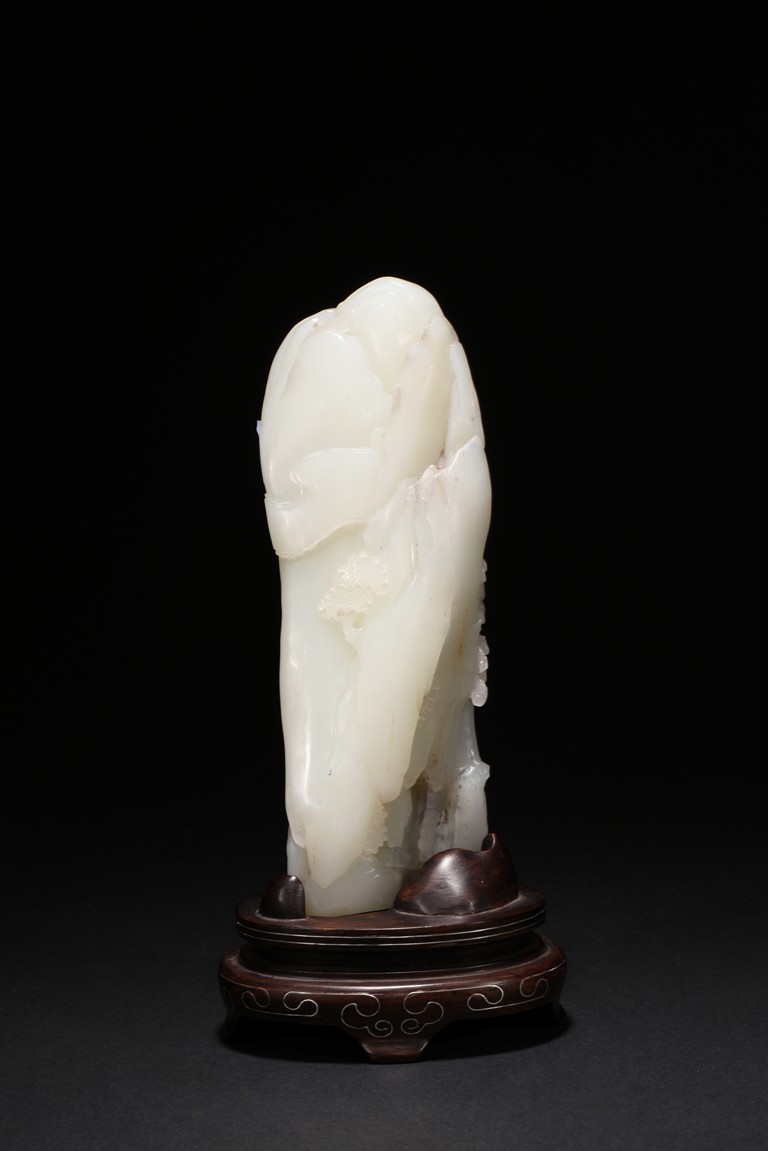 Of irregular boulder form, the pebble deeply carved to the front with a scholar and a young boy standing on jagged rocks at the entrance to the cave, the figures surrounded by overhanging rocks and pine trees and with steps to a pagoda behind them, the reverse similarly carved. Qing Dynasty period.