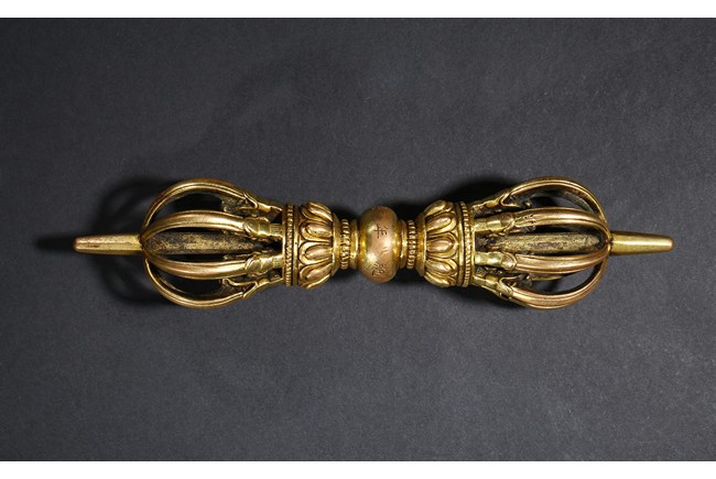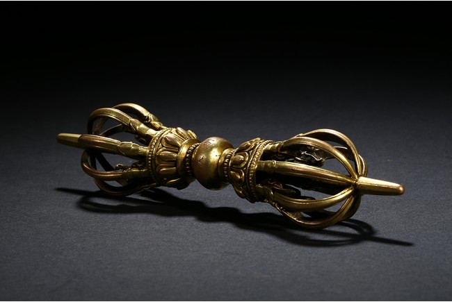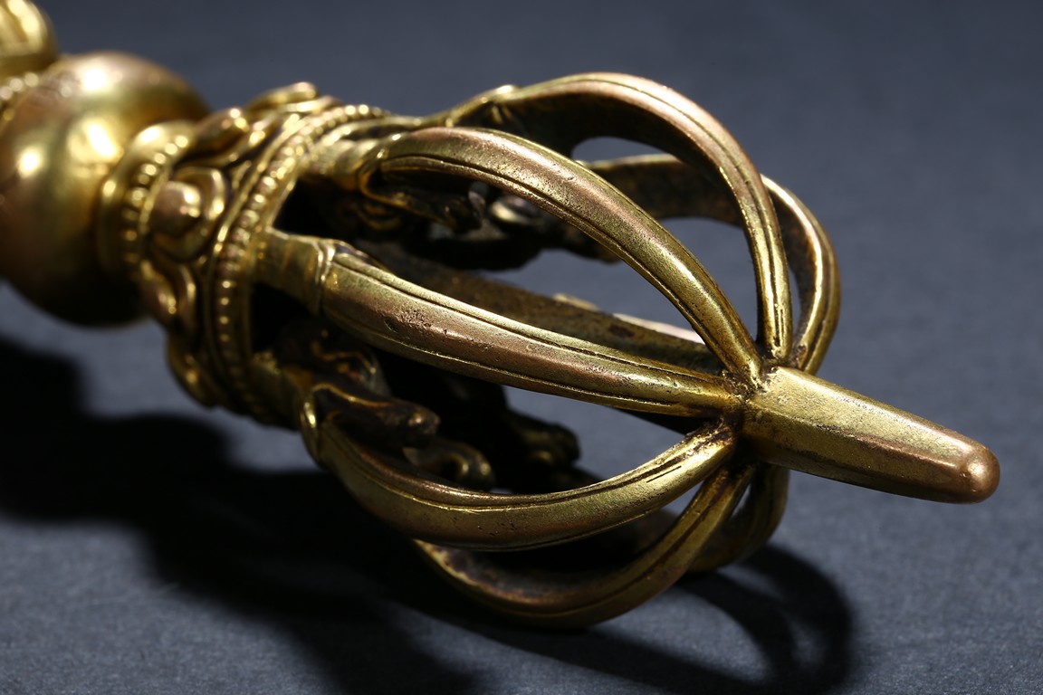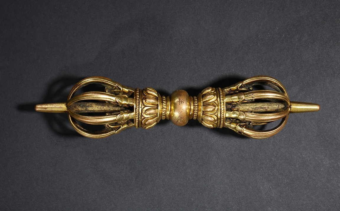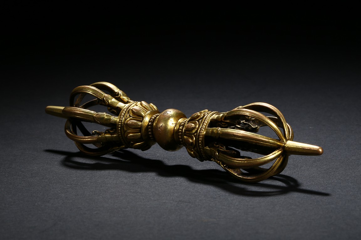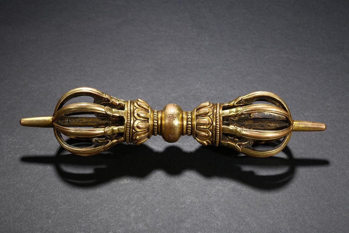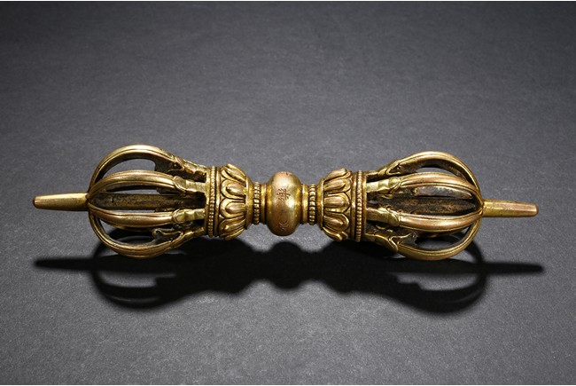 The elegant eight-pronged vajra with petal lotus foliate elements close to the center, with double band of small gilt-bronze alloy pearls at center, around the center compressed globular body incised with 'Yongle' six-character mark. Ming Dynasty Yongle period.