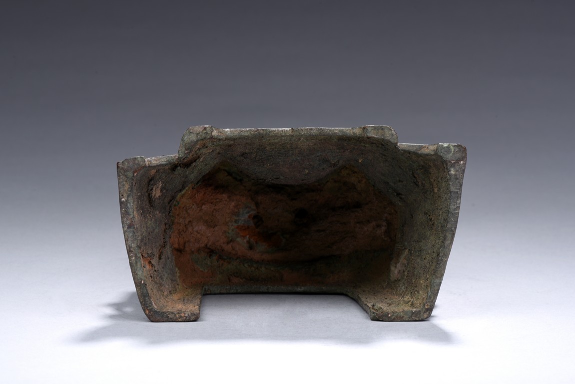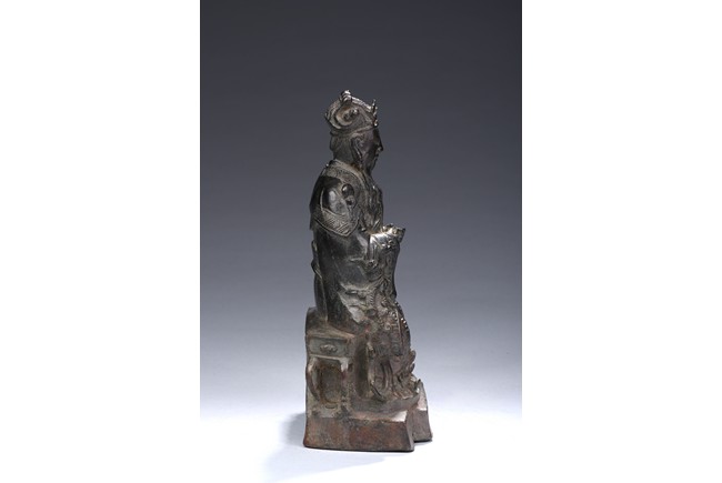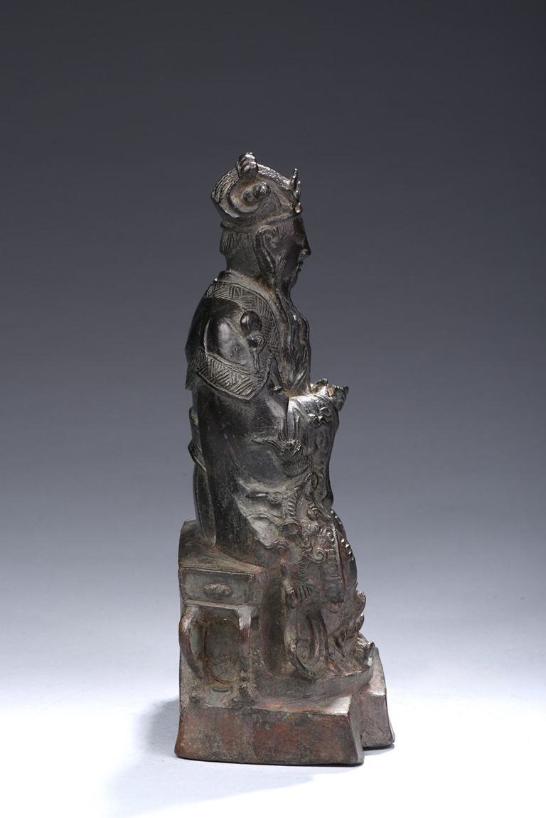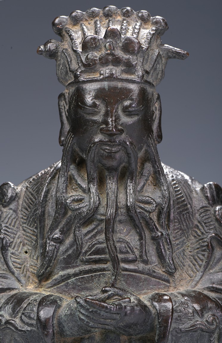 The immortal is cast seated with both hands clasped together in front of his chest, wearing a long flowing robe with decorations, his face with calm expression, long moustache and beard, surmounted with a high court hat. Early Qing Dynasty period.
