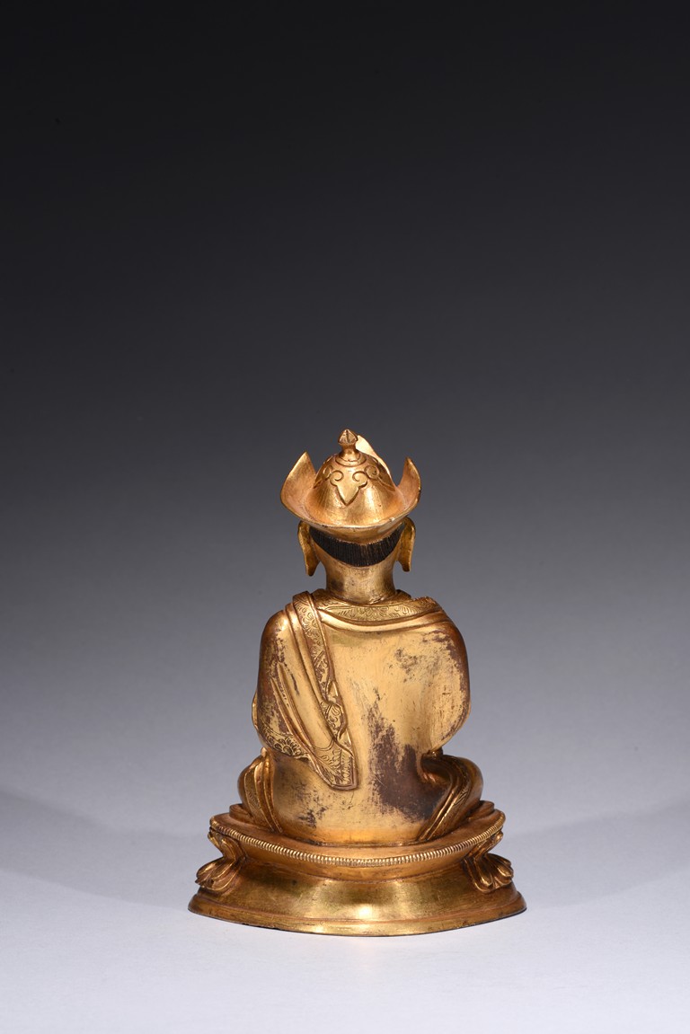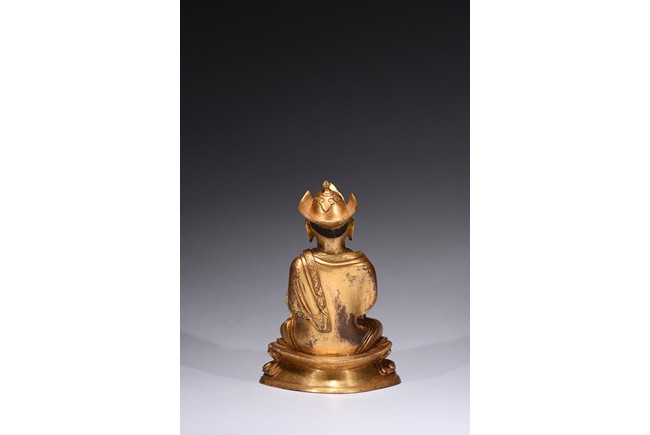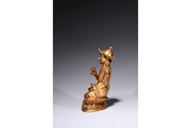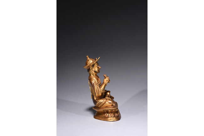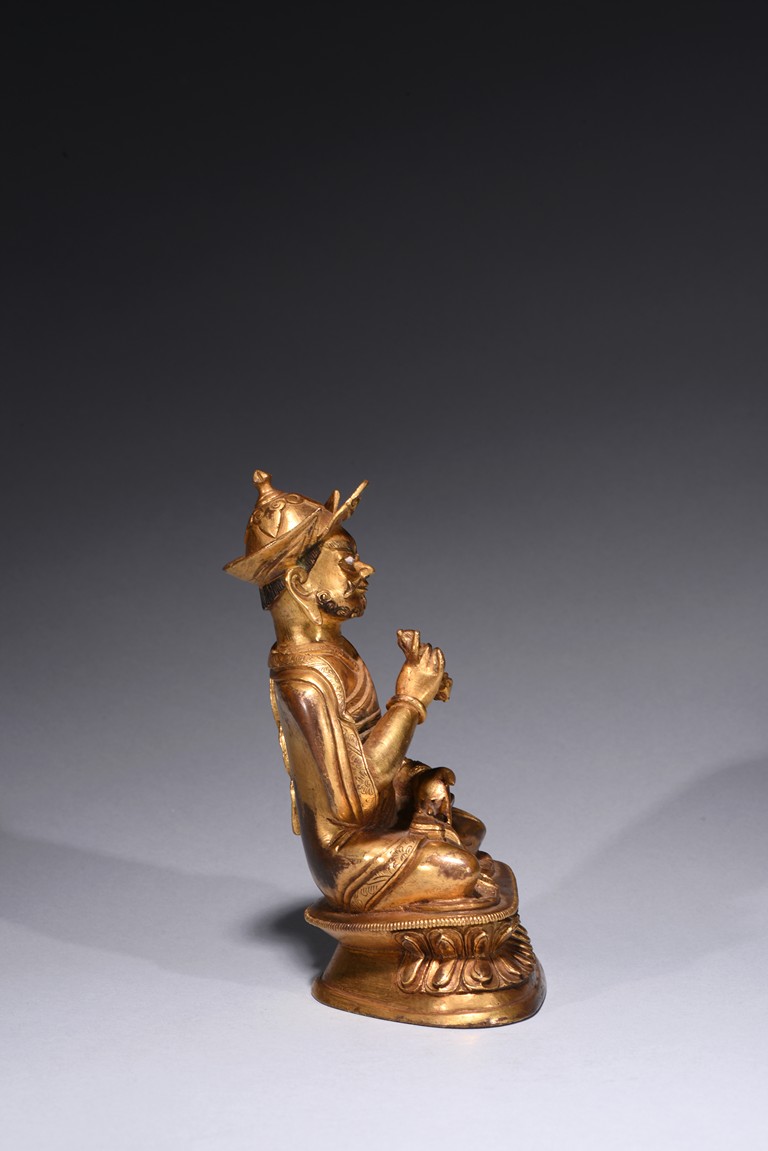 Shown seated in dhyanasana on a double lotus throne, right hand raised holding a vajra, wearing dhoti with incised hems, face with intense expression, wearing pointed hat, overall richly gilt. Qing Dynasty period.