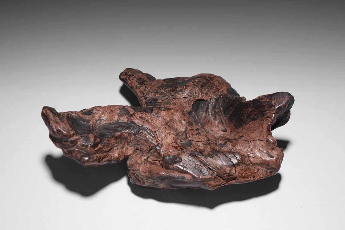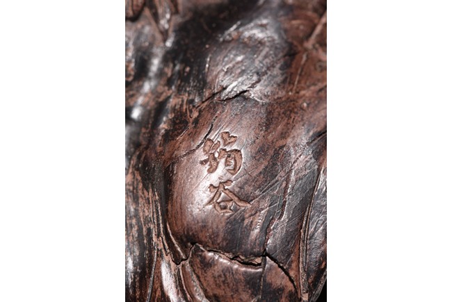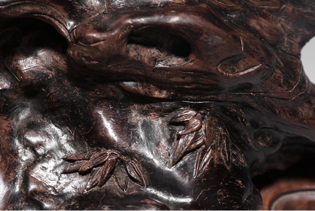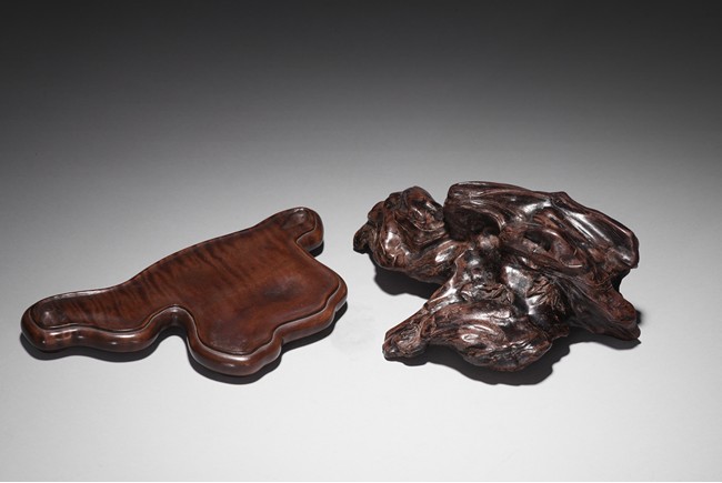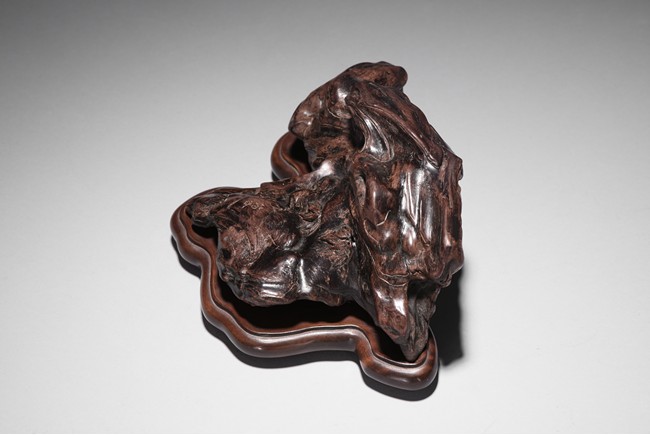 The carving is modelled after a smooth and irregular shaped scholar's rock, with crevices and leaves on the surface, the front incised with two character artist's signature 'JUN GU', all supported on a rosewood stand. Qing Dynasty period.