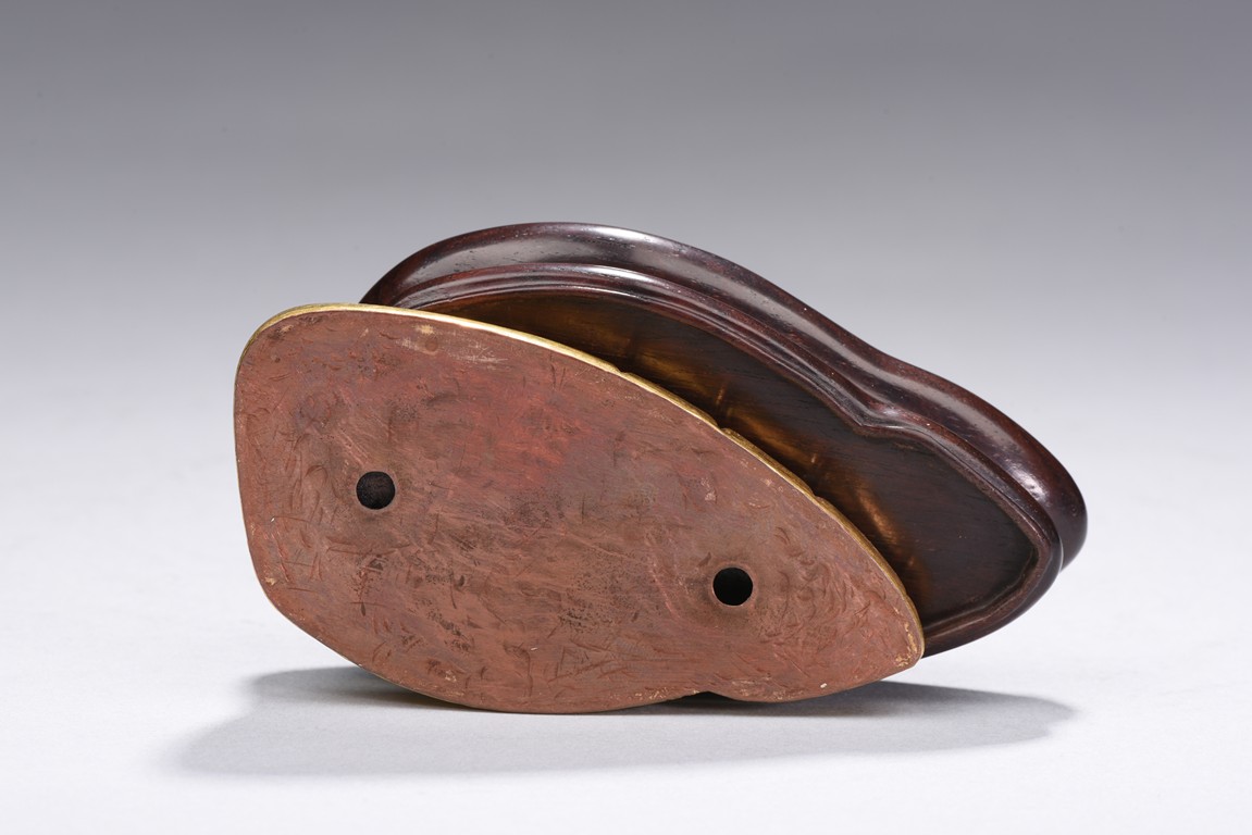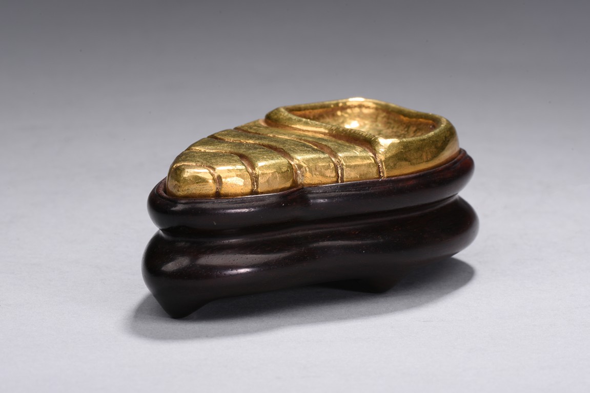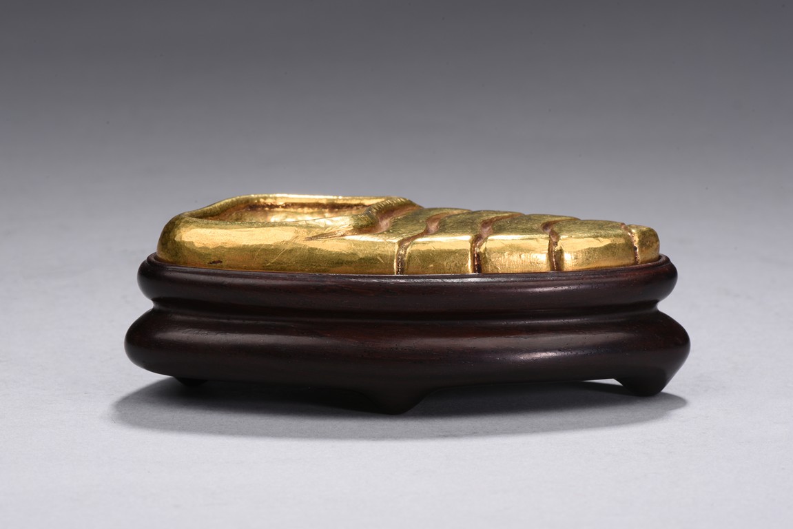 Modelled in the form of a shell, overall finely gilt, one side with a concave well, all fitted on a rosewood stand. Qing Dynasty period.