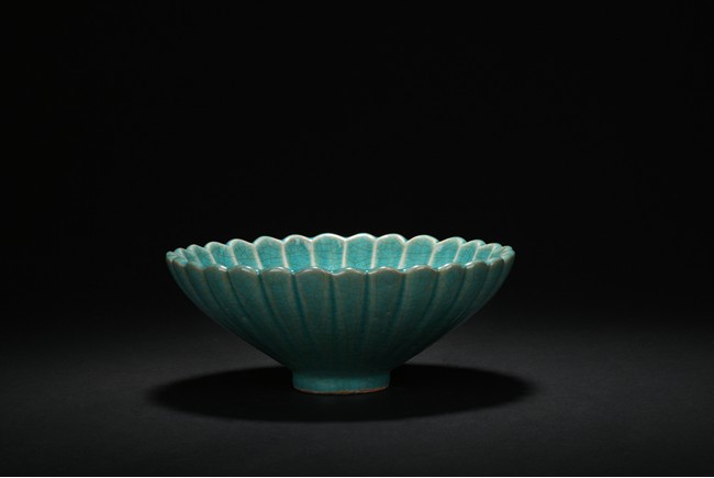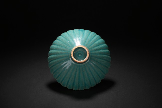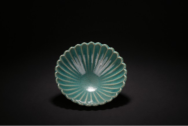The rounded fluted sides rising from a tapering foot to a scalloped rim, moulded with form of chrysanthemum petals, covered overall in an even dark green glaze.