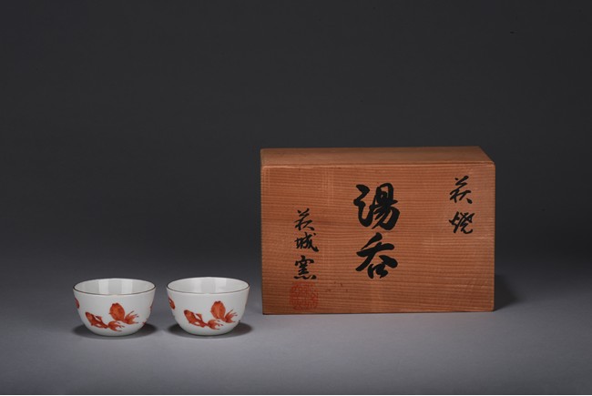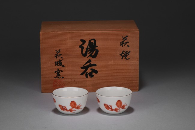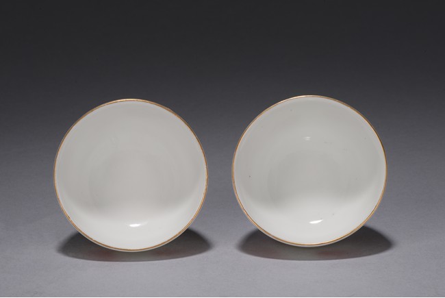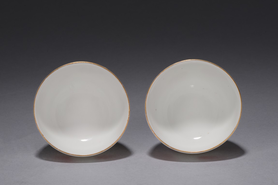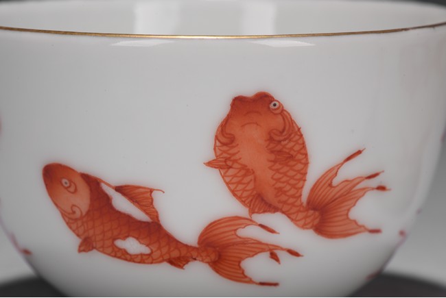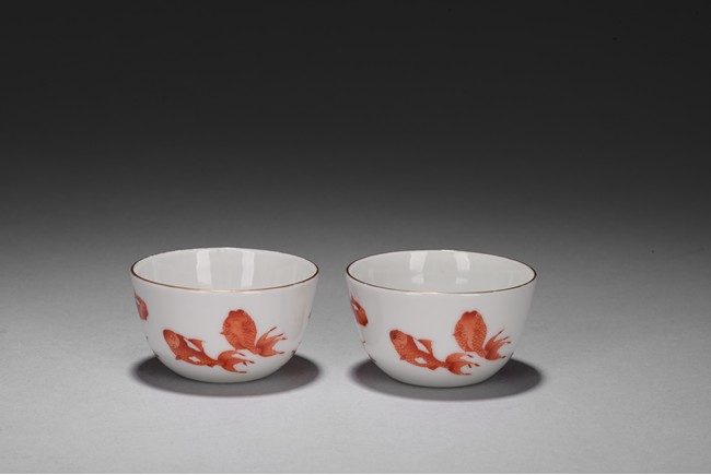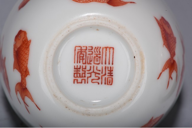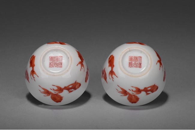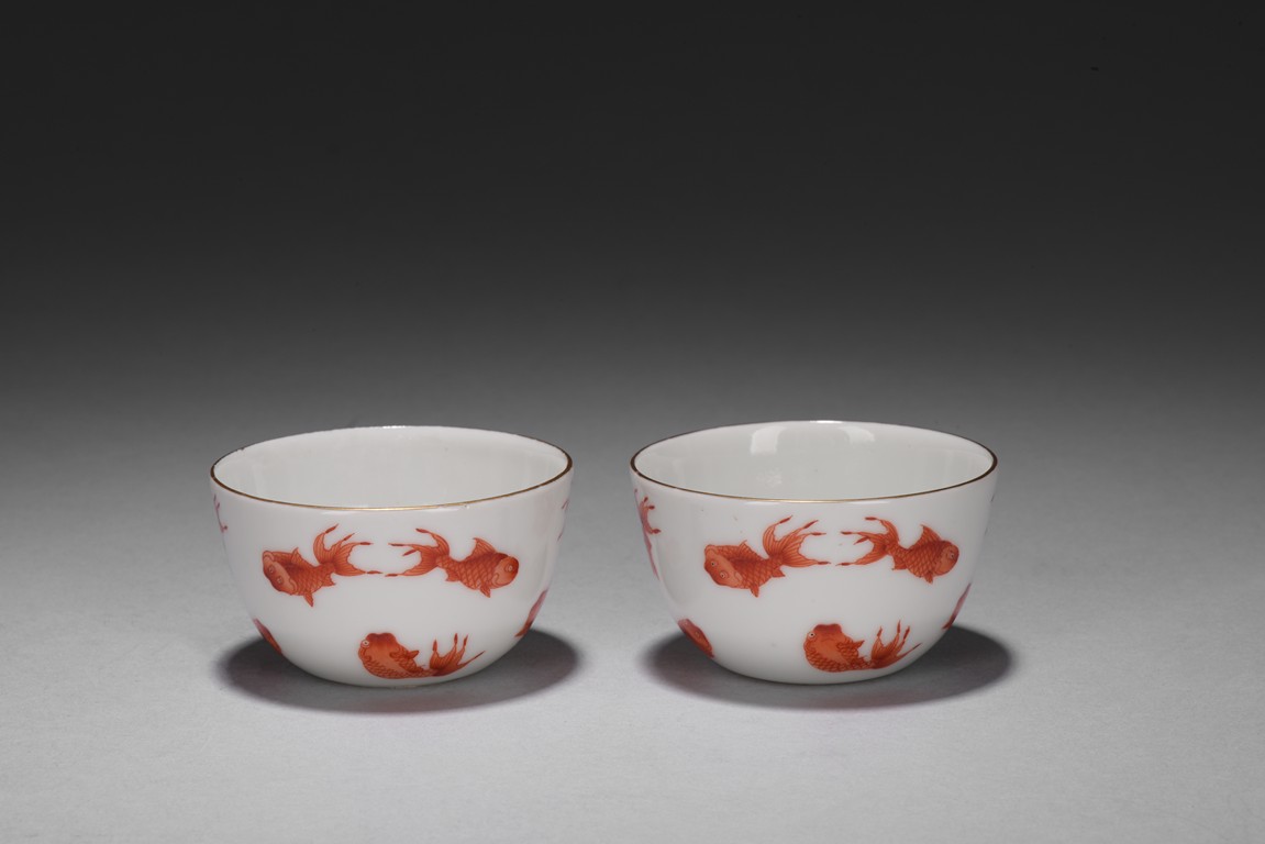 Each finely potted with gently curved sides, the exterior with various styles of goldfish in orange-red glaze reserved on bright white grounds, with a gilt ring encircling the rim, the base with a six character mark. Qing Dynasty period.