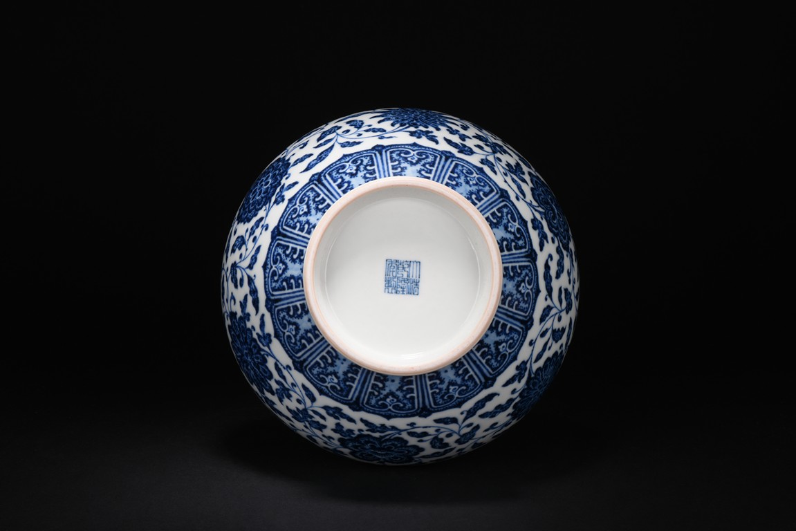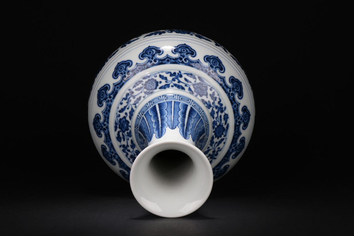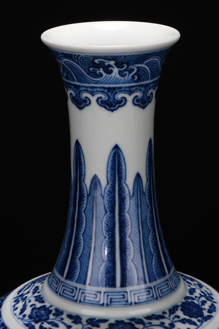 Of slightly compressed globular form rising from a splayed foot to a tall waisted neck, well painted in deep tones of cobalt around the body with a large foliate scroll of chrysanthemum, above petal panels and a 'classic' scroll encircling the foot and below a border of pendent ruyi and scrolling flowers around the shoulder, all divided by single or double raised ribs, the neck collared with plantain leaves rising from a border of key-fret, below pendent ruyi and a band of tumultuous waves at the mouth rim, the base with a six-character seal mark. Qing Dynasty period.