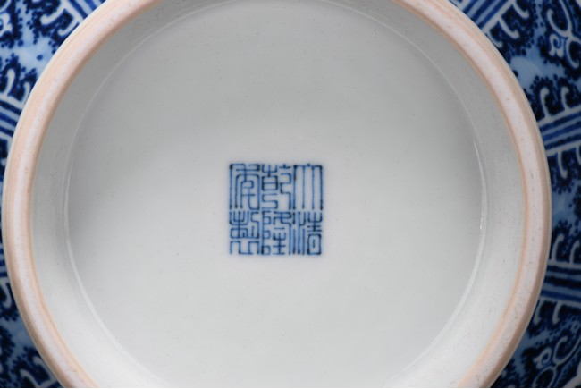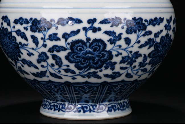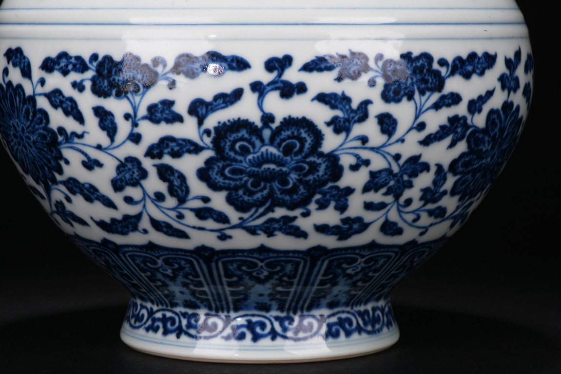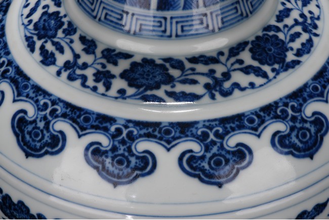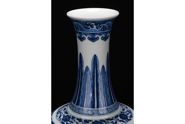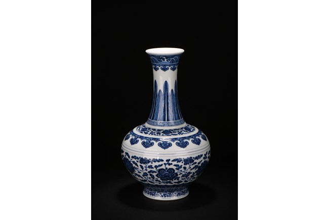 賞瓶為雍正時期督窯官唐英所創樣式, 為傳統清代帝王賞賜功臣的器物。此賞瓶呈圓腹, 圈足, 細長頸, 自上而下繪海水紋, 如意紋, 腹身繪青花纏枝紋飾, 疏密有致,為典型清代官窯瓷器。 參考:《故宮博物院藏古陶瓷資料選萃》卷二,紫禁城出版社,2005年,頁203,圖179 Palace Museum Collection: Ancient Ceramics Volume Two, Beijing 2005, P.203 可參考一類似青花纏枝紋官窯賞瓶,售於倫敦蘇富比2013年10月08日,拍品號3027.