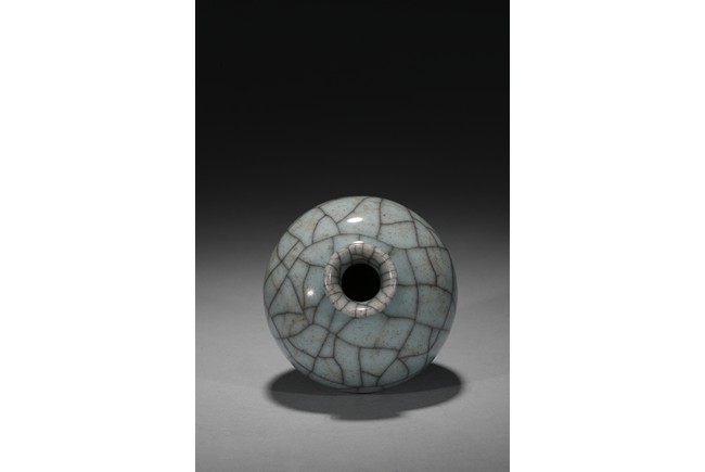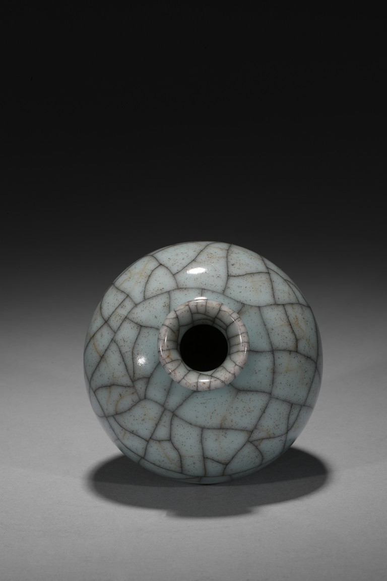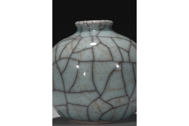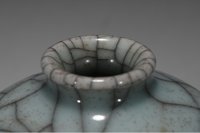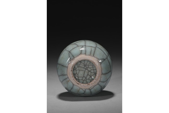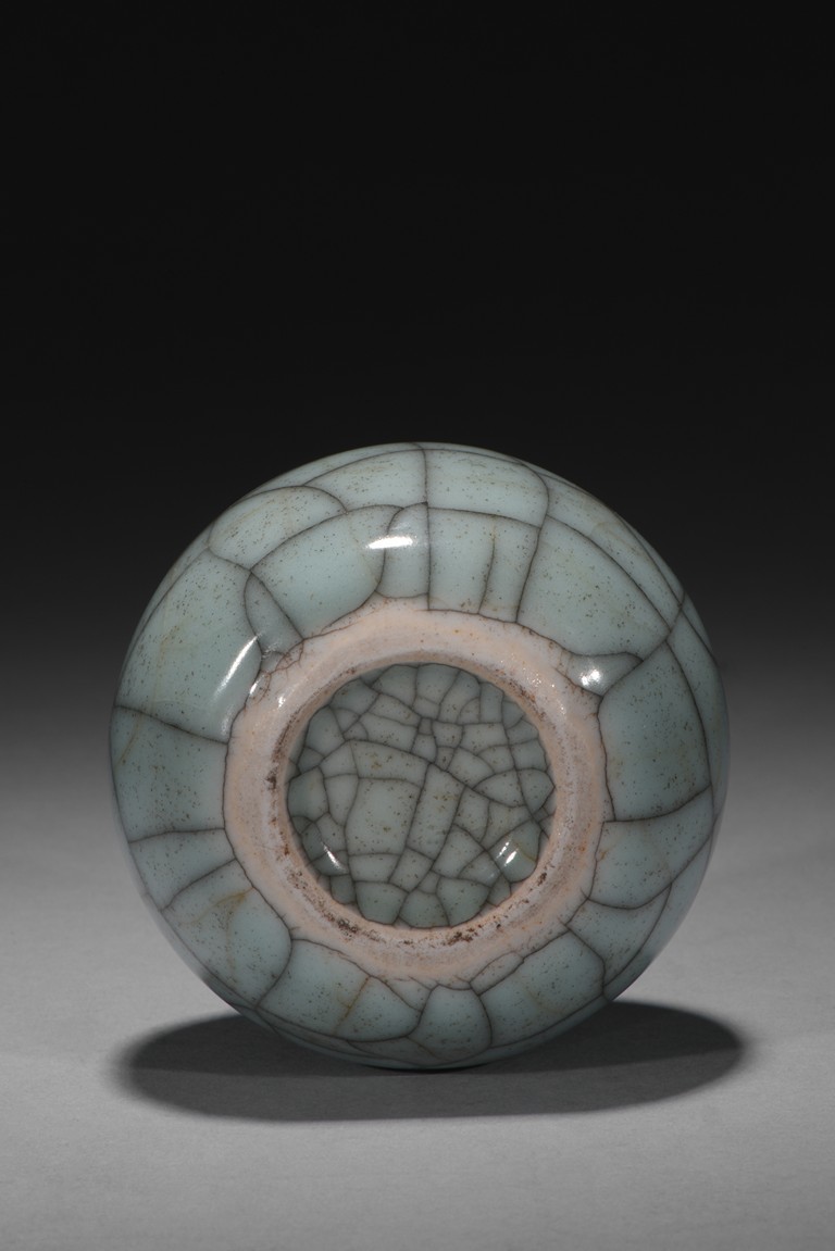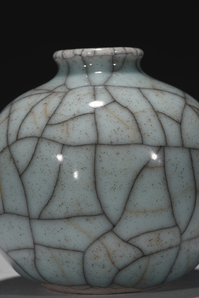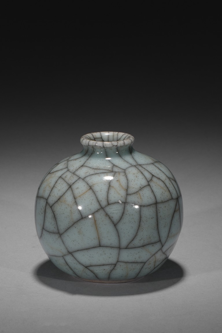 The robustly potted globular body rising to a short, waisted neck and an everted rim, covered overall in a pale greenish-grey glaze with a striking network of brownish and russet crackles, all supported on a low footring dressed in brown. Qing Dynasty period.
