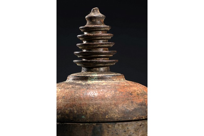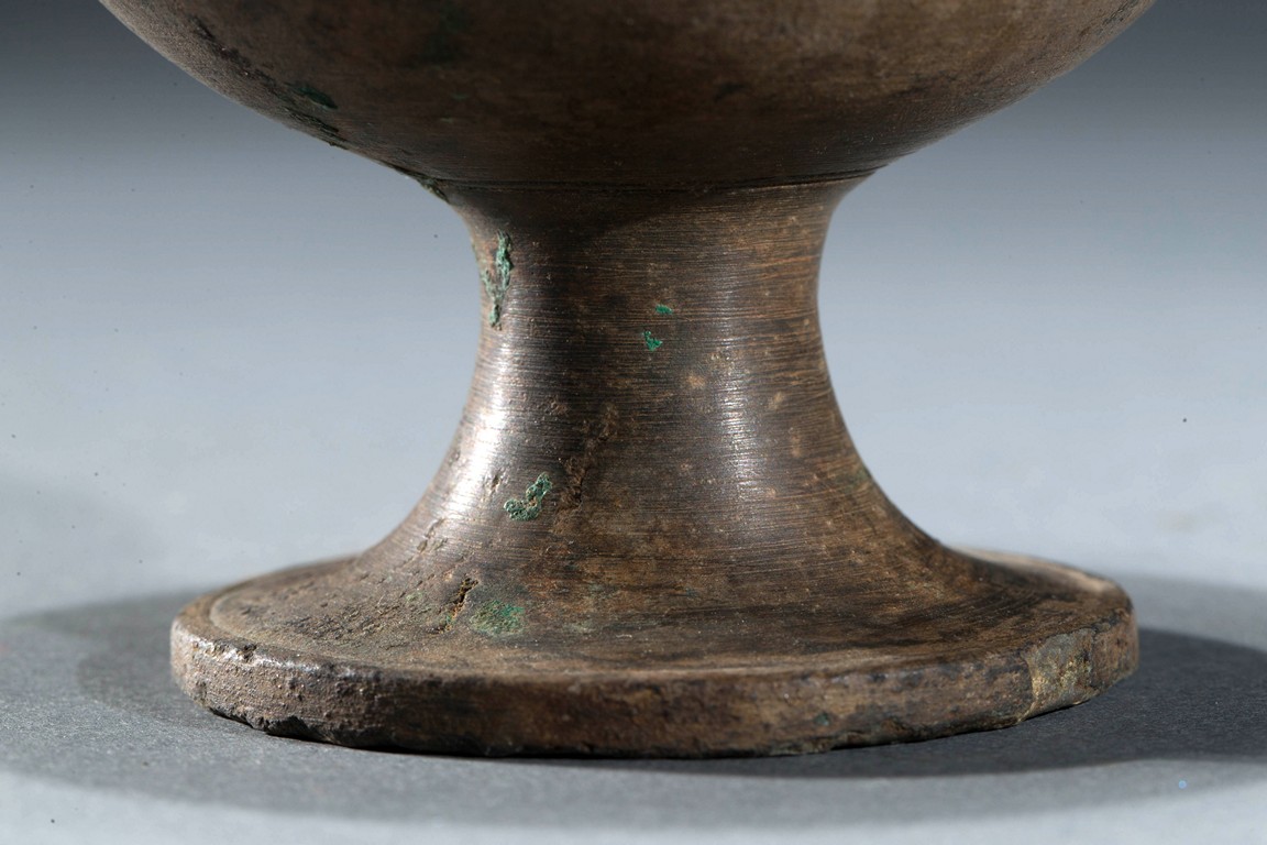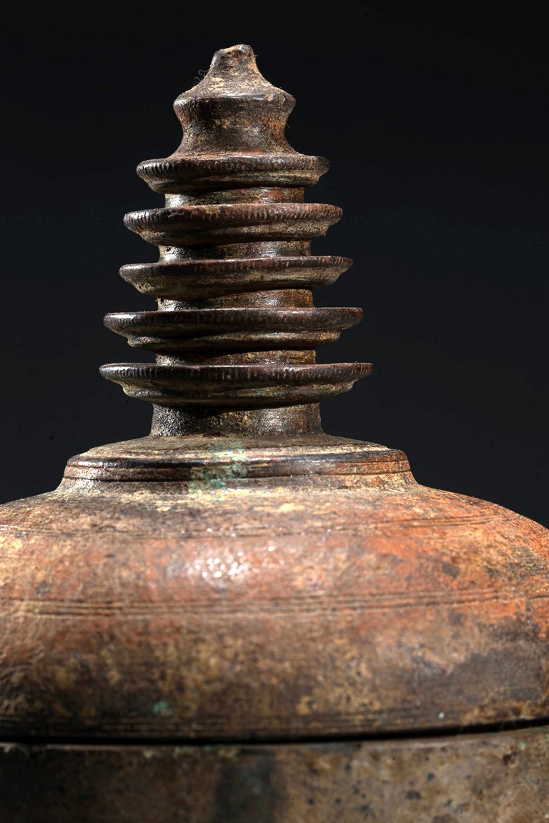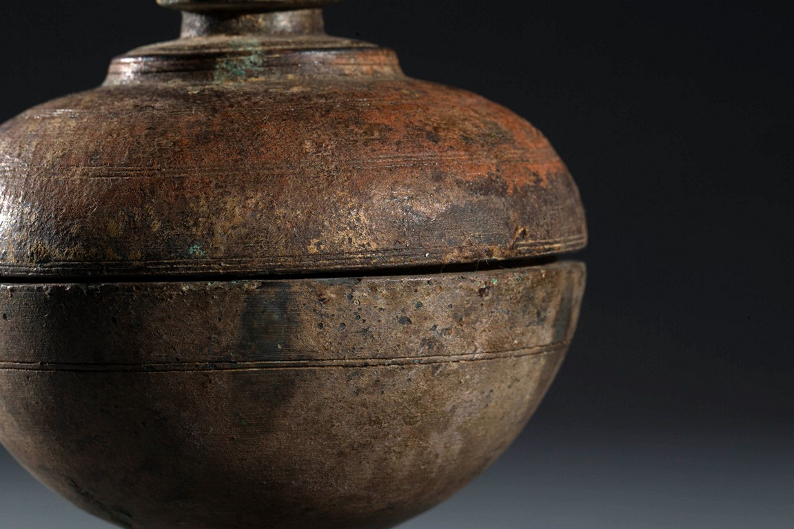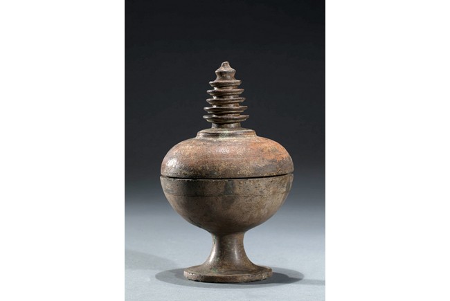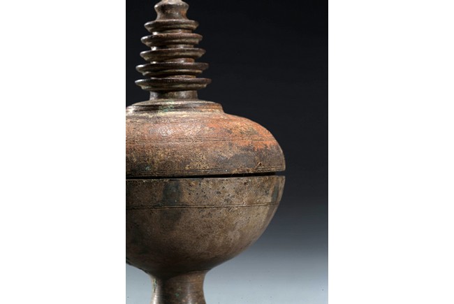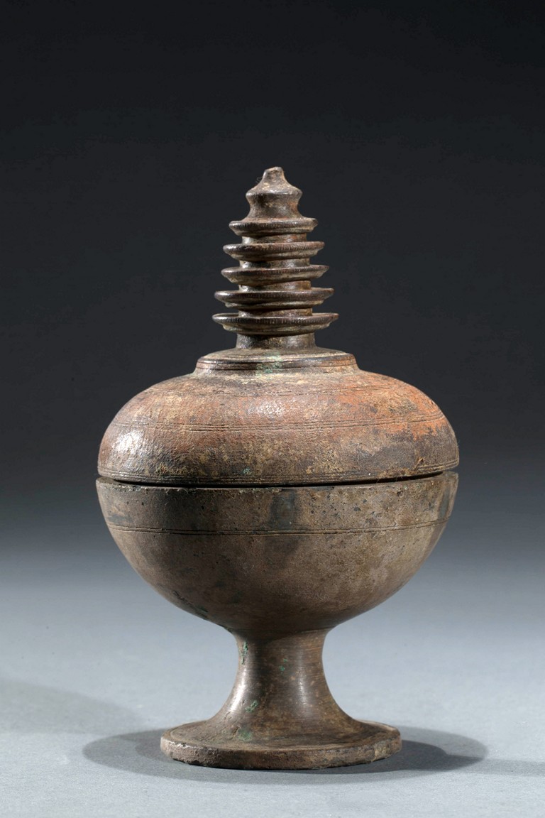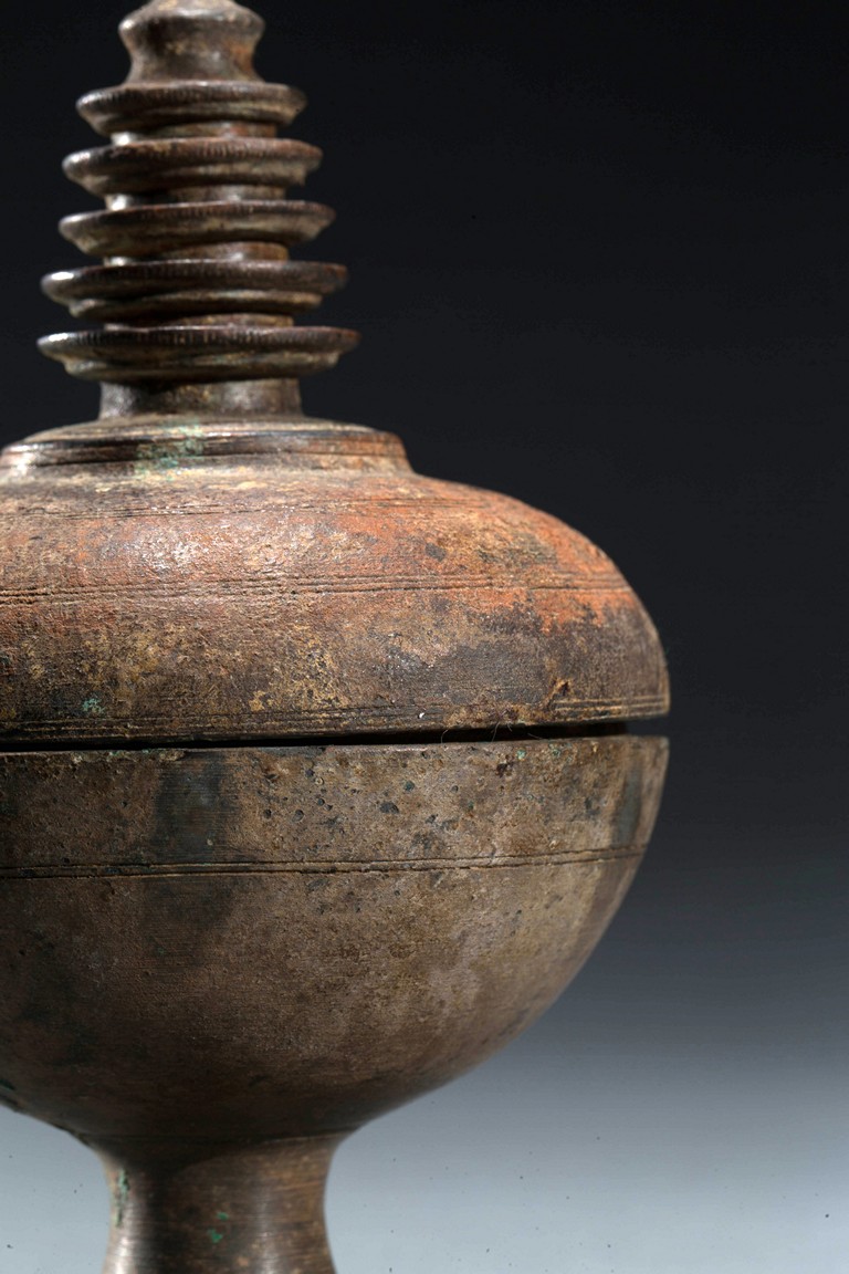 The rounded vessel raised on a spreading pedestal foot, with concentric lines decorated around the body, the cover surmounted with a pagoda-formed tall finial, with slight pale green patina. Tang Dynasty period.