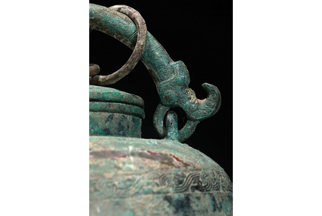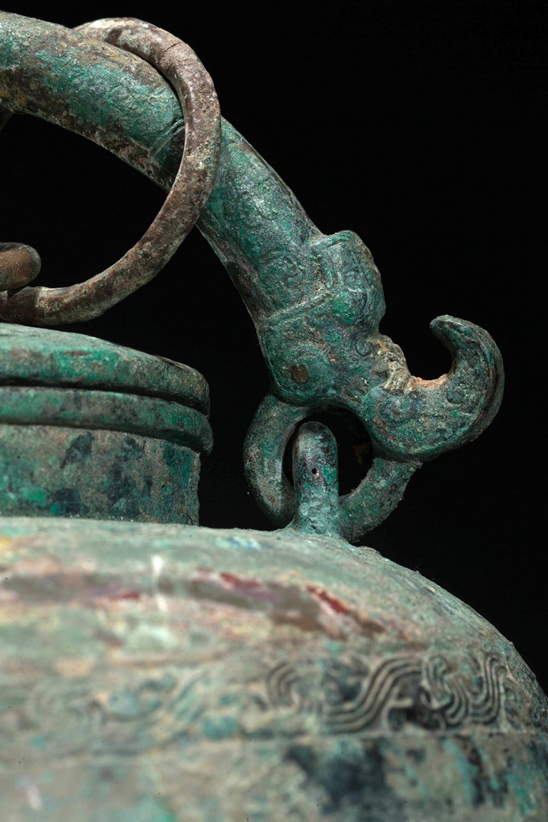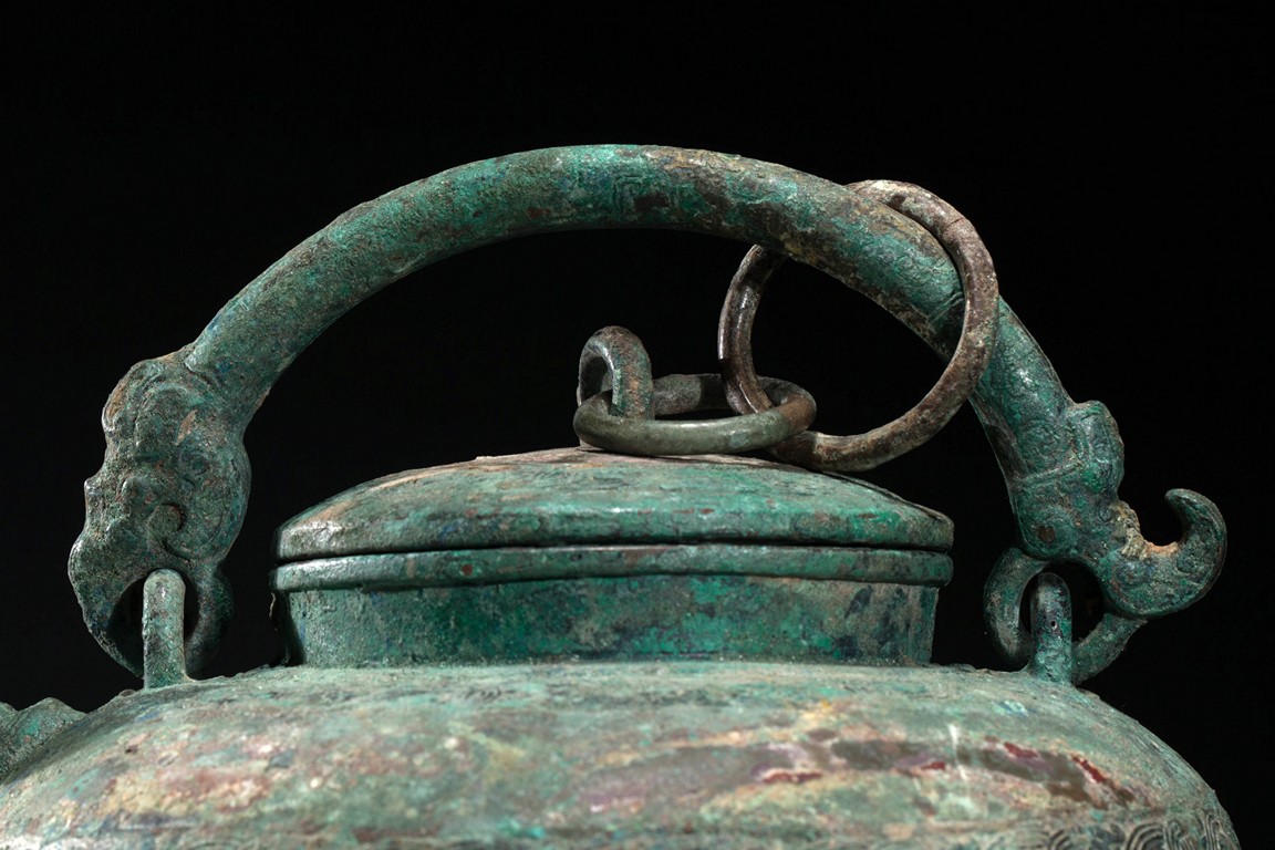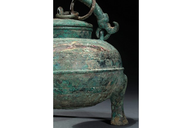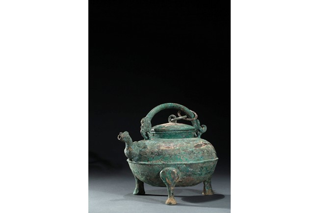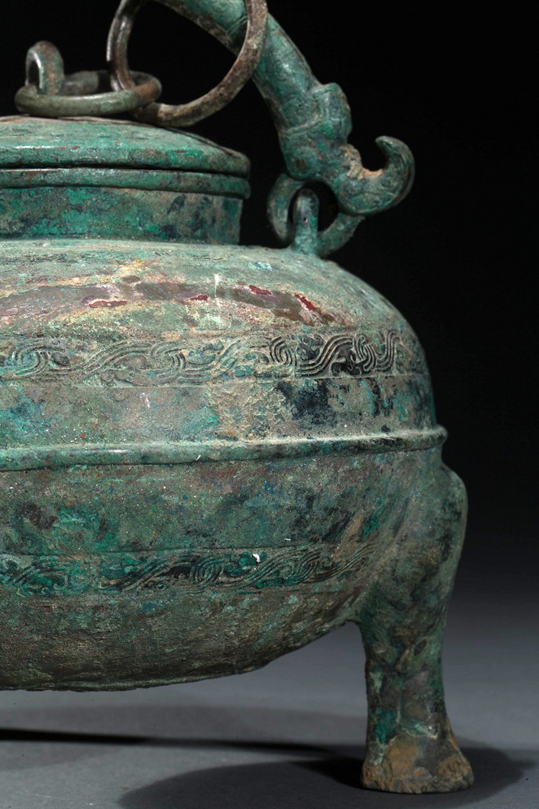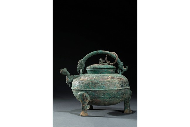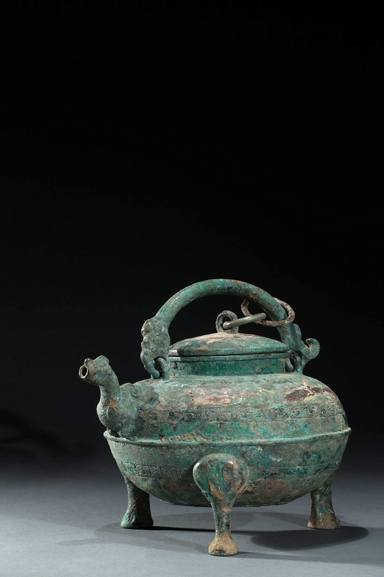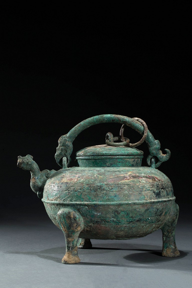 Of compressed globular form, supported on three beast-form feet, on one side of the shoulder set with the spout in the form of a mythical animal head, the circular hinged cover crisply cast with a pierced knob with circular loops hanging across the large arched kettle handle with beast-head-ends, green patina with encrustation. Warring State period or later.
