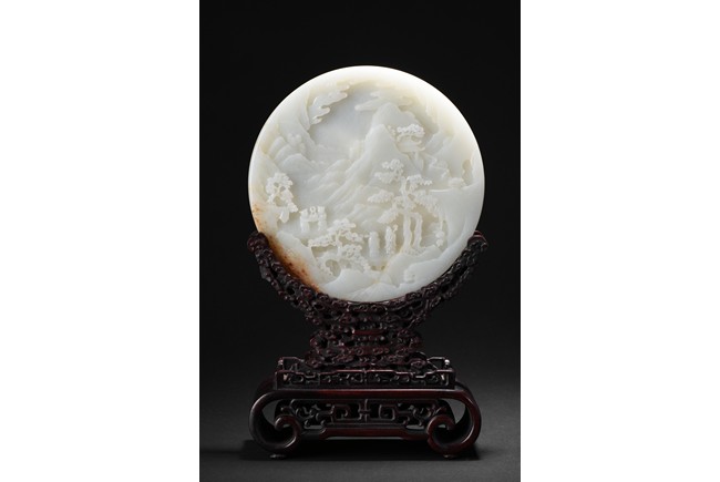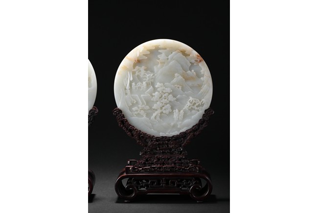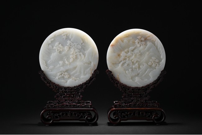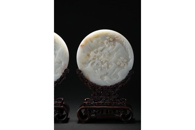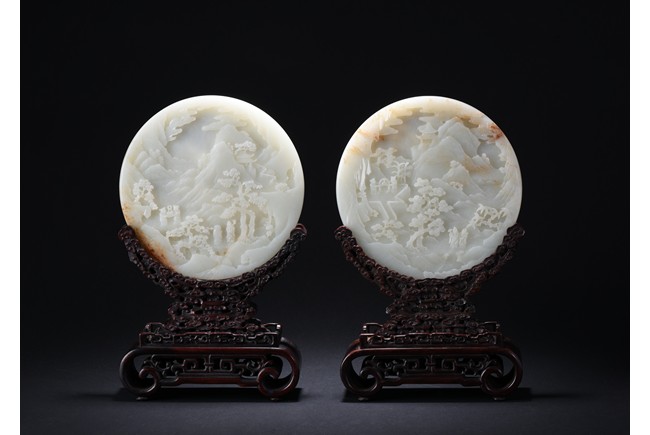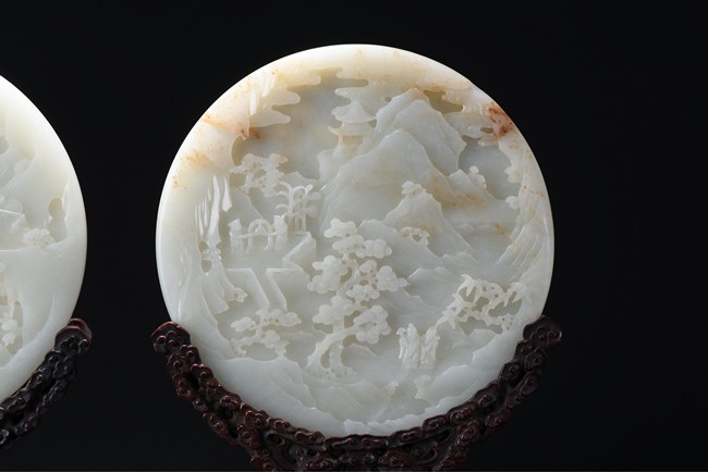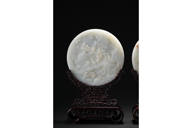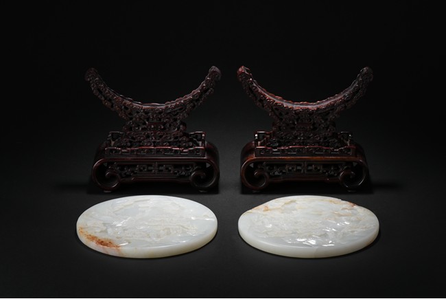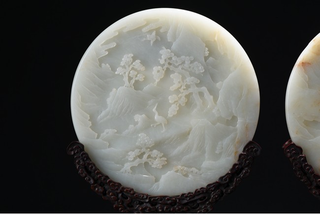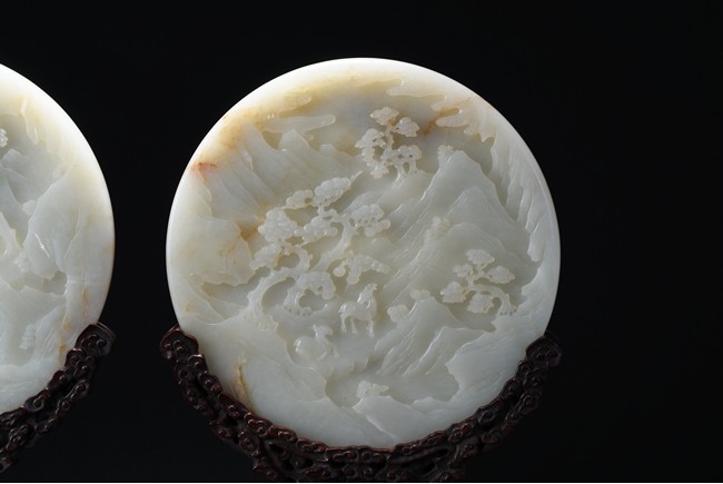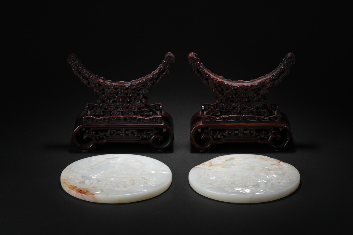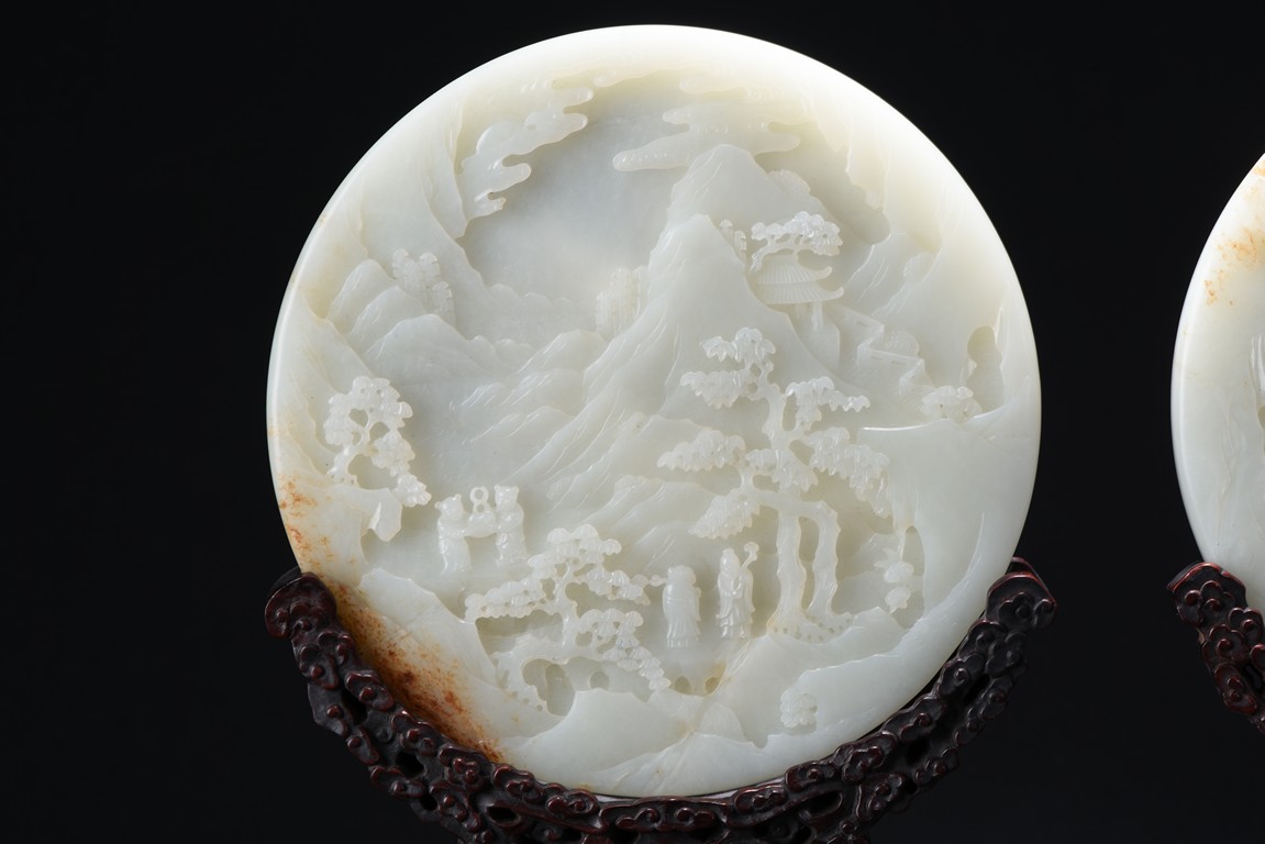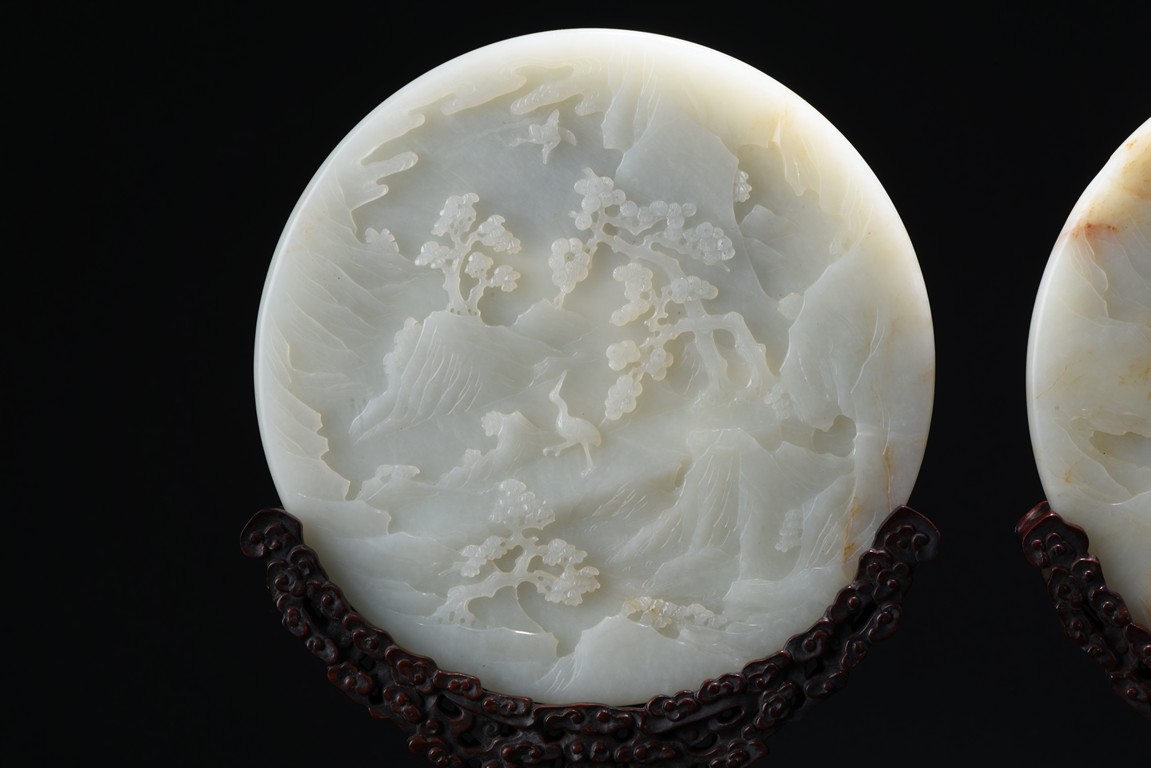 One of the white jade circular panels is exquisitely carved on one side with a mountainous landscape scene of two immortals standing conversing under a pine tree and two young attendants holding a basket, the reverse with a walking crane on a river bank; the other panel finely depicts a scene of two immortals holding lingzhi in a rocky mountainous setting with pine tree, wutong, and low clouds, with two young attendants playing musical stones on a raised stage, the far background with a pavilion on rocky cliff, the reverse with two deer at rest under wutong tree, the stone is of smooth translucent white tone with some slight russet skin. Qing Dynasty Qianlong period.