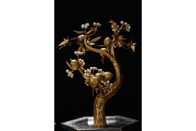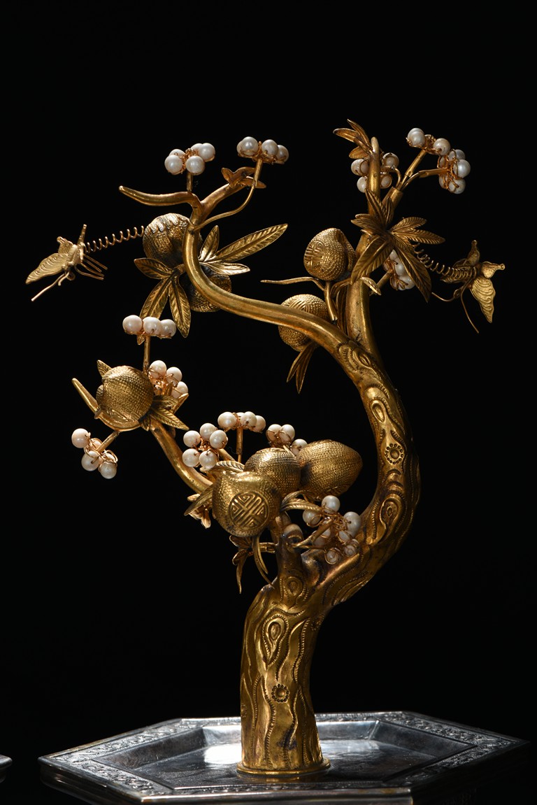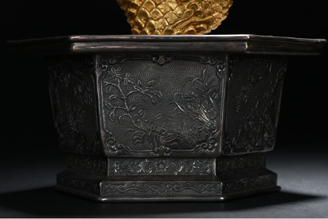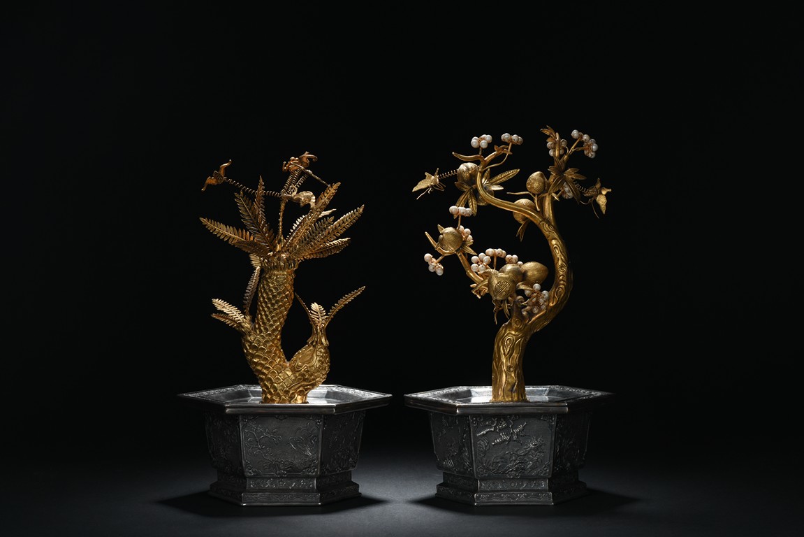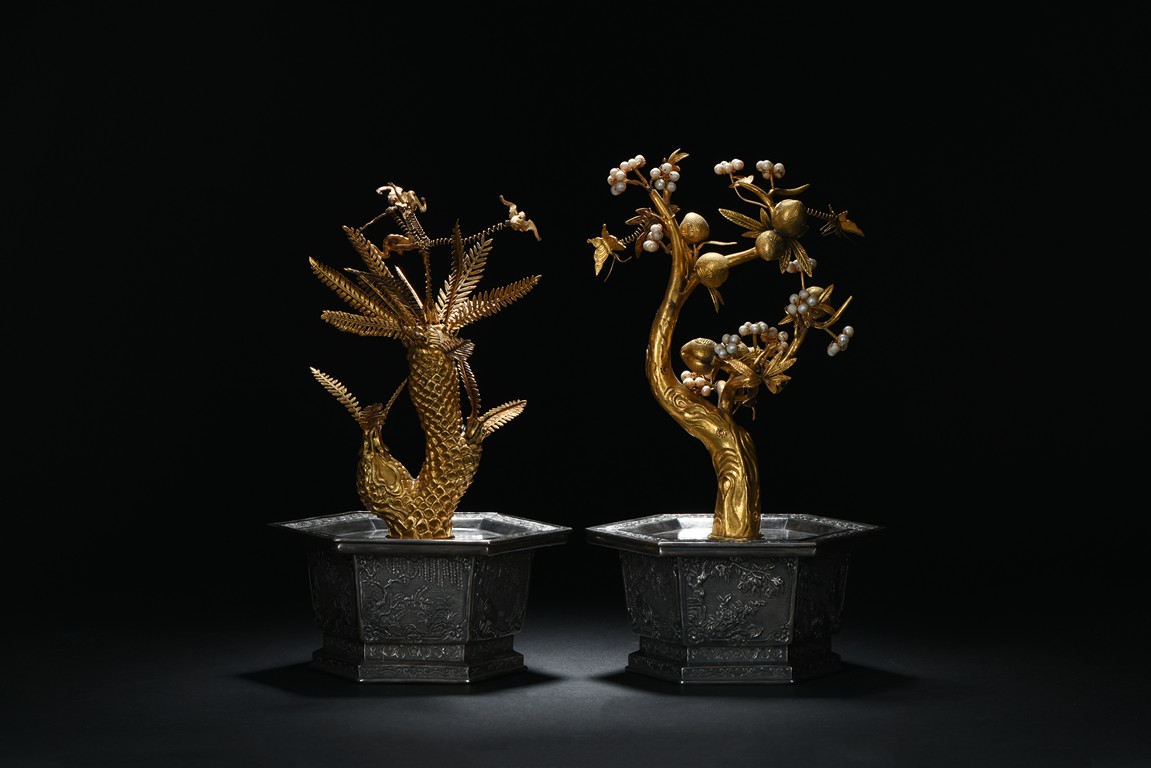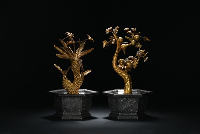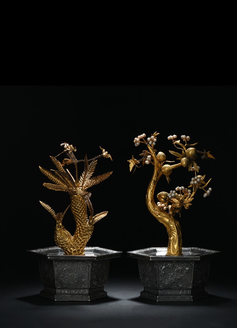 此對盆景以金桃樹及金鐵樹為造型, 六方銀盆以揲錘工藝繪製出各類花卉吉祥圖案, 盆中金樹嵌珍珠為花蕊, 工藝極為精緻, 獨具匠心, 為清代宮廷製盆景之精品, 罕見非常。