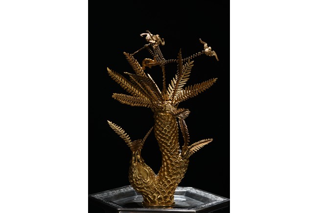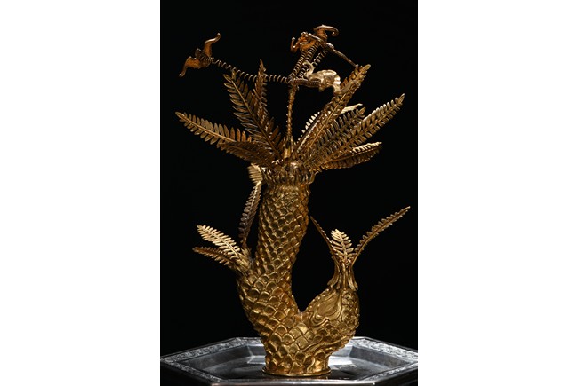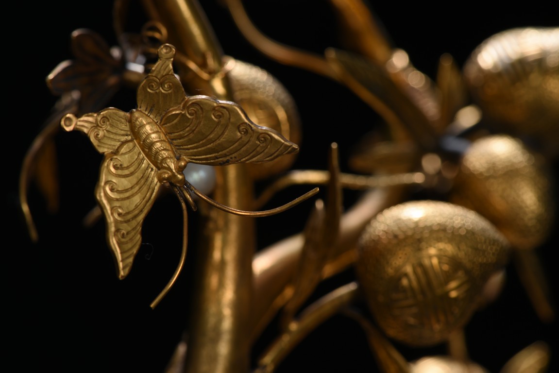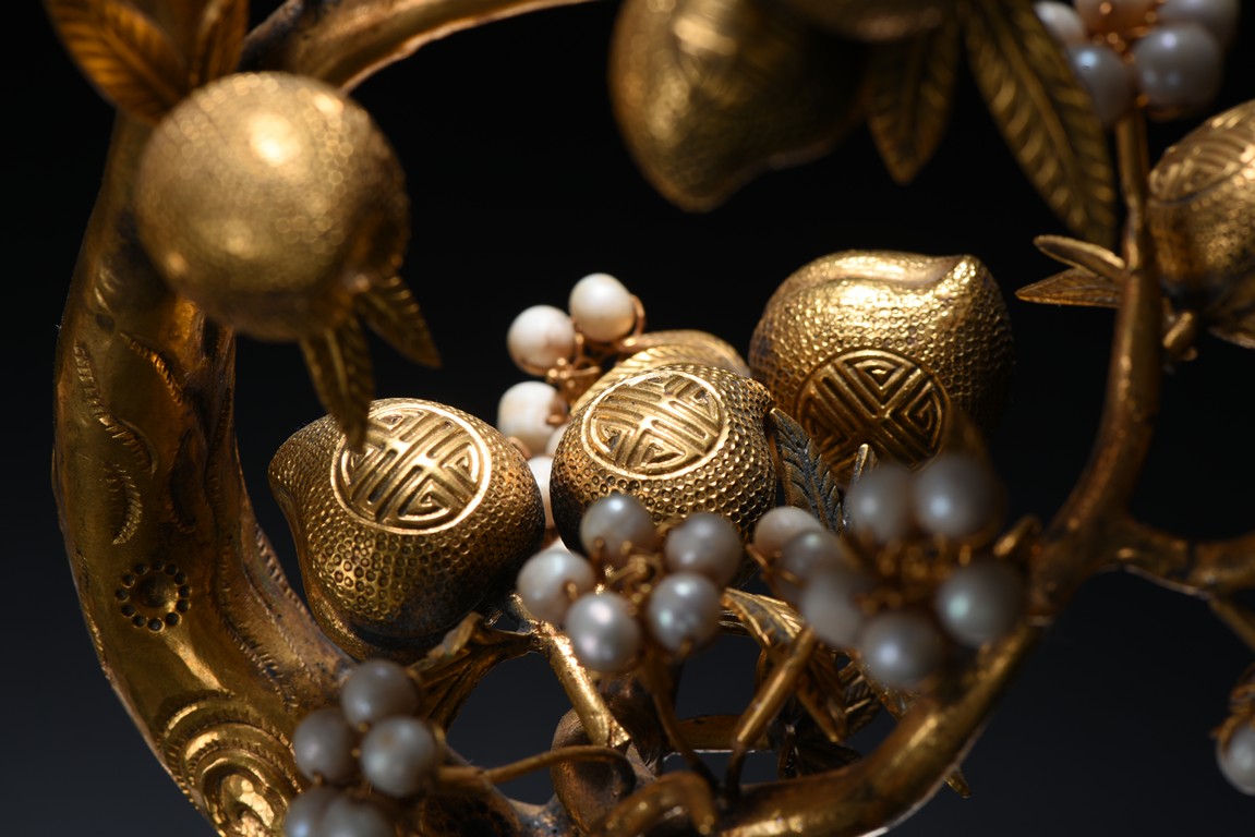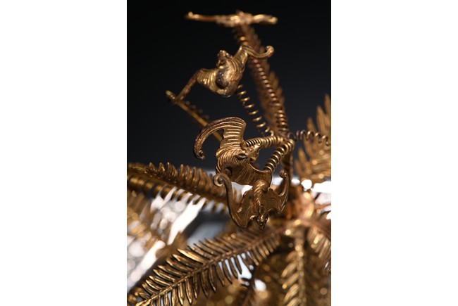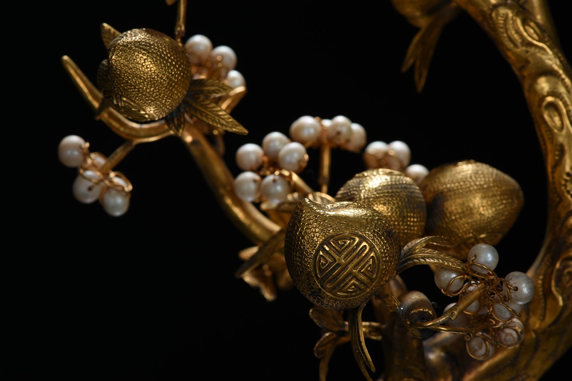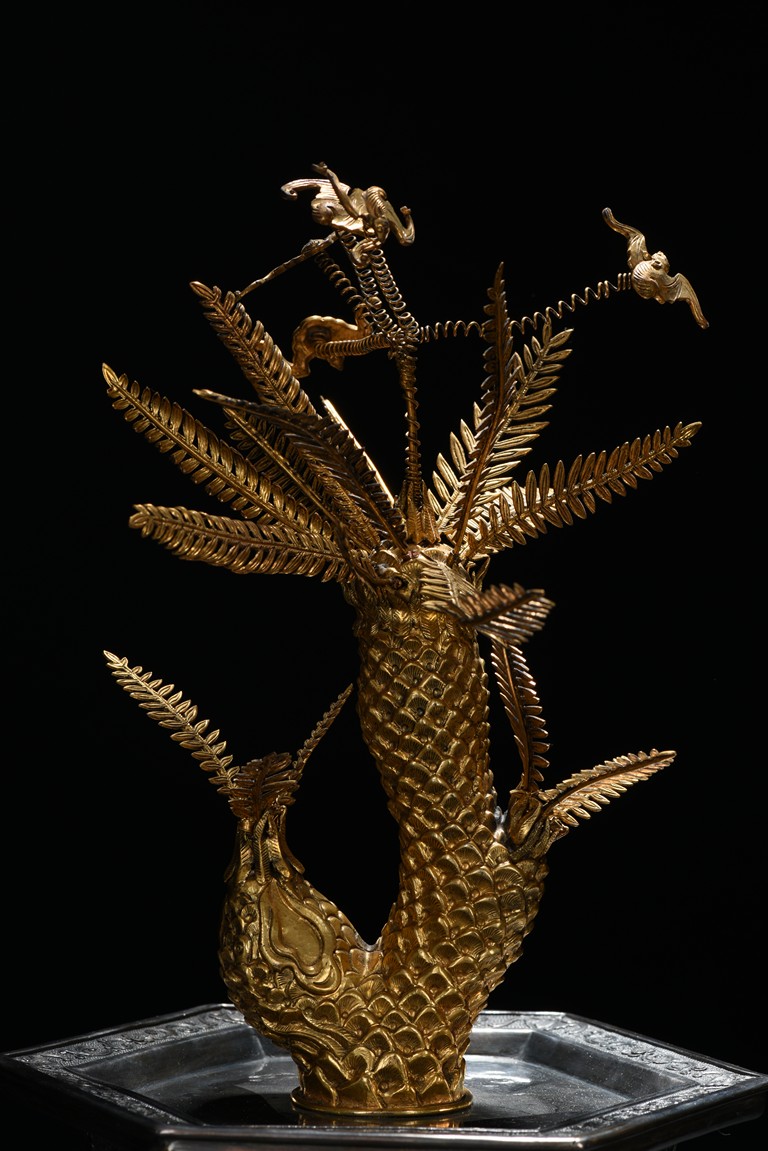 此對盆景以金桃樹及金鐵樹為造型, 六方銀盆以揲錘工藝繪製出各類花卉吉祥圖案, 盆中金樹嵌珍珠為花蕊, 工藝極為精緻, 獨具匠心, 為清代宮廷製盆景之精品, 罕見非常。