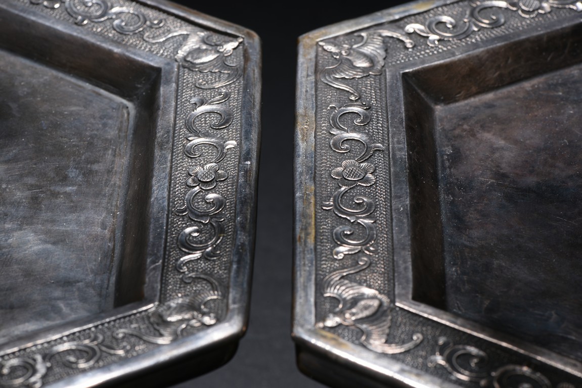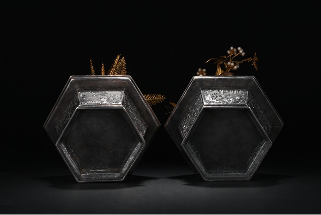 Each silver hexagonal jardiniere carved around the body with bunches of flowers issuing from tree brush in relief above bands of archaistic scrolled flowers and ruyi pattern, one is moulded into a bunch of gilt or gold longevity peach tree form decorated each peach with medallion and the flower bud in rounded gem, the other is moulded into the form of cycas trunks in gilt-bronze decorated with carved bats flying above the long exuberant leaves. Qing Dynasty period.