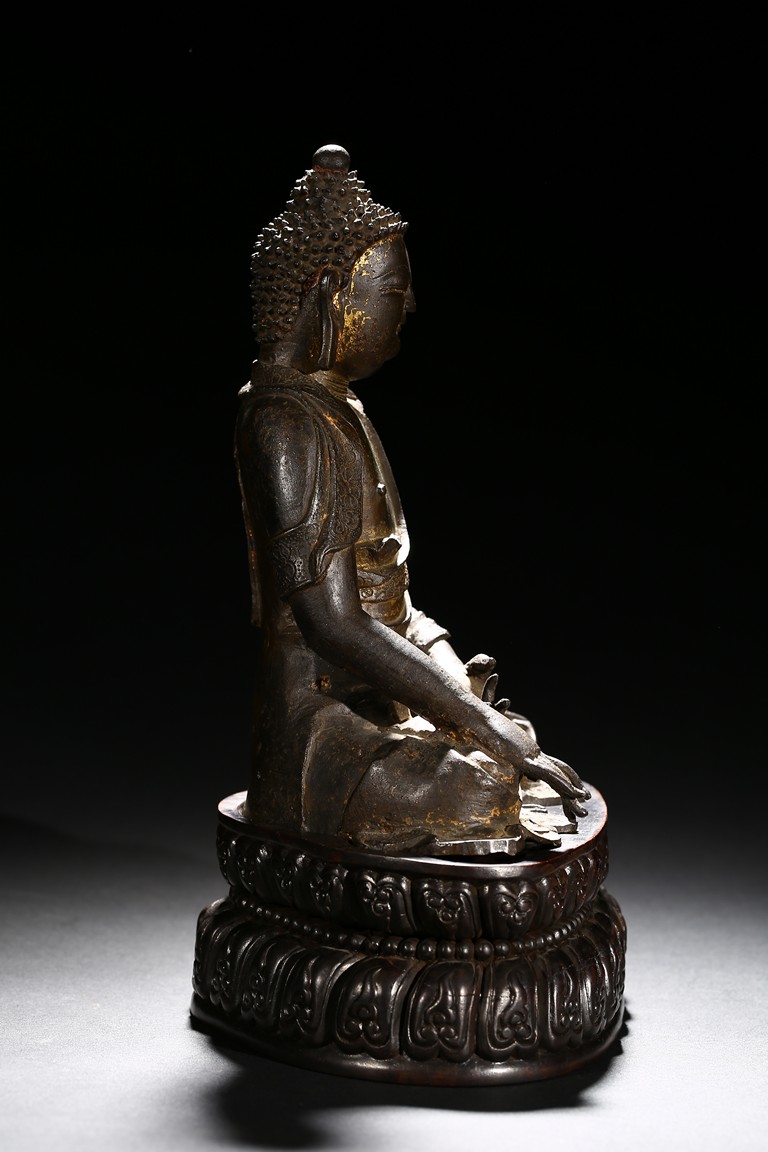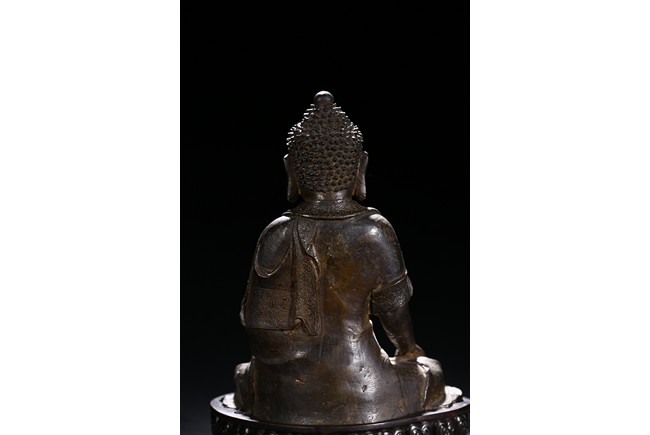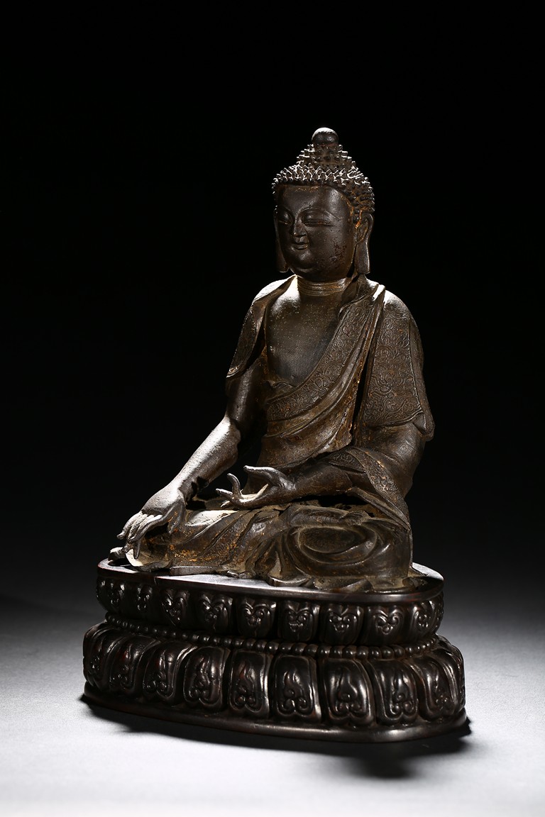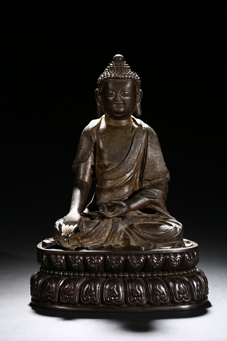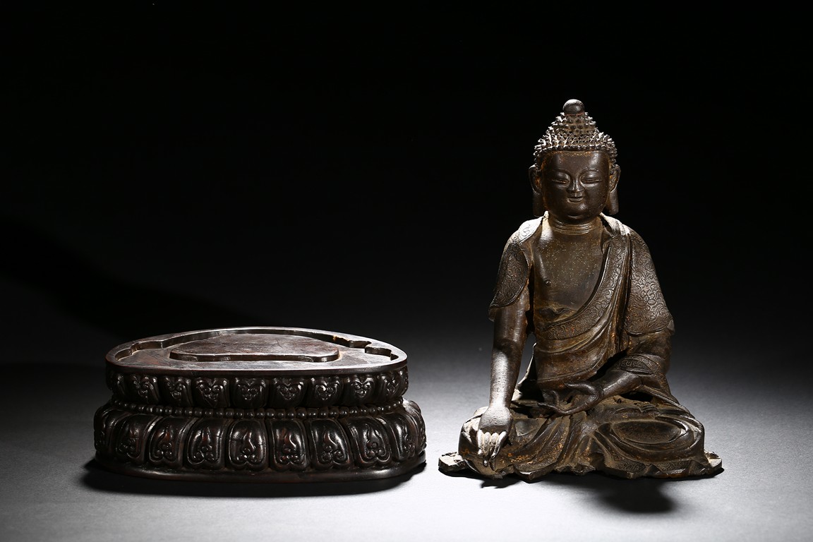 Seated in dhyanasana with his hands in mudra, the finely cast figure with flowing robes incised with elaborate floral scroll pattern, over a well-modelled torso leaving the chest and part arm bare, his face with contemplative expression, arched eyebrows in relief, delicately-lidded eyes downcast in meditation, and slightly-smiling bow-shaped mouth, his hair arranged in rows of spiral curls, the domed usnisa surmounted by a lotus-bud cintamani, all supported on a rosewood carved double lotus base. Yuan Dynasty period.