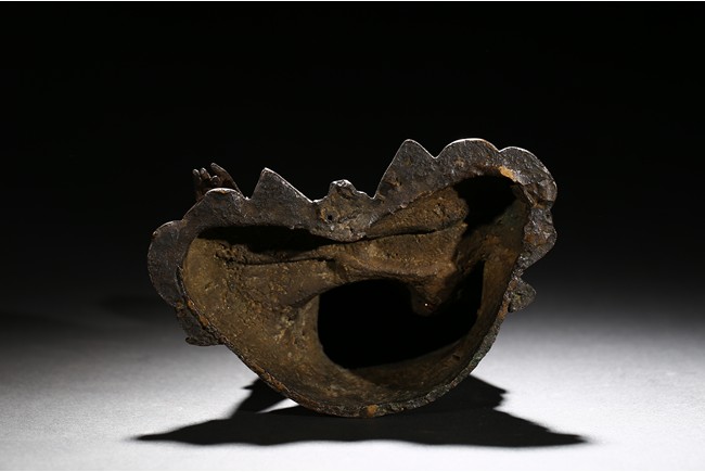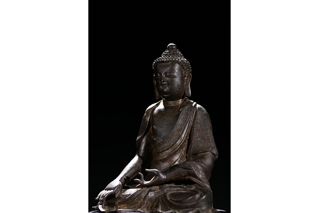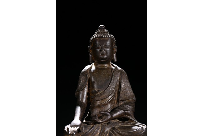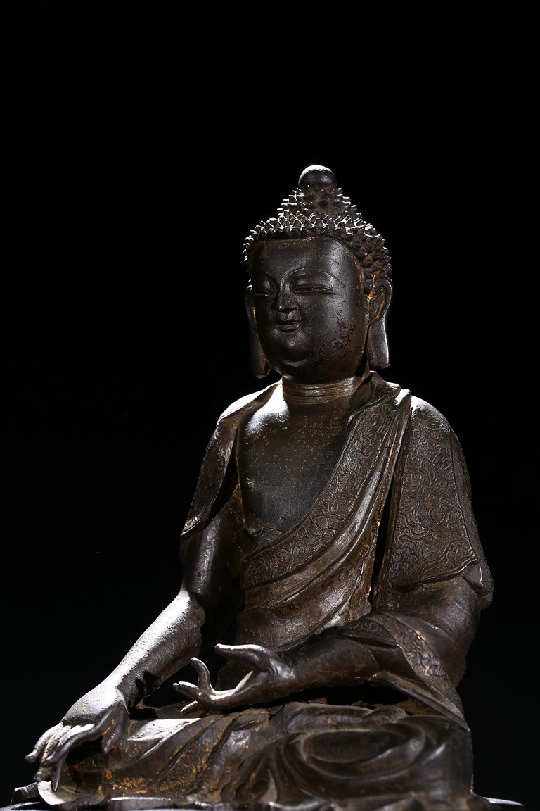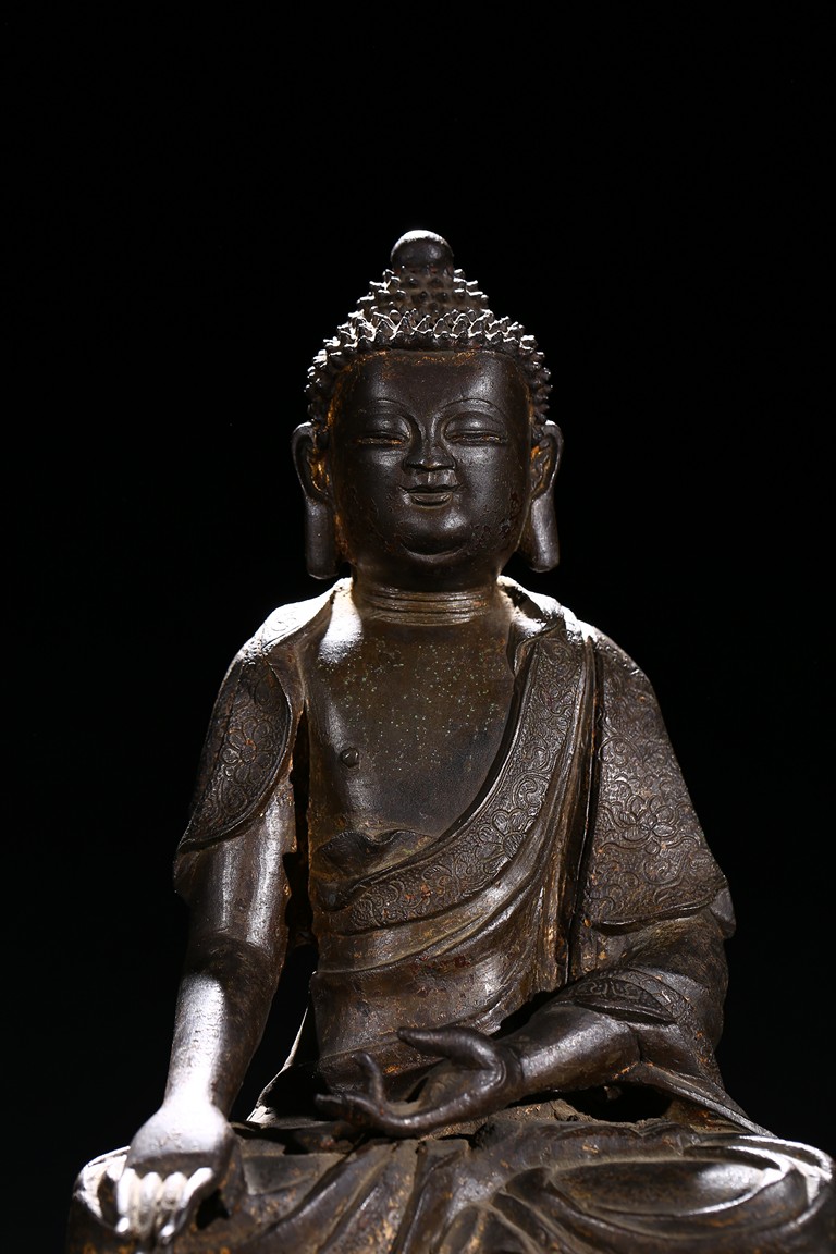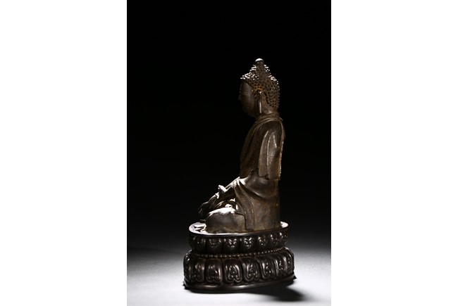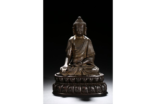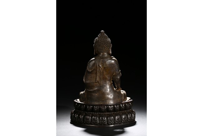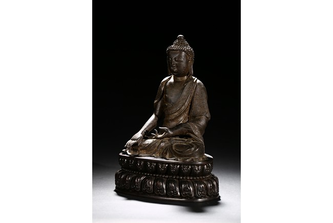 Seated in dhyanasana with his hands in mudra, the finely cast figure with flowing robes incised with elaborate floral scroll pattern, over a well-modelled torso leaving the chest and part arm bare, his face with contemplative expression, arched eyebrows in relief, delicately-lidded eyes downcast in meditation, and slightly-smiling bow-shaped mouth, his hair arranged in rows of spiral curls, the domed usnisa surmounted by a lotus-bud cintamani, all supported on a rosewood carved double lotus base. Yuan Dynasty period.